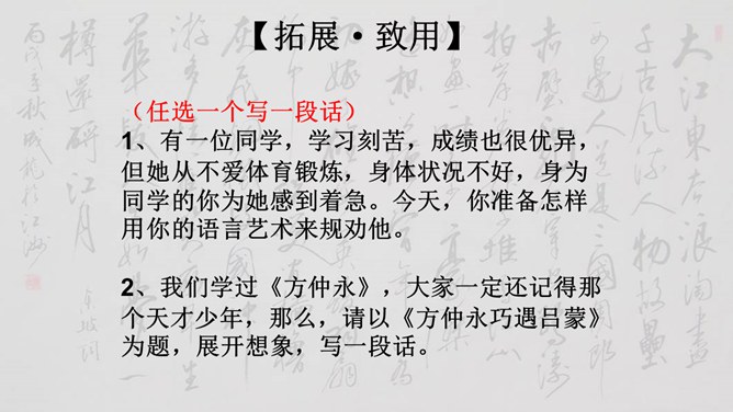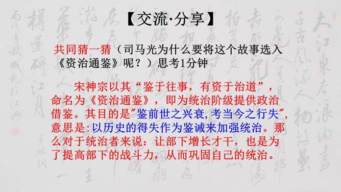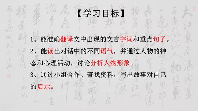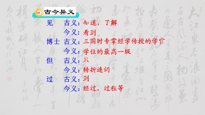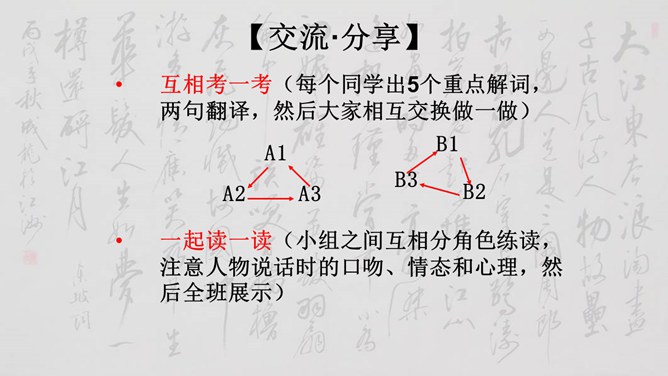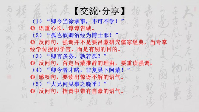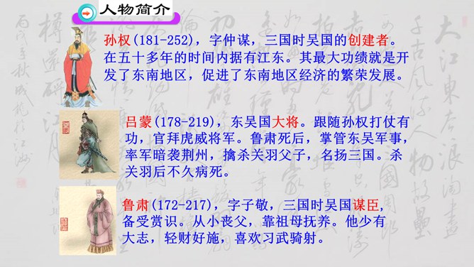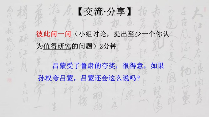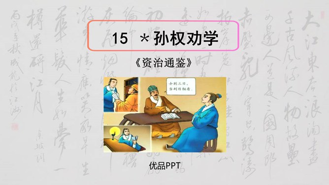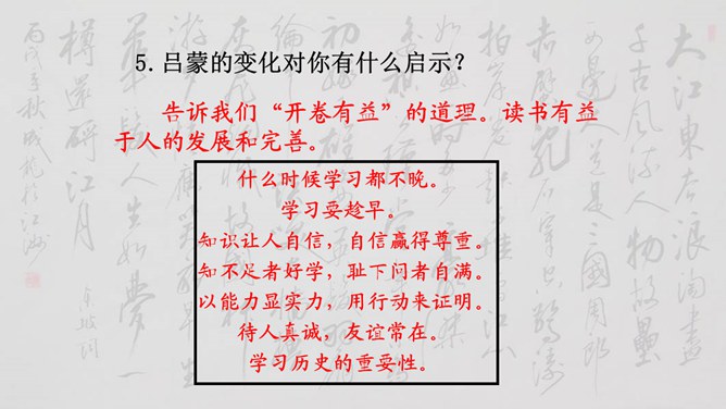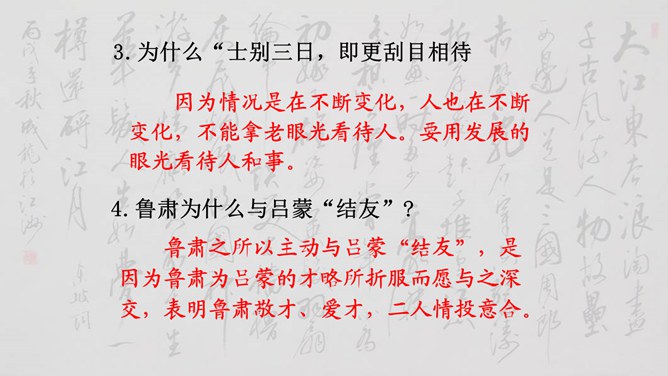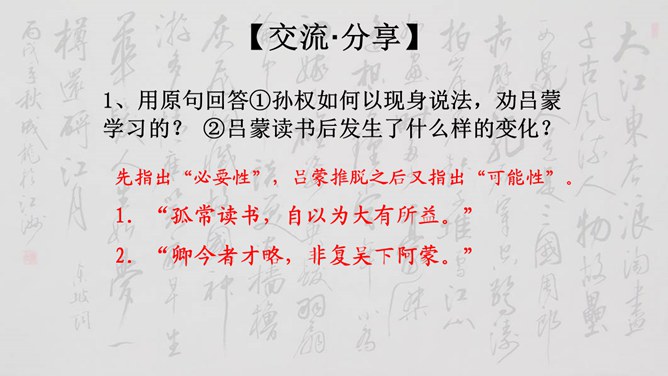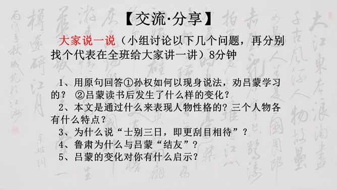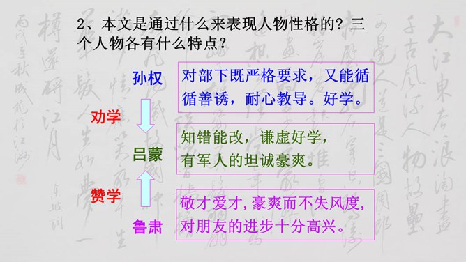 大家说一说(小组讨论以下几个问题,再分别找个代表在全班给大家讲一讲)1、用原句回答①孙权如何以现身说法,劝吕蒙学习的? ②吕蒙读书后发生了什么样的变化? 2、本文是通过什么来表现人物性格的? 三个人物各有什么特点?3、为什么说“士别三日,即更刮目相待”? 4、鲁肃为什么与吕蒙“结友”? 5、吕蒙的变化对你有什么启示?用原句回答①孙权如何以现身说法,劝吕蒙学习的? ②吕蒙读书后发生了什么样的变化?所属专题:孙权劝学ppt。