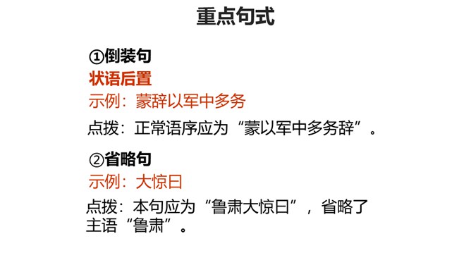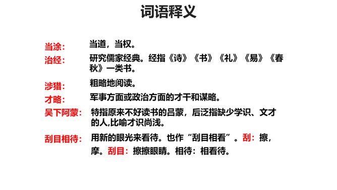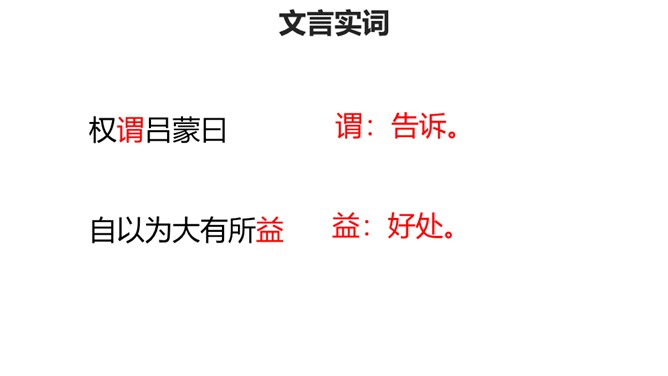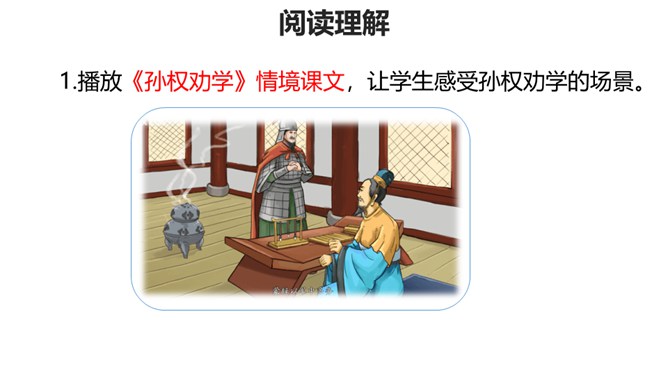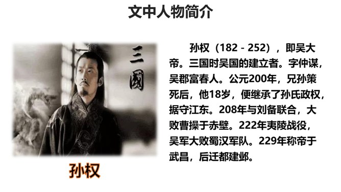 本文注重用对话来表现人物。对话生动传神、言简意丰、富于情趣。仅聊聊数语,就使人感受到孙权、吕蒙、鲁肃三人说话时的神态、口吻和心理。孙权劝学,先一语破的,向吕蒙指出“学”的必要性,即因其“当涂掌事”的重要身份而“不可不学”;继而现身说法,指出“学”的可能性。使吕蒙无可推辞,“乃始就学”。从孙权的话中,既可以看出他善于劝说,又可以感到他对吕蒙的亲近、关心、期望,而不失人主的身份。 通过本课的学习,我们应该认识到我们必须不断地学习,才能挺立在时代的潮头。所属专题:孙权劝学ppt。