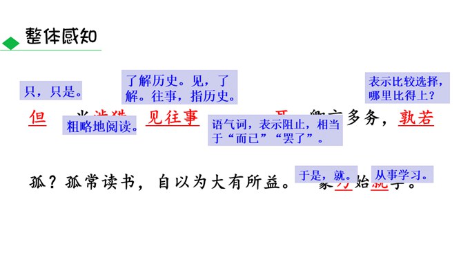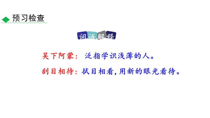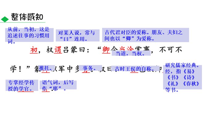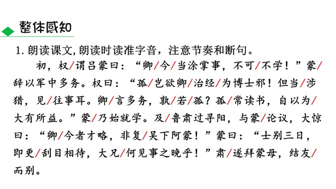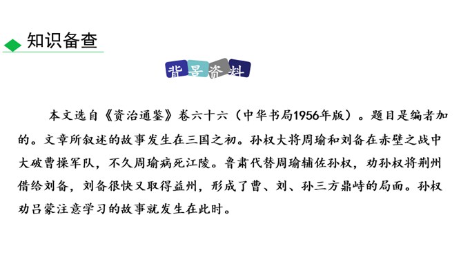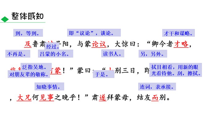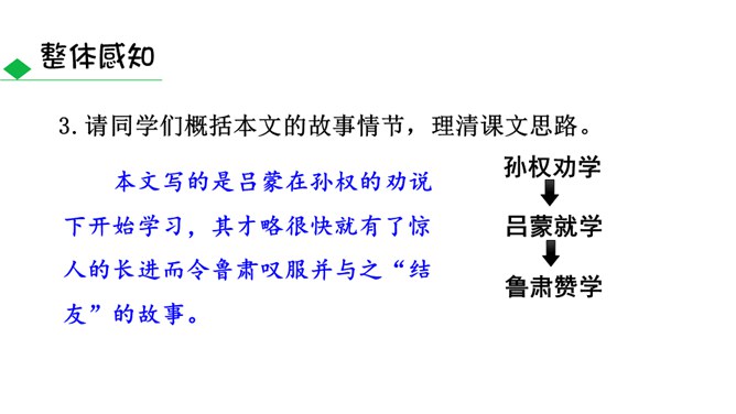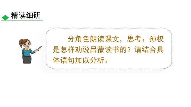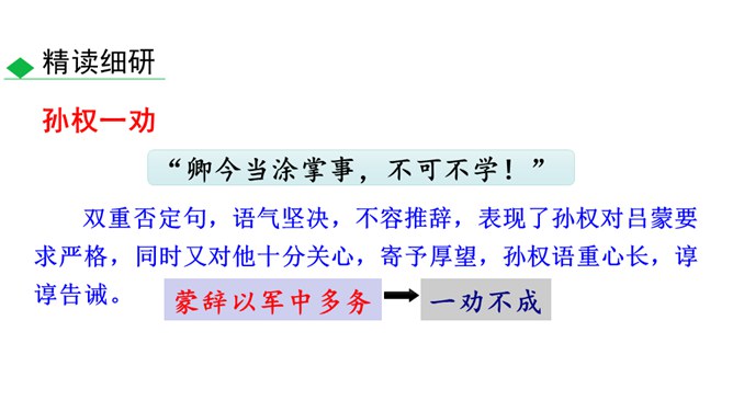 通过鲁肃对吕蒙的赞叹,侧面表现出吕蒙的学识有了进步。“大惊”及感叹语气的句子可见鲁肃当时十分惊讶的神态,吕蒙的变化判若两人,使鲁肃既吃惊、又情不自禁地发出赞叹。全文只写“孙权劝学”和鲁肃“与蒙论议”两个片段。写孙权劝学,着重以孙权的劝说之言来表现他的善劝,而略写吕蒙的答语和反应;写鲁肃“与蒙论议”,着重写二人一唱一和,互相打趣的对话,略写二人“论议”的内容,并仅以“肃遂拜蒙母,结友而别”一句作结。此外,人物的语言也非常简洁,极富表现力,毫无冗繁之处。所属专题:孙权劝学ppt。
