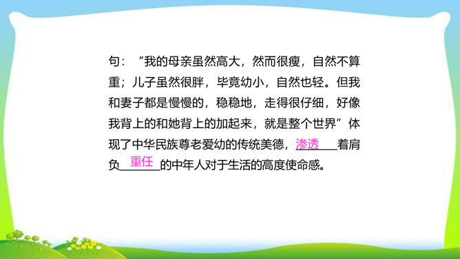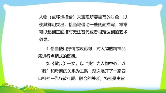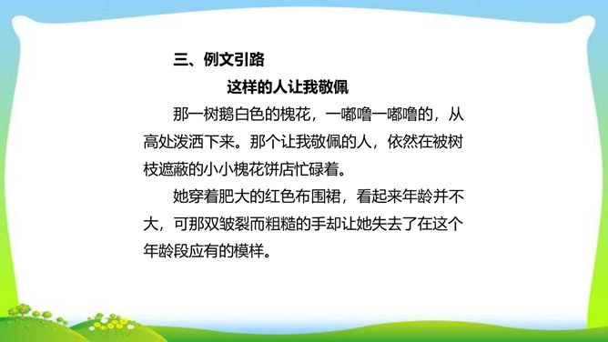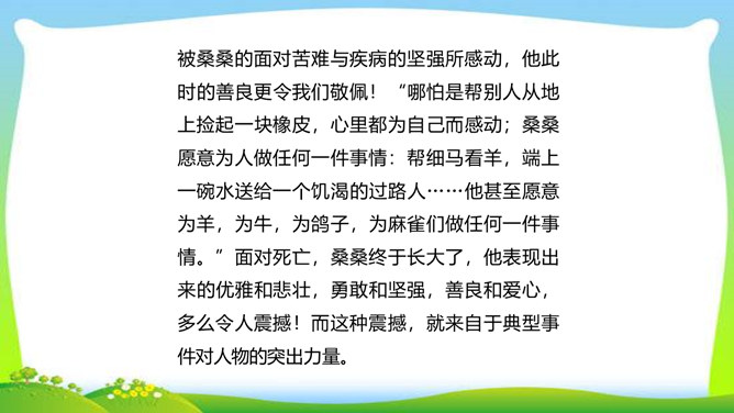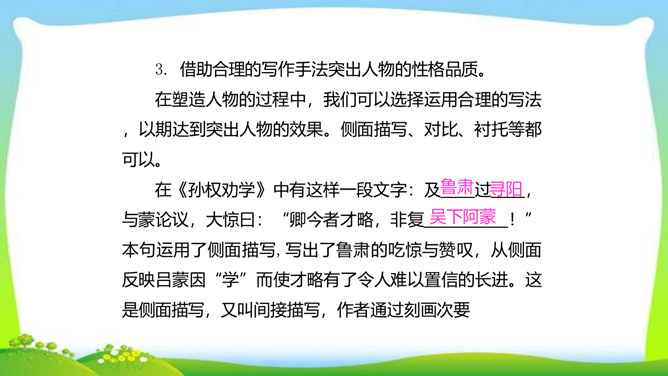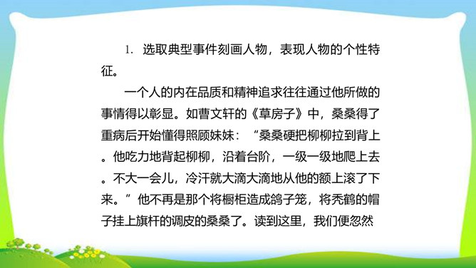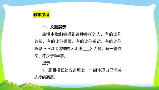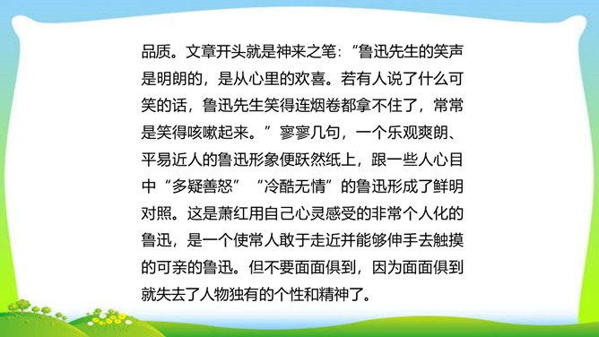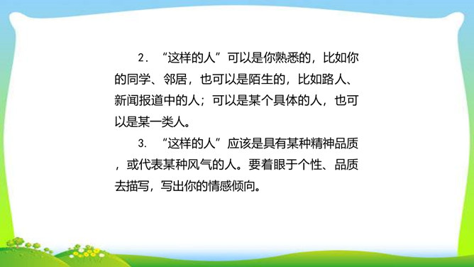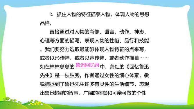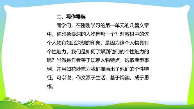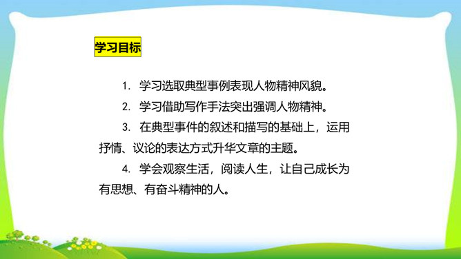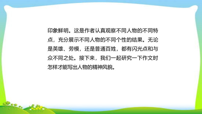 世界上没有完全相同的两片树叶,每个人都是独一无二的。所以,我们无论写谁,即使他是时代最伟大的人物,也要在他身上找到不一般的,哪怕乍看起来是奇怪的特征,当读者窥见这些特征时,也会迫使他们内心发出微笑。本单元的四篇课文就让我们感受到邓稼先、闻一多、鲁迅、吕蒙等杰出人物的非凡气质,因为独具个性,所以印象鲜明。这是作者认真观察不同人物的不同特点,充分展示不同人物的不同个性的结果。无论是英雄、劳模,还是普通百姓,都有闪光点和与众不同之处。接下来,我们一起研究一下作文时怎样才能写出人物的精神风貌。所属专题:写出人物的精神ppt。