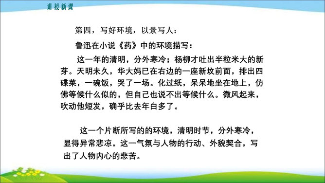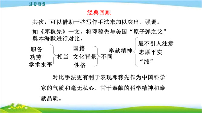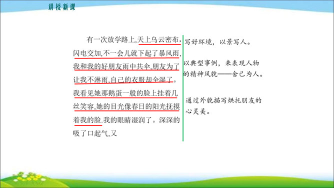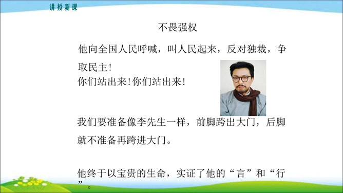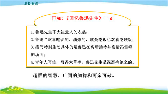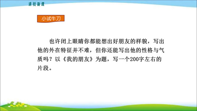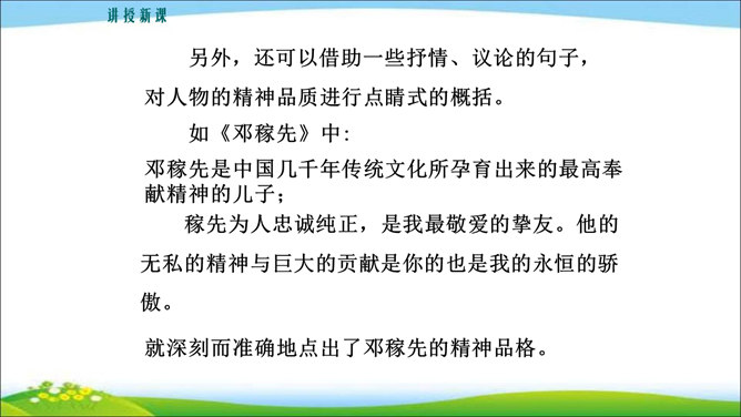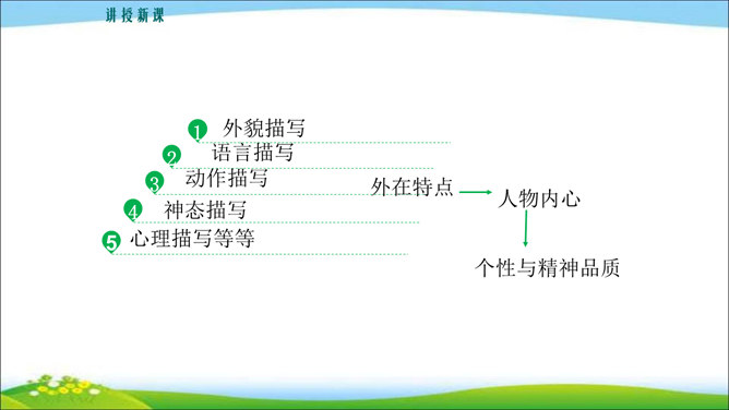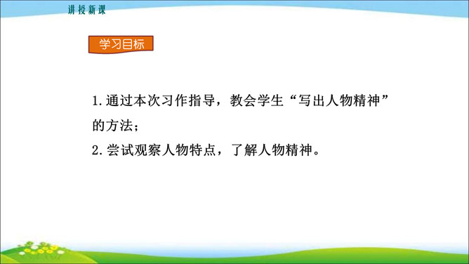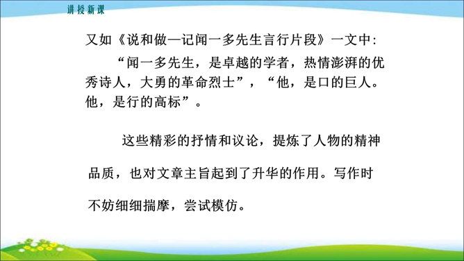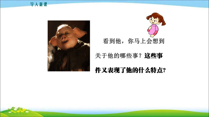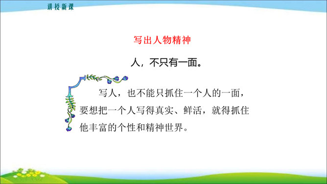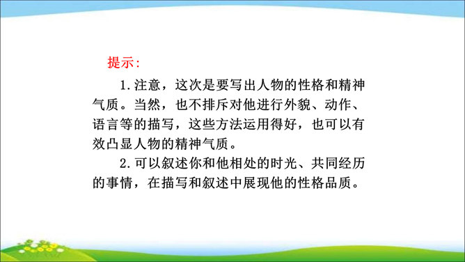 看到他,你马上会想到关于他的哪些事?这些事件又表现了他的什么特点? 写人,也不能只抓住一个人的一面,要想把一个人写得真实、鲜活,就得抓住他丰富的个性和精神世界。也许闭上眼睛你都能想出好朋友的样貌,写出他的外在特征并不难,但你还能写出他的性格与气质吗?1.注意,这次是要写出人物的性格和精神气质。当然,也不排斥对他进行外貌、动作、语言等的描写,这些方法运用得好,也可以有效凸显人物的精神气质。2.可以叙述你和他相处的时光、共同经历的事情,在描写和叙述中展现他的性格品质。所属专题:写出人物的精神ppt。