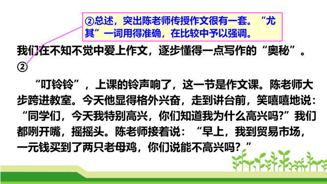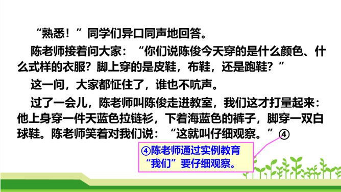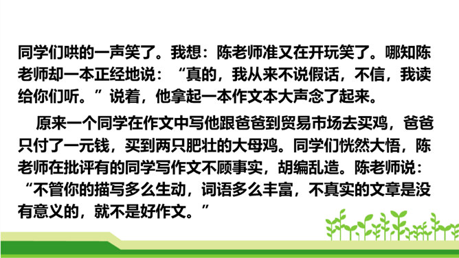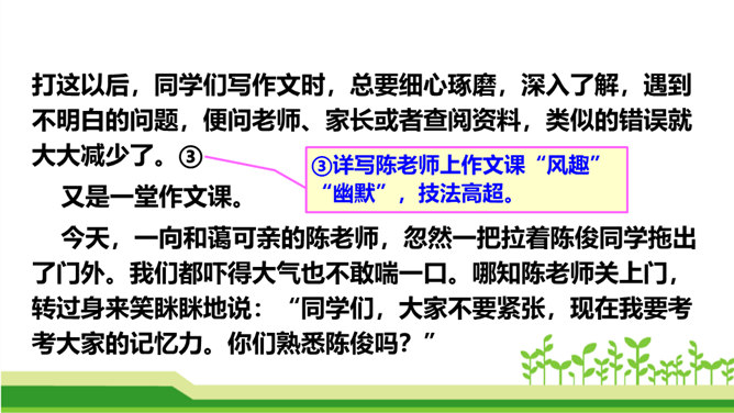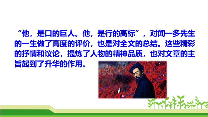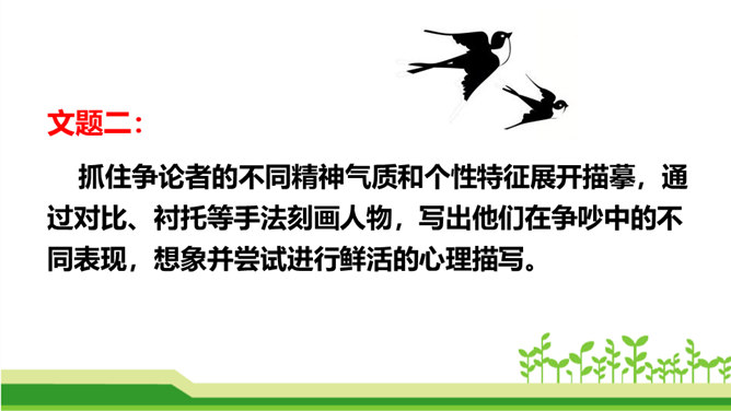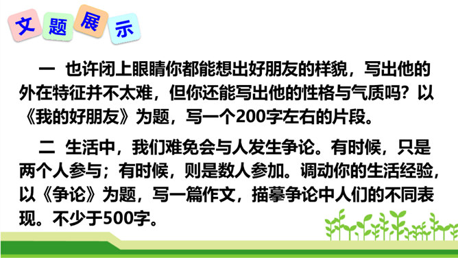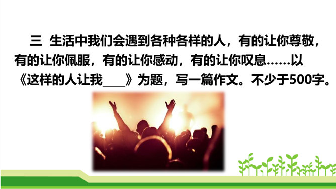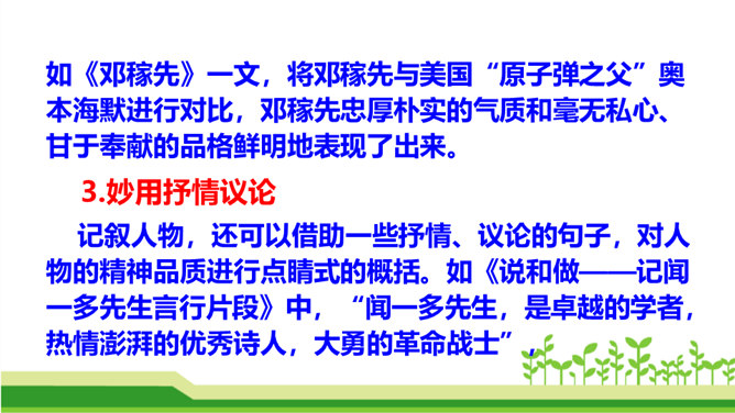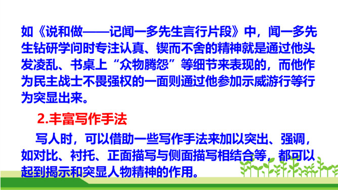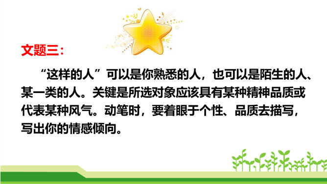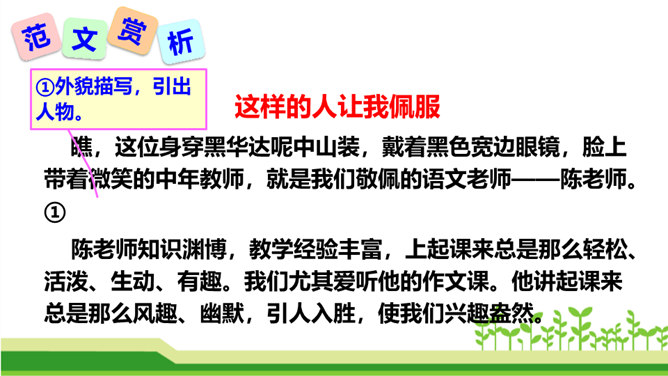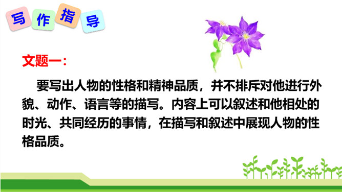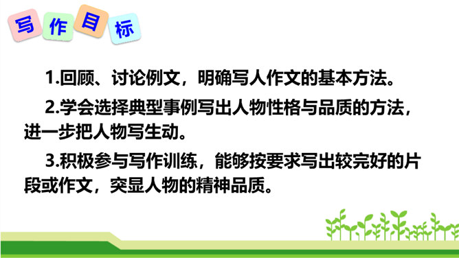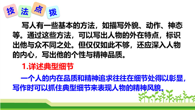 1.回顾、讨论例文,明确写人作文的基本方法。2.学会选择典型事例写出人物性格与品质的方法,进一步把人物写生动。3.积极参与写作训练,能够按要求写出较完好的片段或作文,突显人物的精神品质。写人有一些基本的方法,如描写外貌、动作、神态等。通过这些方法,可以写出人物的外在特点,标识出他与众不同之处。但仅仅如此不够,还应深入人物的内心,写出他的个性与精神品质。一个人的内在品质和精神追求往往在细节处得以彰显,写作时可以抓住典型细节来表现人物的精神风貌。所属专题:写出人物的精神ppt。