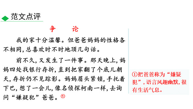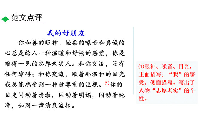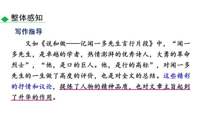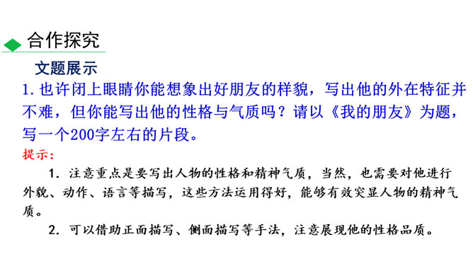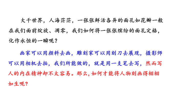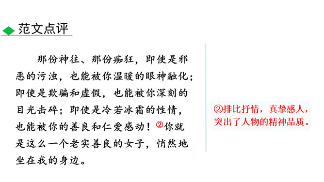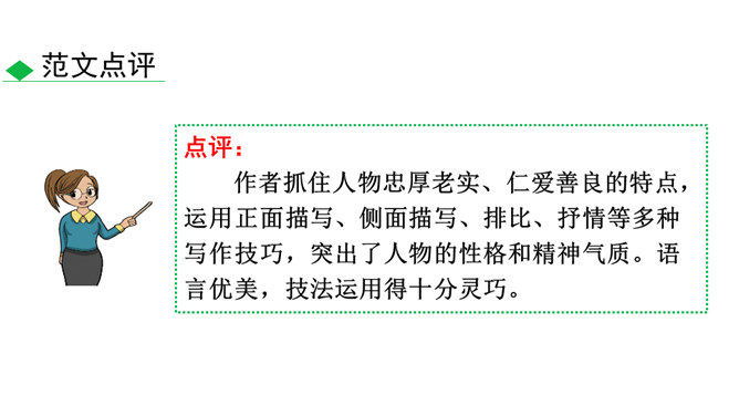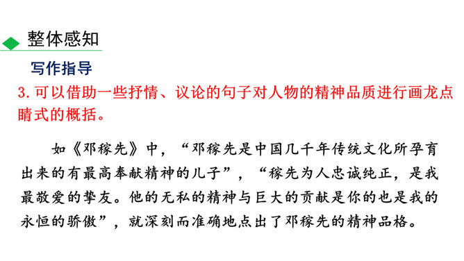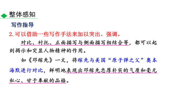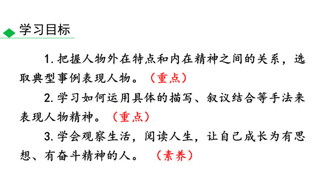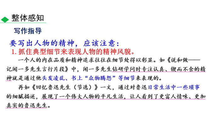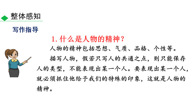 人物的精神包括思想、气质、品格、个性等。描写人物,假若只写人的共通之点,则只能保存人的类型,不能表现出某一个人。要表现出某一个人,就必须抓住他给予我们的特殊的印象,这就是人物的精神。要写出人物的精神,应该注意:1.抓住典型细节来表现人物的精神风貌。2.可以借助一些写作手法来加以突出、强调。3.可以借助一些抒情、议论的句子对人物的精神品质进行画龙点睛式的概括。所属专题:写出人物的精神ppt。