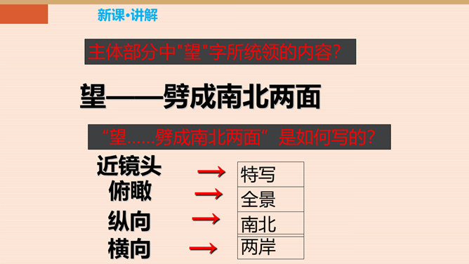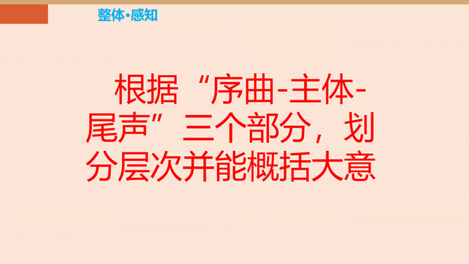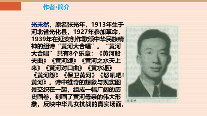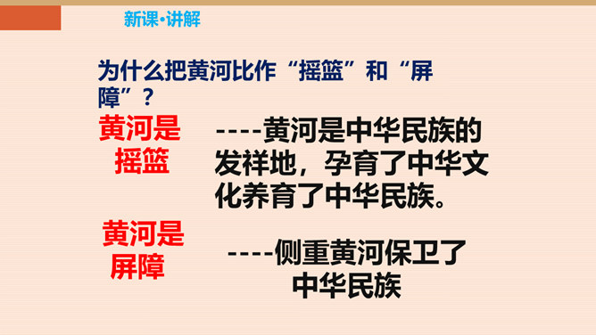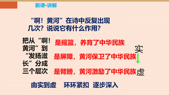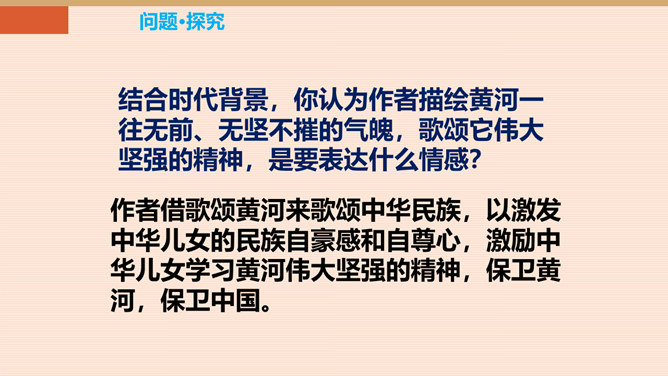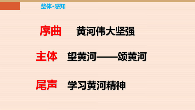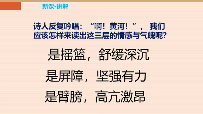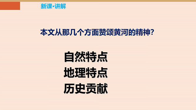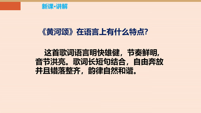 根据“序曲-主体-尾声”三个部分,划分层次并能概括大意。本文从那几个方面赞颂黄河的精神? 自然特点、地理特点、历史贡献。这首诗歌的主要内容是歌颂黄河,在歌颂前对黄河进行了一番描绘。你觉得这些句子表现了黄河的什么特点 ?一往无前、无坚不摧的气魄。这首歌词语言明快雄健,节奏鲜明,音节洪亮。歌词长短句结合,自由奔放并且错落整齐,韵律自然和谐。结合时代背景,你认为作者描绘黄河一往无前、无坚不摧的气魄,歌颂它伟大坚强的精神,是要表达什么情感?所属专题:黄河颂ppt。