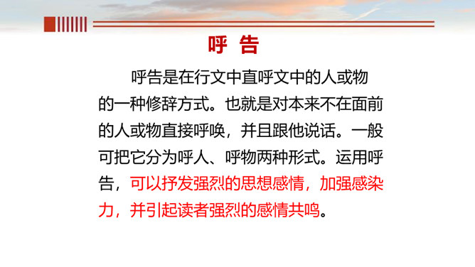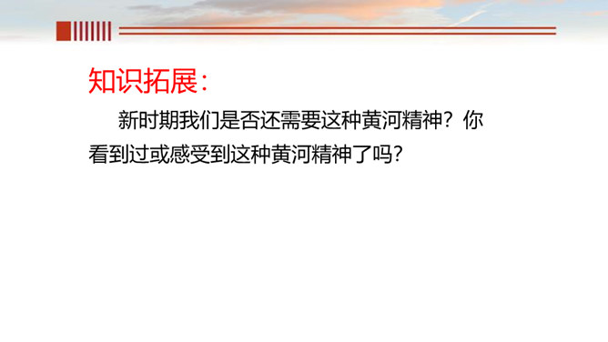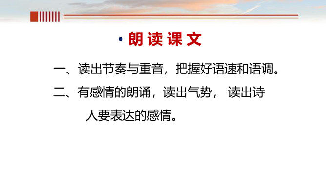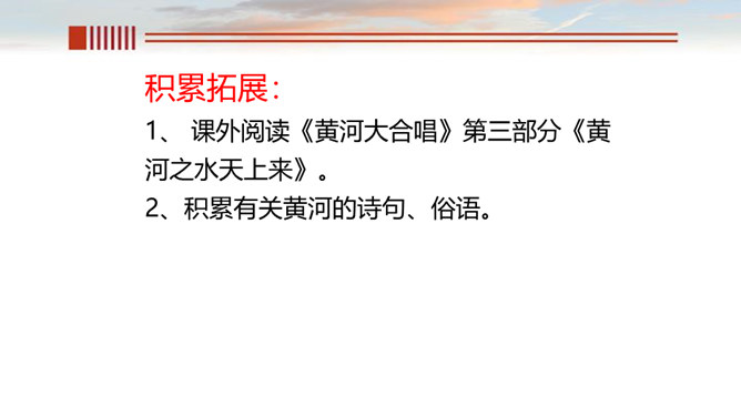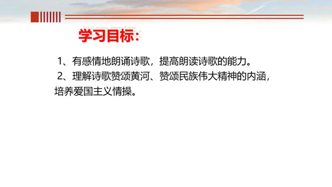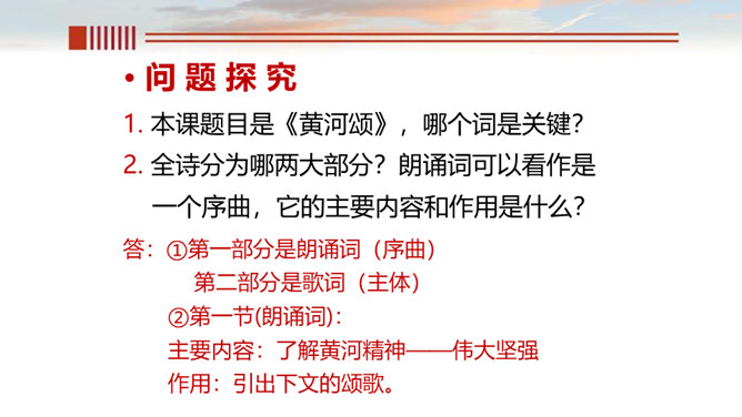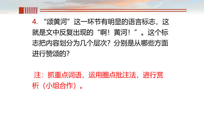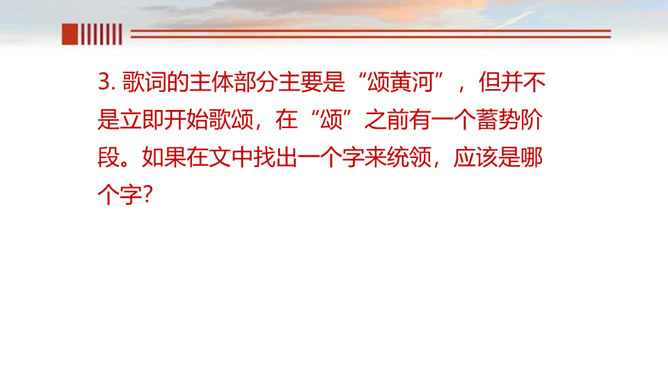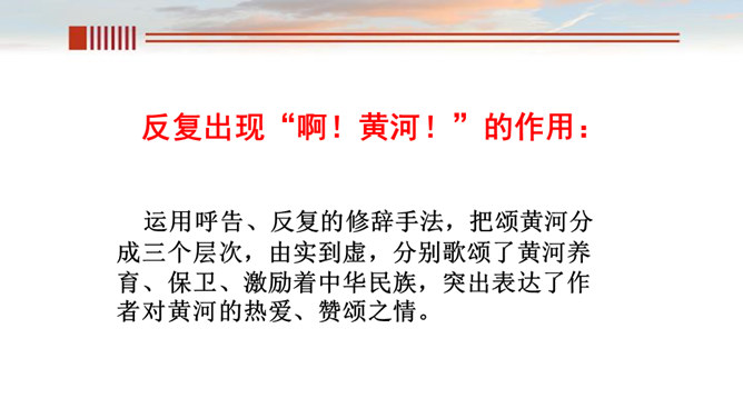 一、读出节奏与重音,把握好语速和语调。 二、有感情的朗诵,读出气势, 读出诗人要表达的感情。呼告是在行文中直呼文中的人或物的一种修辞方式。也就是对本来不在面前的人或物直接呼唤,并且跟他说话。一般可把它分为呼人、呼物两种形式。运用呼告,可以抒发强烈的思想感情,加强感染力,并引起读者强烈的感情共鸣。歌词的主体部分主要是“颂黄河”,但并不是立即开始歌颂,在“颂”之前有一个蓄势阶段。如果在文中找出一个字来统领,应该是哪个字?“颂黄河”这一环节有明显的语言标志,这就是文中反复出现的“啊!黄河!”。所属专题:黄河颂ppt。