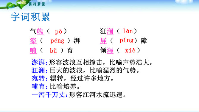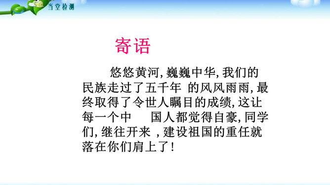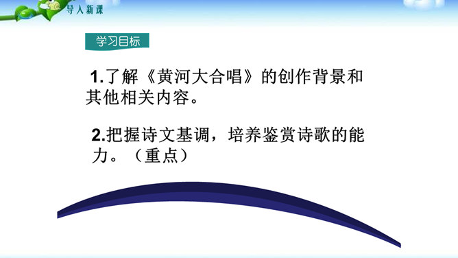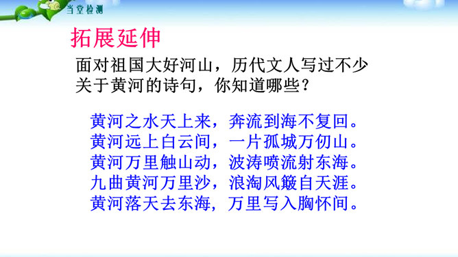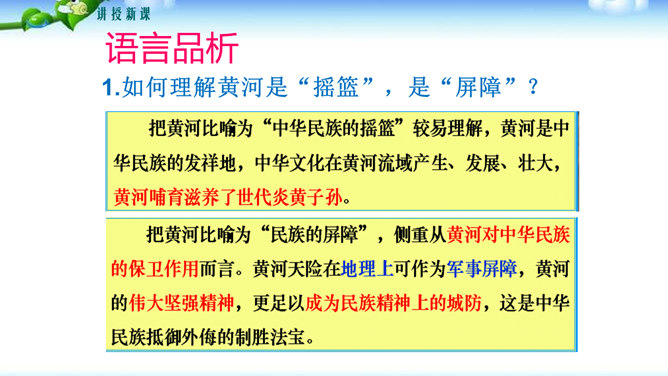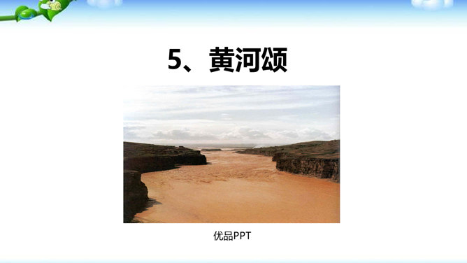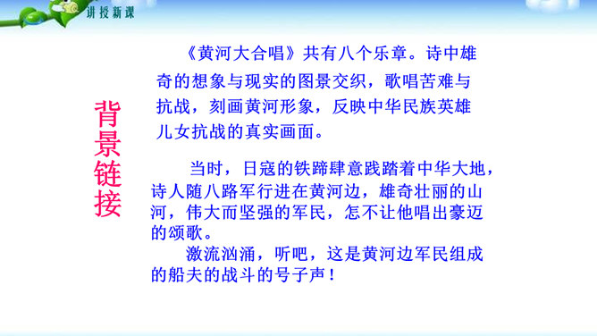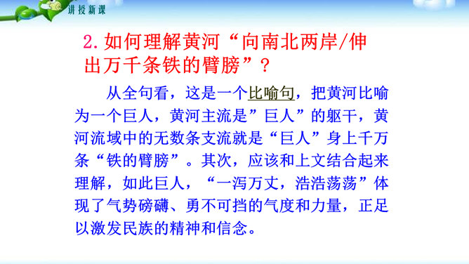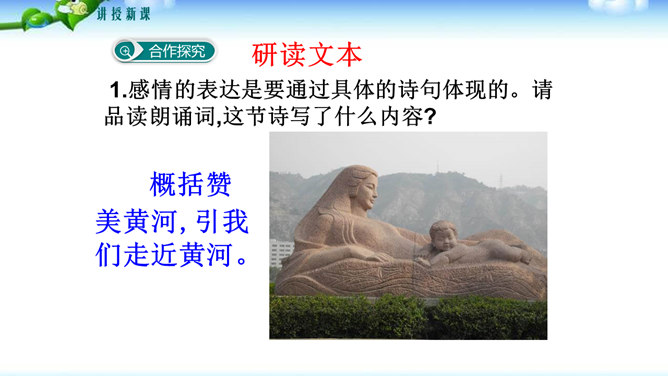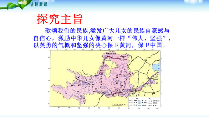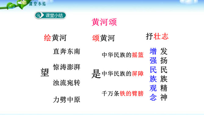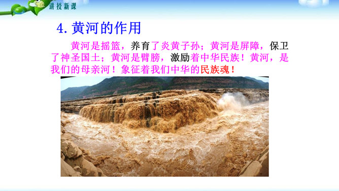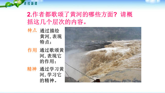 感情的表达是要通过具体的诗句体现的。请品读朗诵词,这节诗写了什么内容? 概括赞美黄河,引我们走近黄河。作者都歌颂了黄河的哪些方面? 请概括这几个层次的内容。通过描绘黄河,表现特点;通过歌颂黄河,表现它的作用;通过学习黄河,学习它的精神。作者从哪些方面描绘黄河的?描绘出黄河的什么特点? 滚滚、惊涛澎湃万丈狂澜表现了黄河气势汹涌;掀起、结、奔向、劈成表现了黄河的力量之大;宛转,九曲连环表现了黄河外形特点。所属专题:黄河颂ppt。