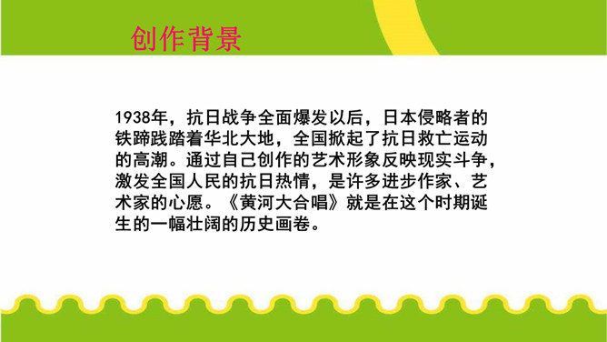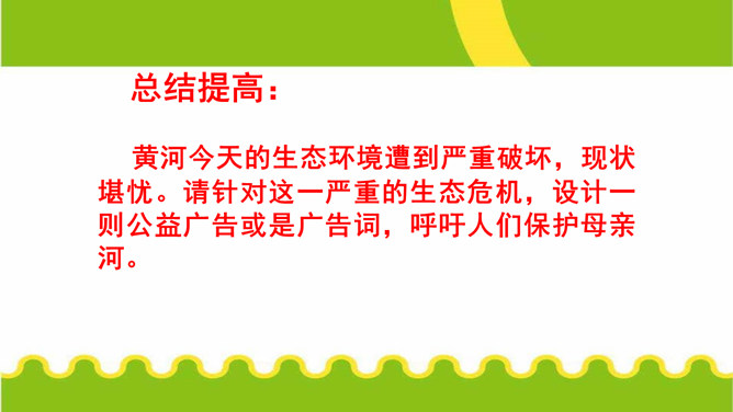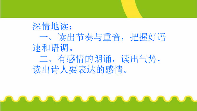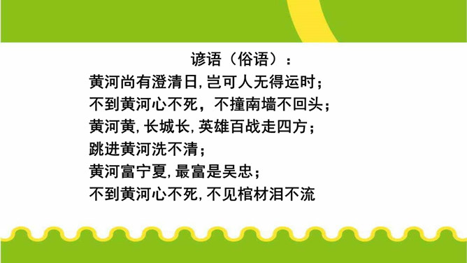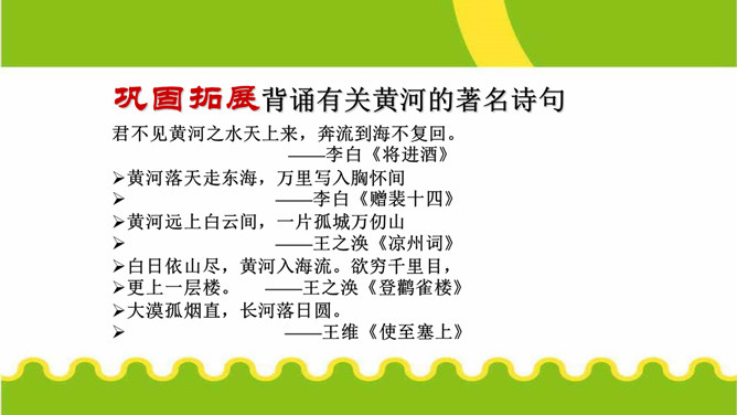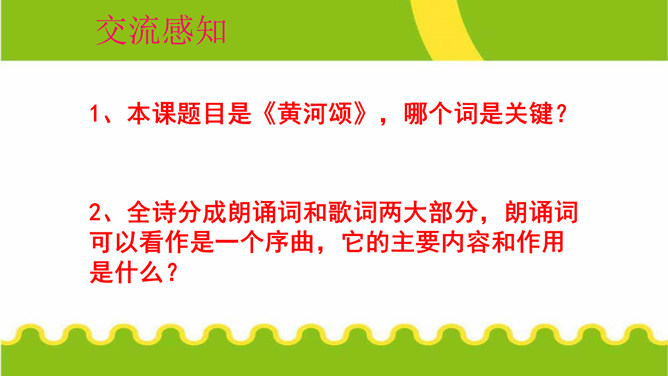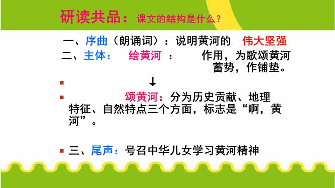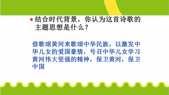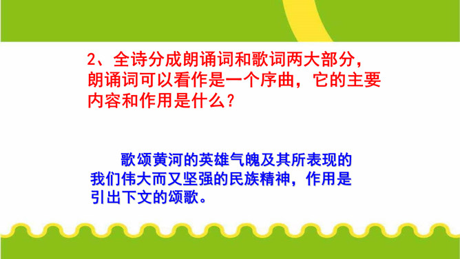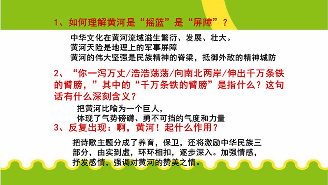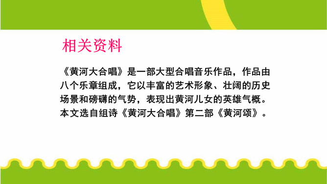 深情地读: 读出节奏与重音,把握好语速和语调。 有感情的朗诵,读出气势,读出诗人要表达的感情。全诗分成朗诵词和歌词两大部分,朗诵词可以看作是一个序曲,它的主要内容和作用是什么? 如何理解黄河是“摇篮”是“屏障”?中华文化在黄河流域滋生繁衍、发展、壮大。黄河天险是地理上的军事屏障黄河的伟大坚强是民族精神的脊梁,抵御外敌的精神城防。把黄河比喻为一个巨人,体现了气势磅礴、勇不可挡的气度和力量。所属专题:黄河颂ppt。