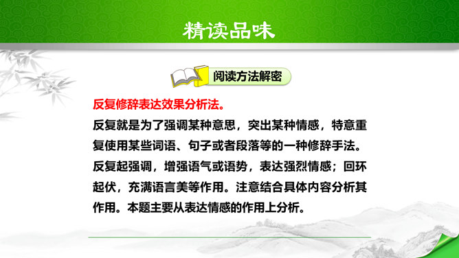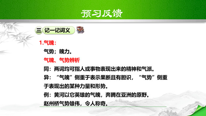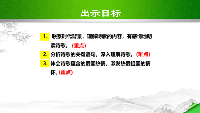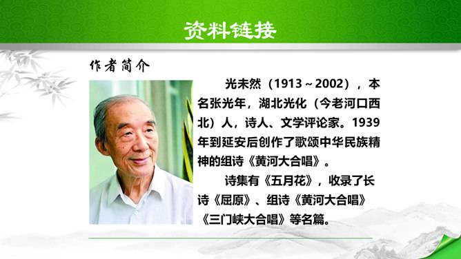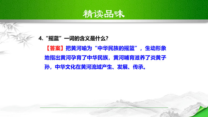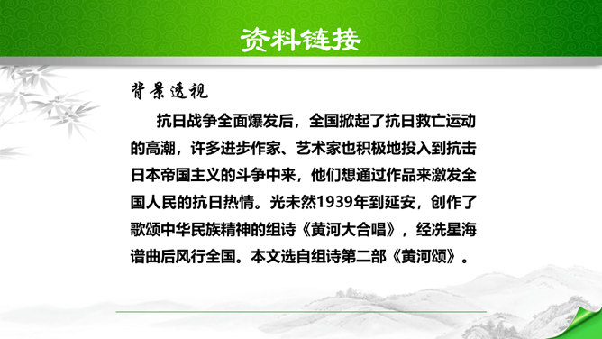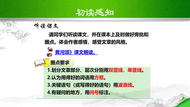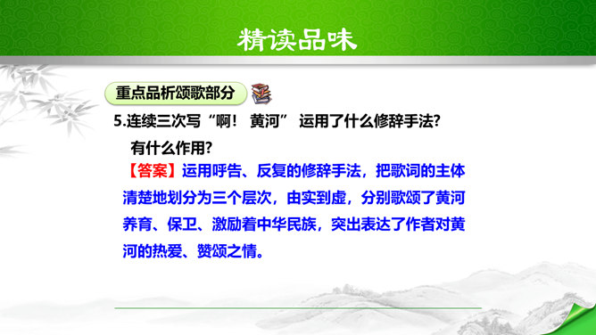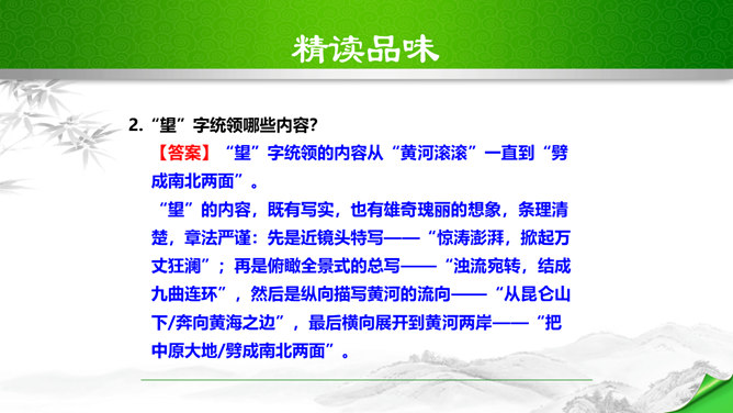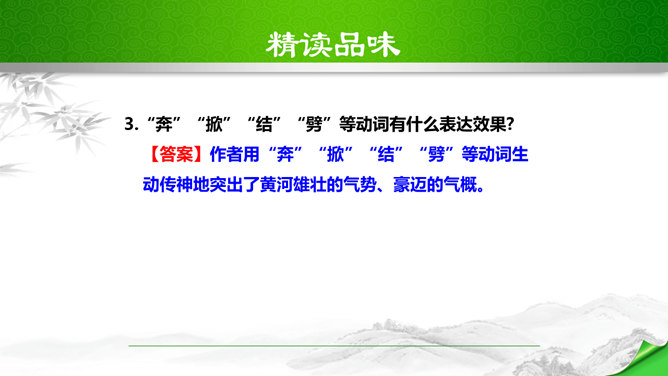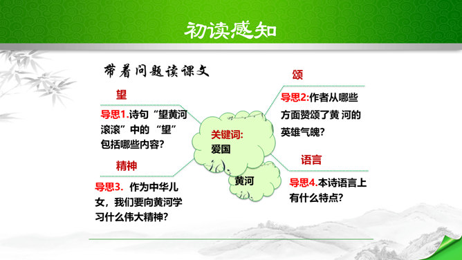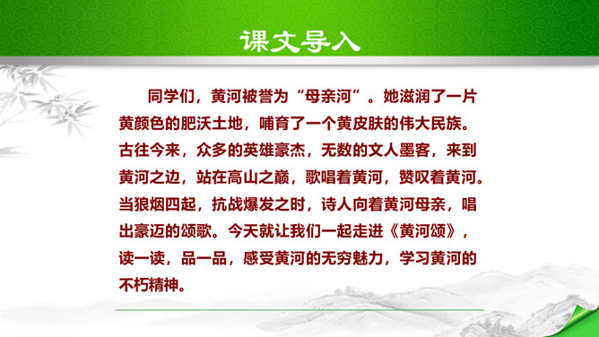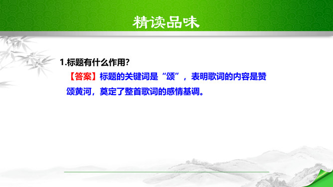 标题的关键词是“颂”,表明歌词的内容是赞颂黄河,奠定了整首歌词的感情基调。“望”字统领的内容从“黄河滚滚”一直到“劈成南北两面”。“望”的内容,既有写实,也有雄奇瑰丽的想象,条理清楚,章法严谨:先是近镜头特写“惊涛澎湃,掀起万丈狂澜”;再是俯瞰全景式的总写“浊流宛转,结成九曲连环”,然后是纵向描写黄河的流向“从昆仑山下/奔向黄海之边”,最后横向展开到黄河两岸“把中原大地/劈成南北两面”。作者用“奔”“掀”“结”“劈”等动词生动传神地突出了黄河雄壮的气势、豪迈的气概。所属专题:黄河颂ppt。