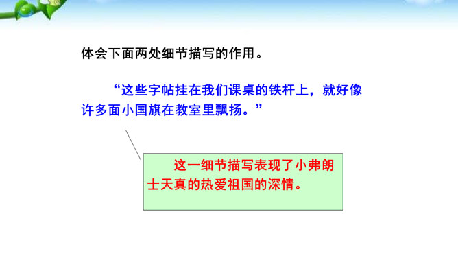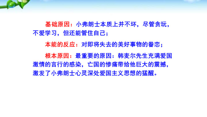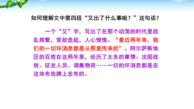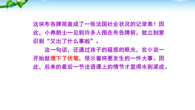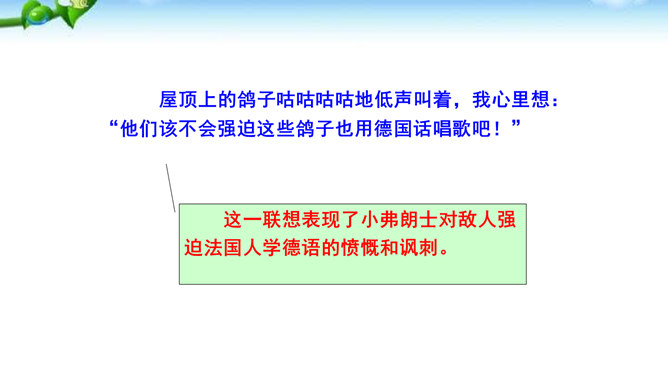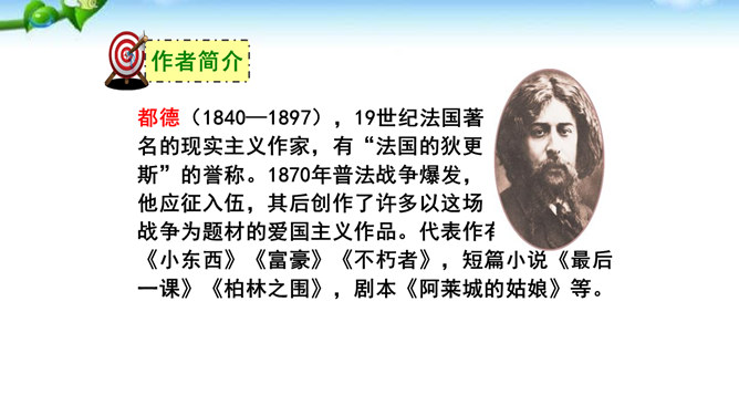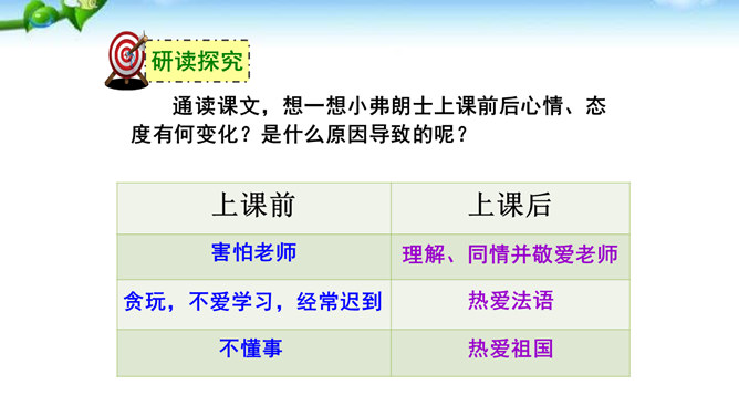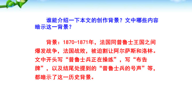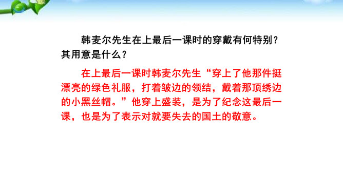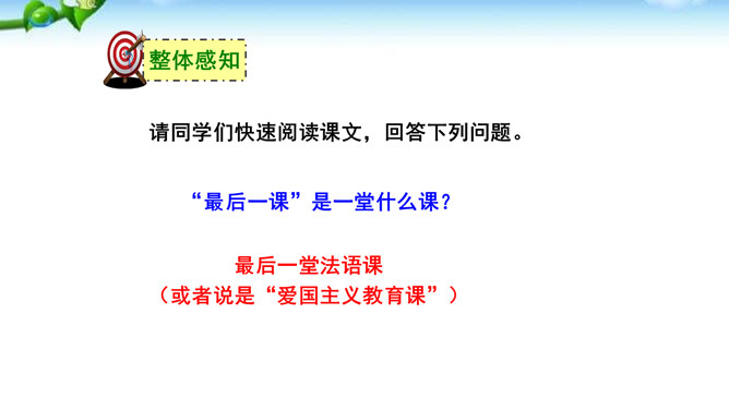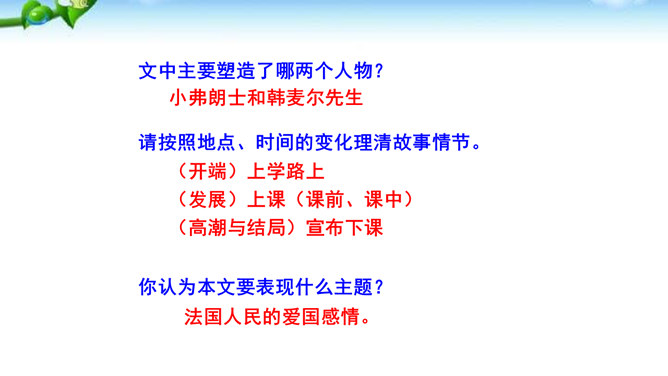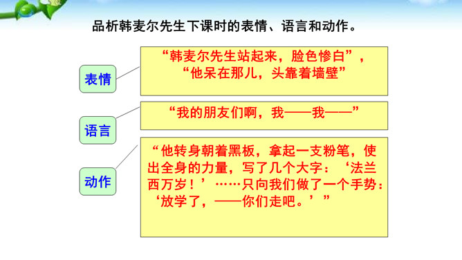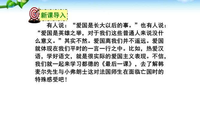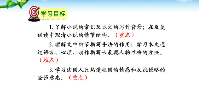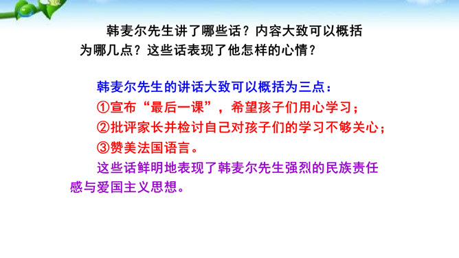 1.了解小说的常识及本文的写作背景;在反复诵读中理清小说的情节结构。(重点)2.理解文中细节描写手法的作用;学习本文通过语言、心理、动作描写来表现人物性格的方法。3.学习法国人民热爱祖国的情感和反抗侵略的坚强意志。(重点)小弗郎士为什么感到先生的形象“从来没有这么高大”?小弗郎士从韩麦尔先生的言行中,感受到了他对祖国的热爱以及对失去祖国的痛苦心情。正是韩麦尔先生的爱国精神,使小弗朗士觉得他的形象高大了。所属专题:最后一课ppt。