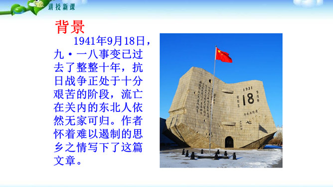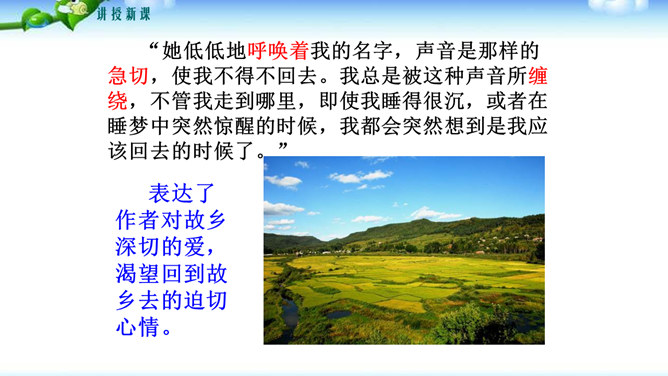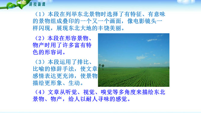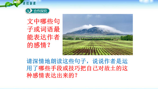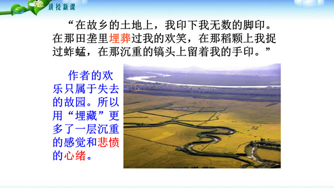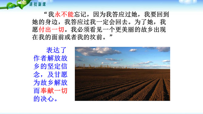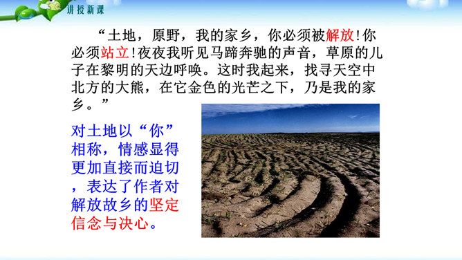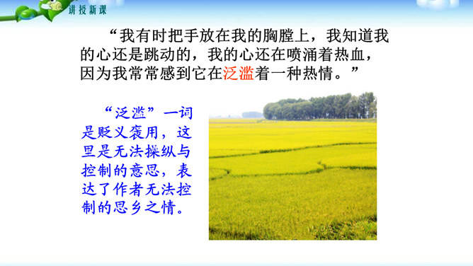 文中哪些句子或词语最能表达作者的感情?请深情地朗读这些句子,说说作者是运用了哪些手段或技巧把自己对故土的这种感情表达出来的?“泛滥”一词是贬义褒用,这里是无法操纵与控制的意思,表达了作者无法控制的思乡之情。(1)本段在列举东北景物时选择了有特征、有意味的景物组成叠印的一个又一个画面,像电影镜头一样闪现,展现东北大地的丰饶美丽。(2)本段在形容景物、物产时用了许多富有特色的形容词。(3)本段运用了排比、比喻的修辞手法,使文章感情表达更充沛,使景物描绘更形象、生动。所属专题:土地的誓言ppt。