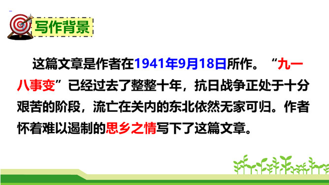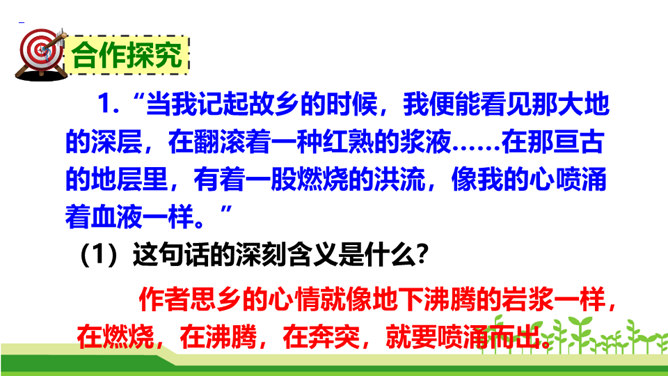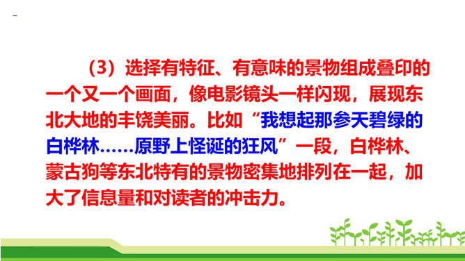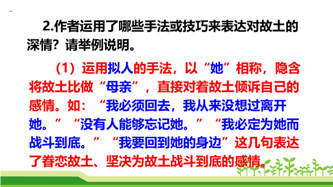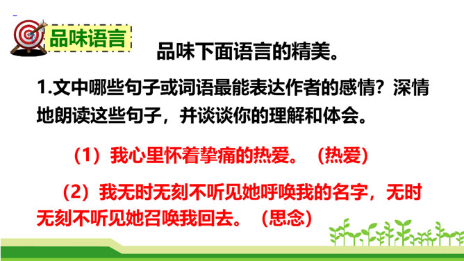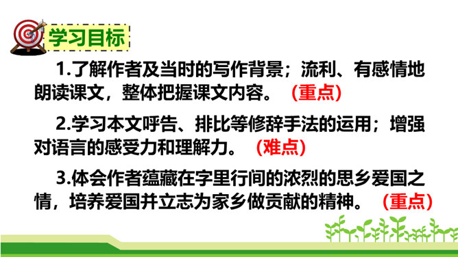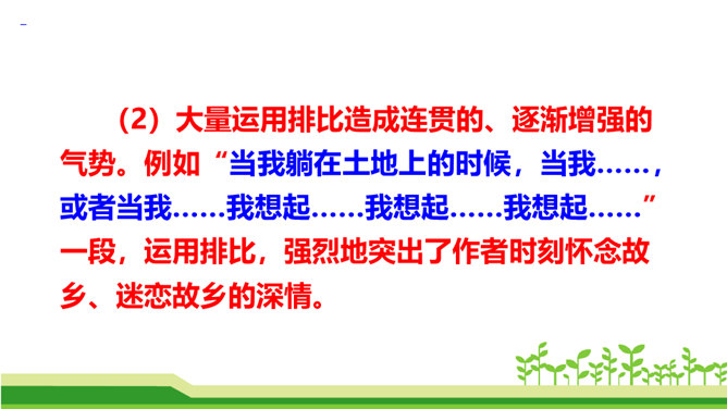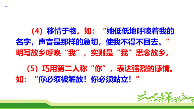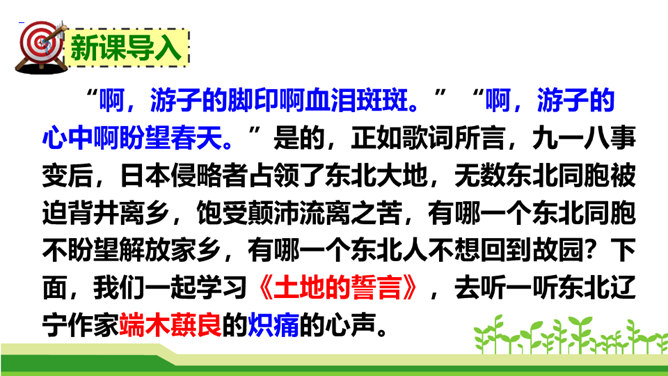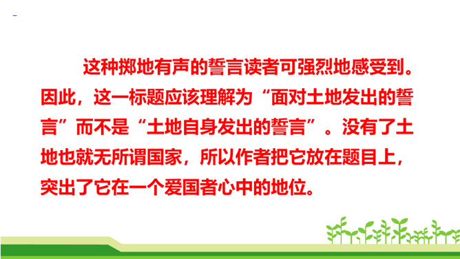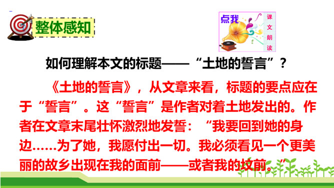 1.呼告手法的运用。文章运用“呼告”手法直接对着土地倾诉自己的热爱、怀想、眷念,并且将倾诉对象拟人化,以“你”相称,将土地比作“母亲”。2.语言凝练,饱含深情。本文饱含了对家乡的热爱、感恩,并要为之奋斗的激情。那一声声发自内心的召唤与自己时时对家乡的回忆,再加之排比、比喻、夸张等修辞手法的运用,更增加了感情的强度,增添了内容的饱满度与感情的真挚度。3.寄情于物,波澜起伏。文章的感情表达不是空洞的、抽象的,而是寄情于物,使自己的感情表达得贴切与自然。所属专题:土地的誓言ppt。