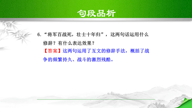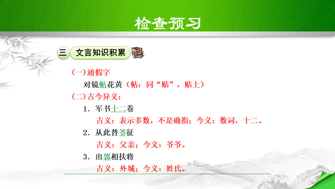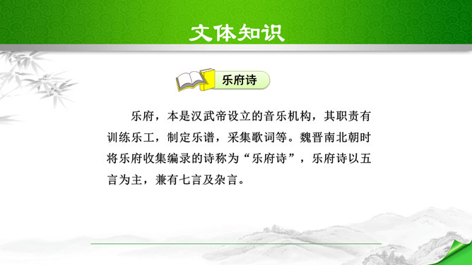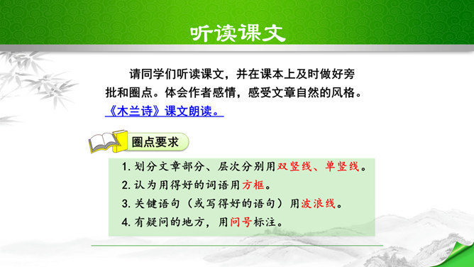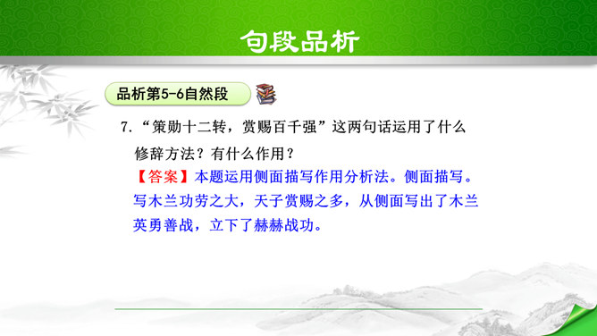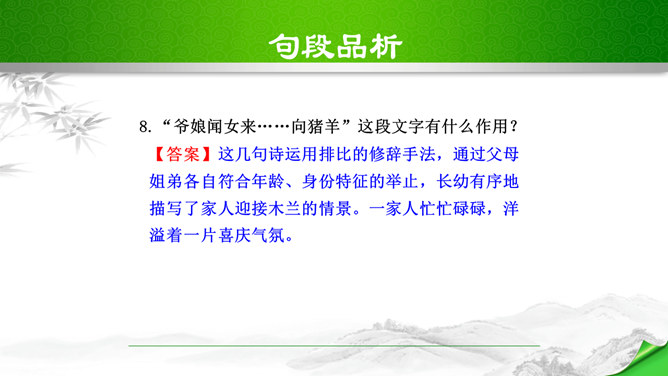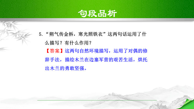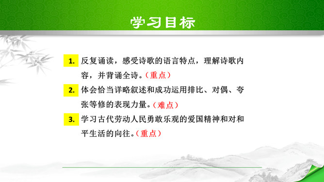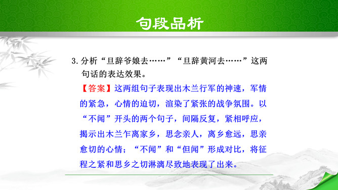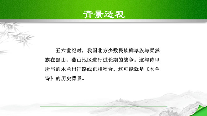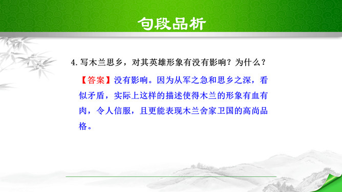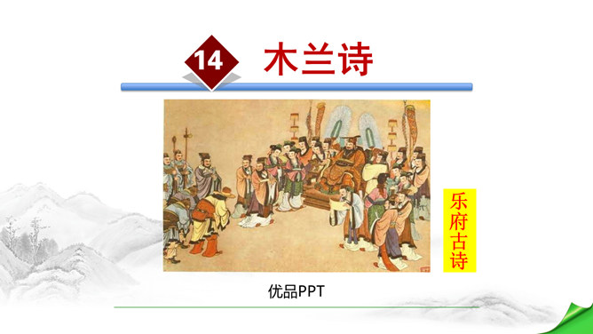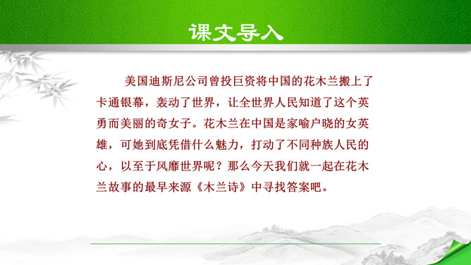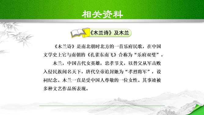 美国迪斯尼公司曾投巨资将中国的花木兰搬上了卡通银幕,轰动了世界,让全世界人民知道了这个英勇而美丽的奇女子。花木兰在中国是家喻户晓的女英雄,可她到底凭借什么魅力,打动了不同种族人民的心,以至于风靡世界呢?那么今天我们就一起在花木兰故事的最早来源《木兰诗》中寻找答案吧。反复诵读,感受诗歌的语言特点,理解诗歌内容,并背诵全诗。体会恰当详略叙述和成功运用排比、对偶、夸张等修的表现力量。学习古代劳动人民勇敢乐观的爱国精神和对和平生活的向往。所属专题:木兰诗ppt。
