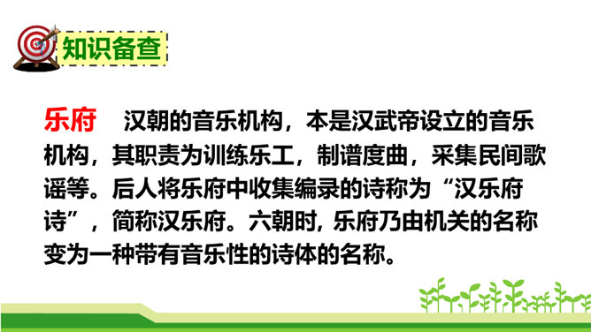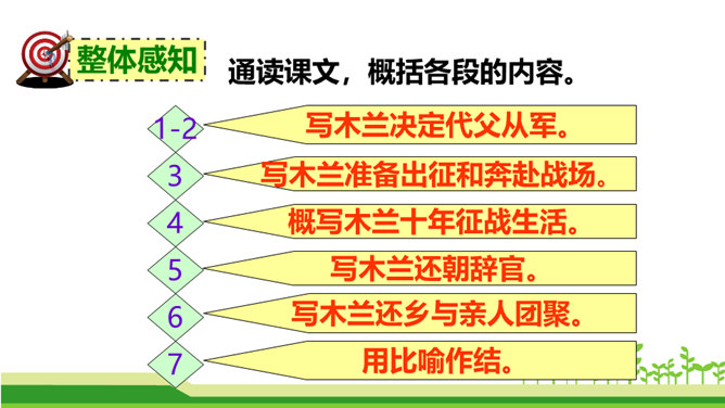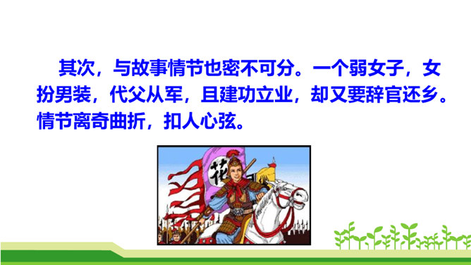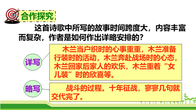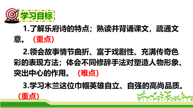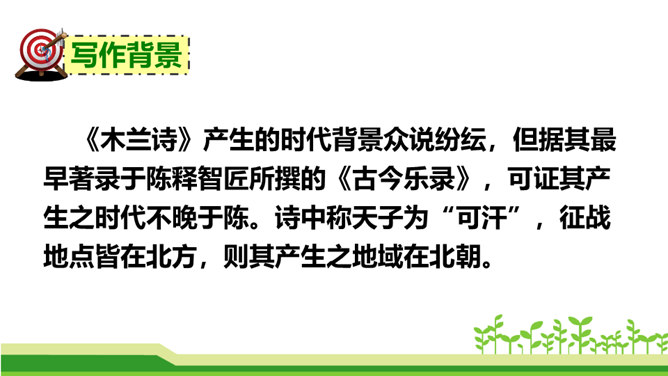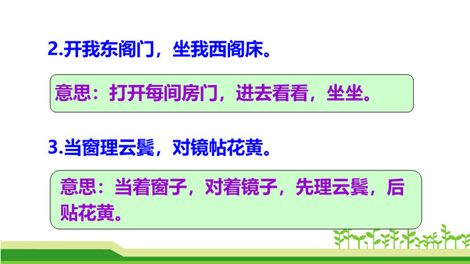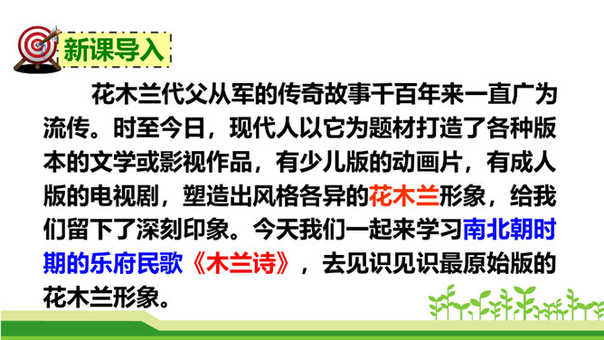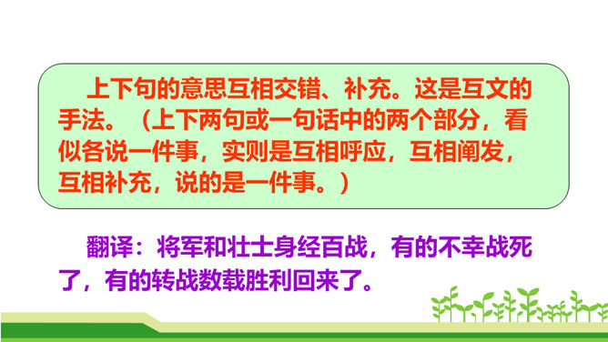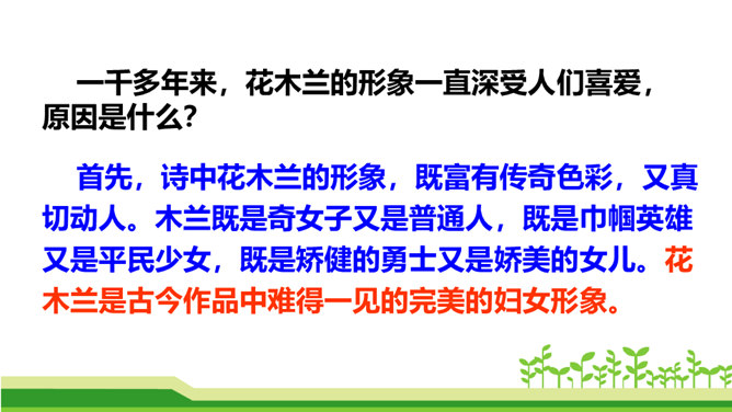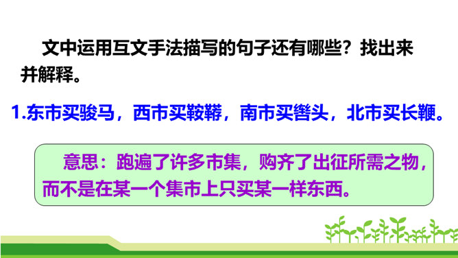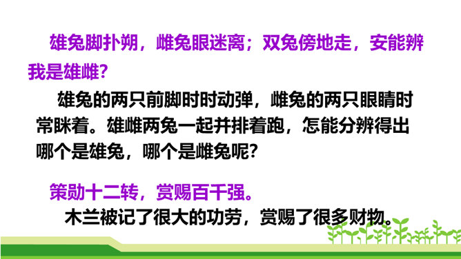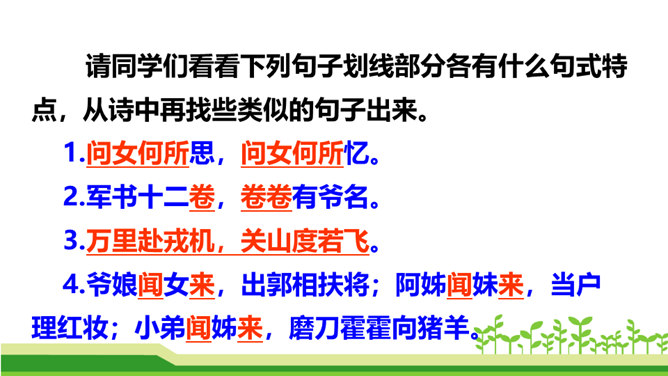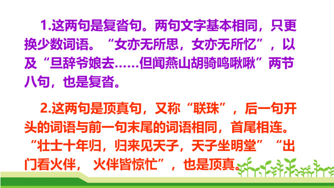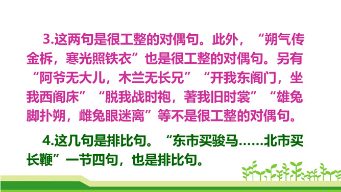 1.这两句是复沓句。两句文字基本相同,只更换少数词语。“女亦无所思,女亦无所忆”,以及“旦辞爷娘去……但闻燕山胡骑鸣啾啾”两节八句,也是复沓。2.这两句是顶真句,又称“联珠”,后一句开头的词语与前一句末尾的词语相同,首尾相连。“壮士十年归,归来见天子,天子坐明堂”“出门看火伴, 火伴皆惊忙”,也是顶真。3.这两句是很工整的对偶句。此外,“朔气传金柝,寒光照铁衣”也是很工整的对偶句。另有“阿爷无大儿,木兰无长兄”“开我东阁门,坐我西阁床”“脱我战时袍,著我旧时裳”“雄兔脚扑朔,雌兔眼迷离”等不是很工整的对偶句。所属专题:木兰诗ppt。