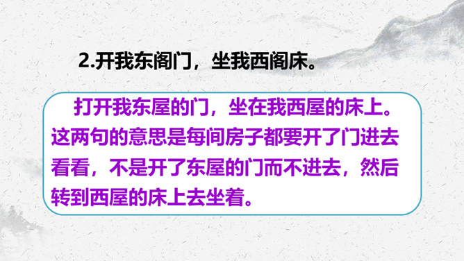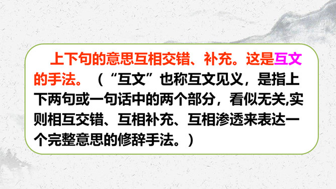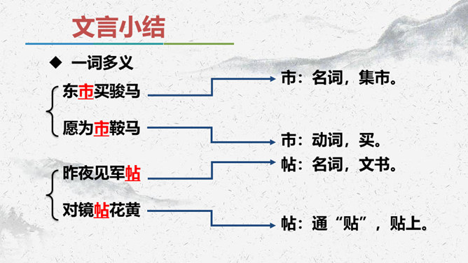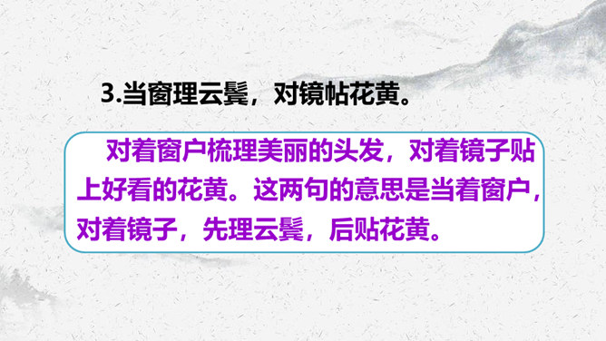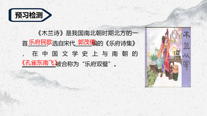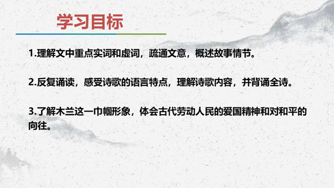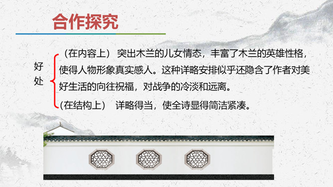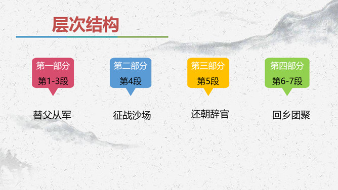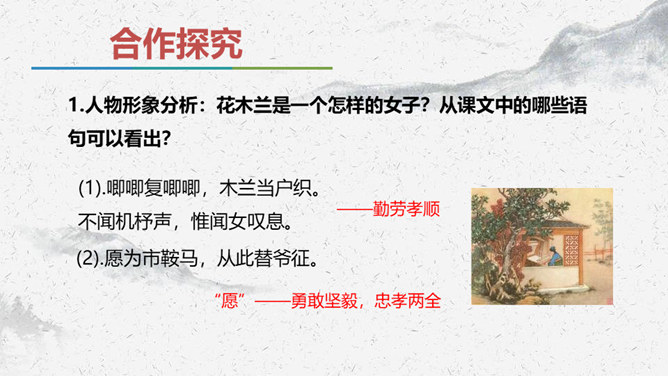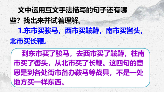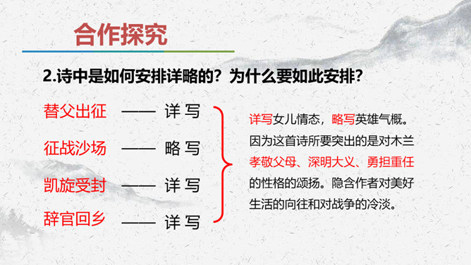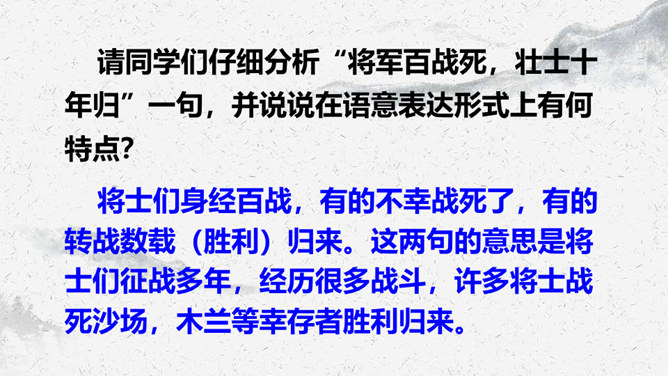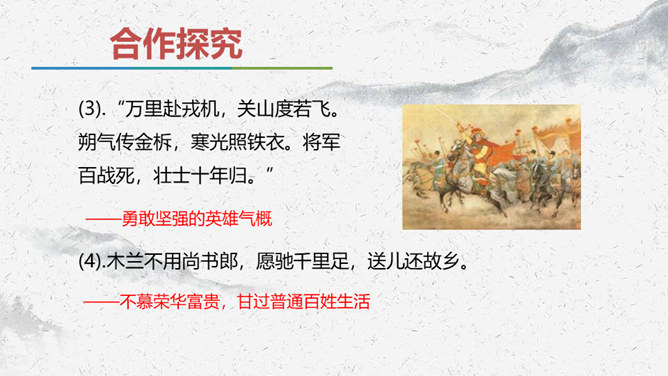 1.详略得当,结构清楚。本诗详写了木兰从军缘由、准备行装、出征想家、辞官还家、家人团聚等情节,略写了多年征战的情节。这样的详略处理,既让木兰勤劳、善良、淳朴、机智、淡泊名利的特点更加突出,也让木兰的形象更加丰满。2.民歌特色,多用修辞。本诗的语言生动质朴,极少雕饰斧凿,流传千百年来,至今仍被人们津津乐道;除了“万里赴戎机,关山度若飞。朔气传金柝,寒气照铁衣。将军百战死,壮士十年归。”六句文字比较典雅外,其余都保留着民歌的形式和风格。问答、排比、重叠等形式的运用,都与民歌大致相同。所属专题:木兰诗ppt。