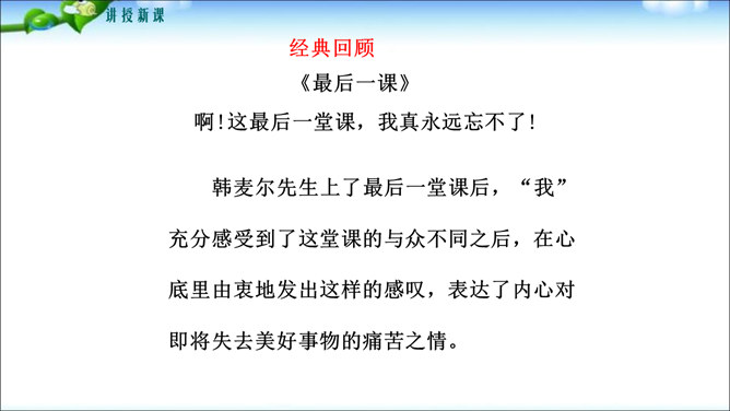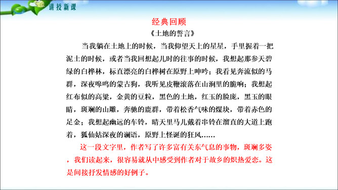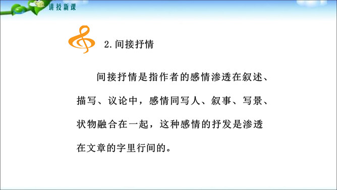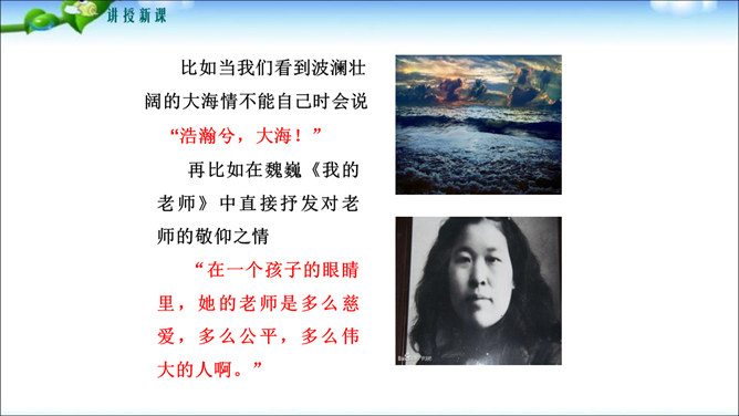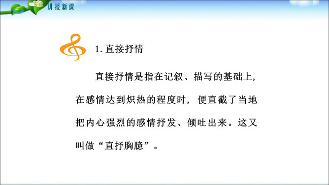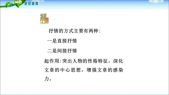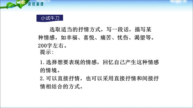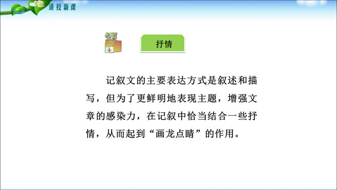 鲁迅先生曾经说过“无情未必真豪杰”,这句话说明了什么问题呢?人是有感情的。既然人是有感情的,那么有了感情后就必然要从心中表达出来,这种表达的过程你们知道叫什么吗?1.明确细节描写的作用及细节描写的角度和手法。2.学会运用具体的方法进行抒情,抒发内心情感。记叙文的主要表达方式是叙述和描写,但为了更鲜明地表现主题,增强文章的感染力,在记叙中恰当结合一些抒情,从而起到“画龙点睛”的作用。所属专题:学习抒情ppt。