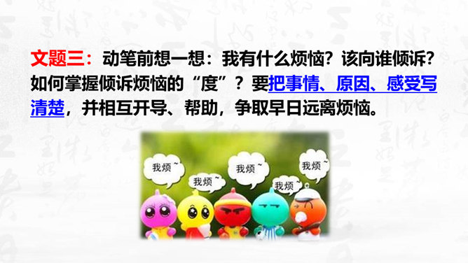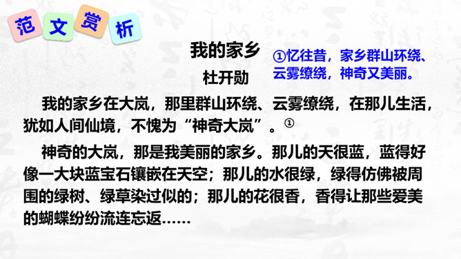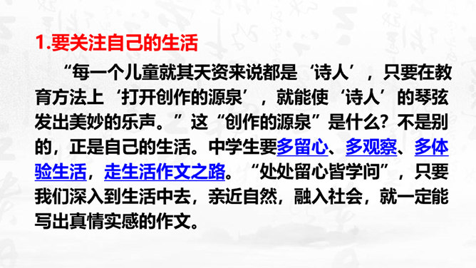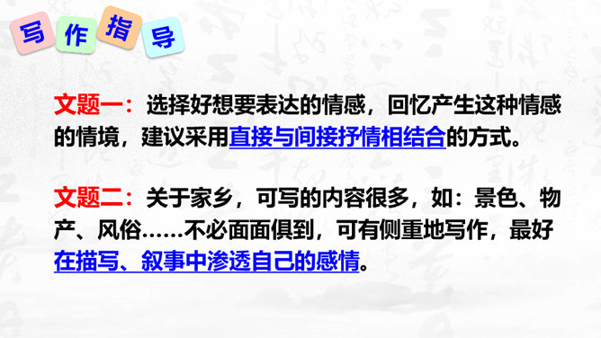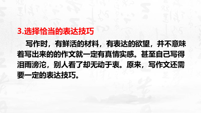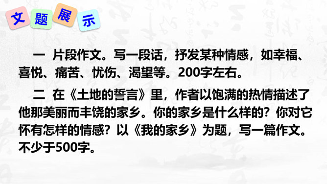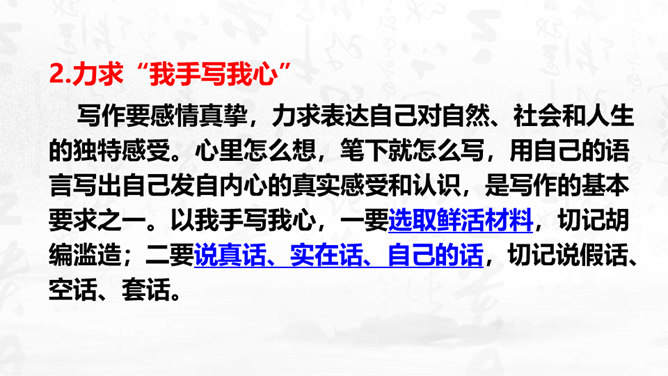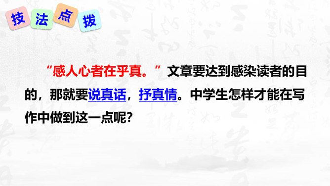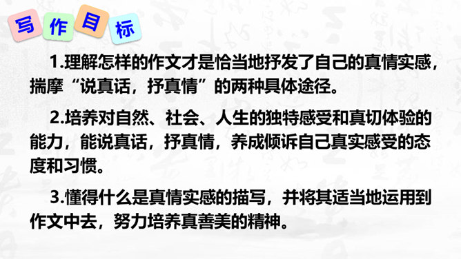 1.理解怎样的作文才是恰当地抒发了自己的真情实感,揣摩“说真话,抒真情”的两种具体途径。2.培养对自然、社会、人生的独特感受和真切体验的能力,能说真话,抒真情,养成倾诉自己真实感受的态度和习惯。3.懂得什么是真情实感的描写,并将其适当地运用到作文中去,努力培养真善美的精神。写作要感情真挚,力求表达自己对自然、社会和人生的独特感受。心里怎么想,笔下就怎么写,用自己的语言写出自己发自内心的真实感受和认识,是写作的基本要求之一。以我手写我心,一要选取鲜活材料,切记胡编滥造。所属专题:学习抒情ppt。