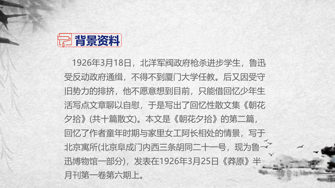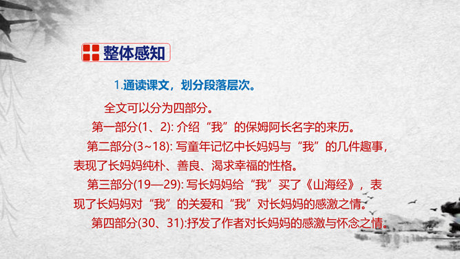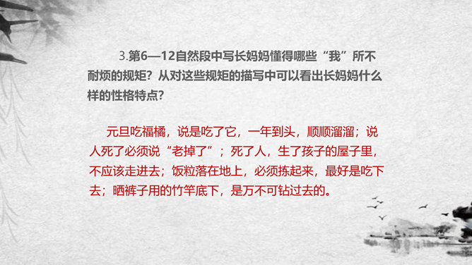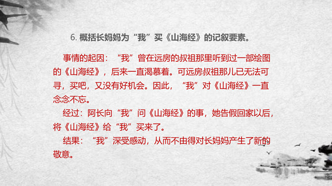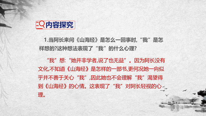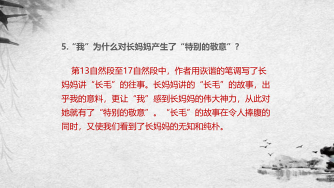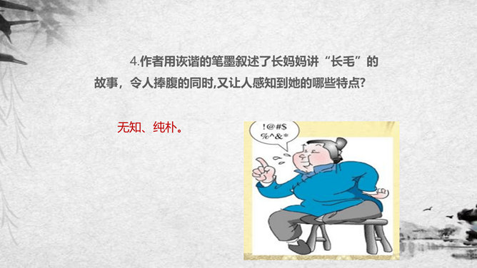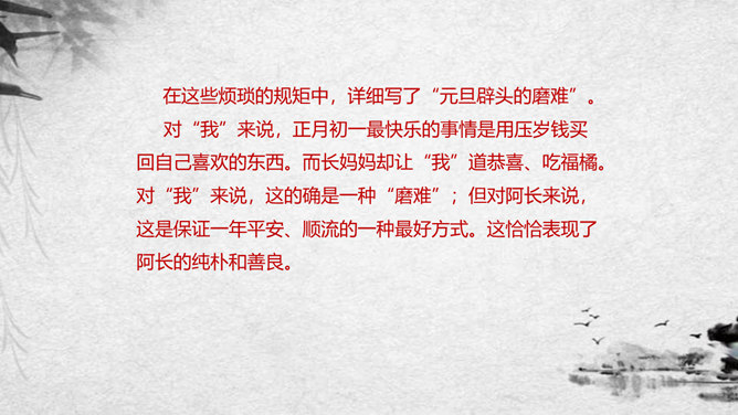 文中描写了长妈妈塞给“我”福橘的往事,是怎描写的?她的这一举动寄托了她怎样的愿望?文中写她“立刻伸出臂膊,一把将我按住”“惶急地看着我”,“她又有所要求似的,摇着我的肩”。焦急的神态跃然纸上。而当“我”说“阿妈,恭喜……”之后,“她于是十分喜欢似的,笑将起来,同时将一点冰冷的东西,塞在我的嘴里”。欣喜之态溢于言表。作者虽然认为这是“元旦辟头的磨难”,但正是这“磨难”中,寄托着长妈妈善良真诚的愿望。她希望自己和孩子“一年到头,顺顺流流”,这其中更重要的是孩子,因为并不是她自己吃福橘,而是由她“塞在我的嘴里”。所属专题:阿长与山海经ppt。