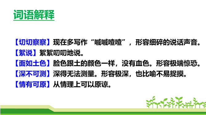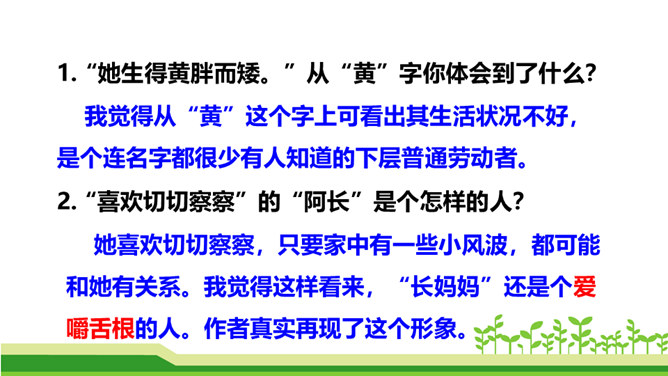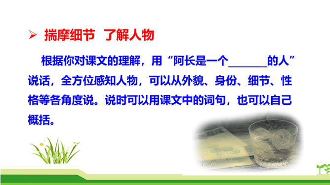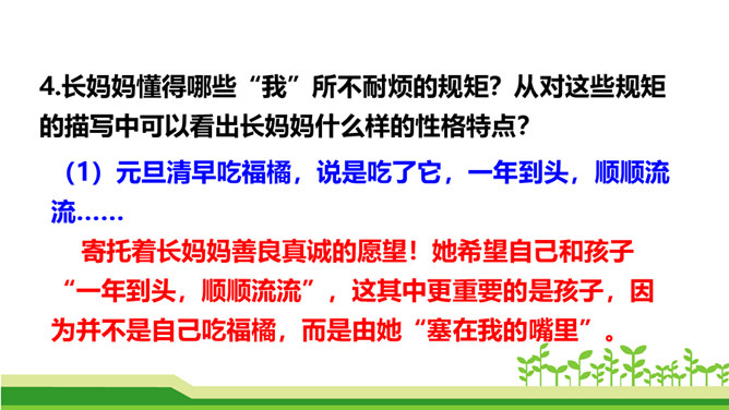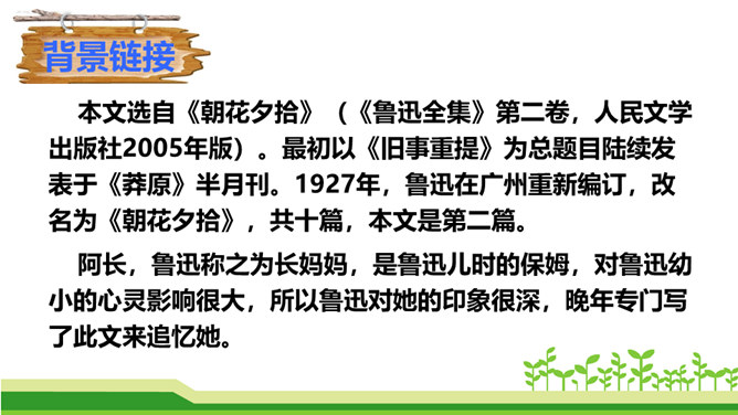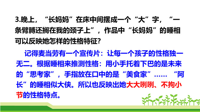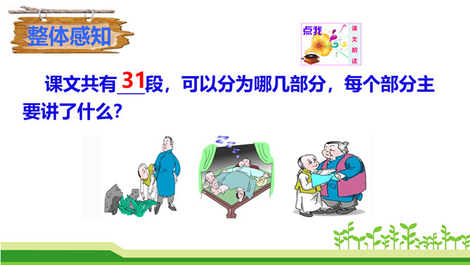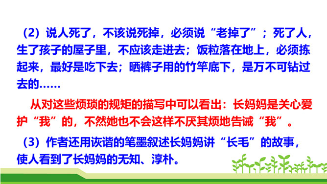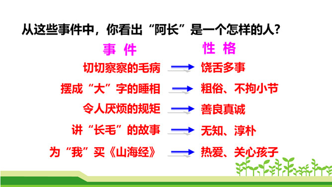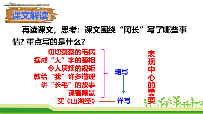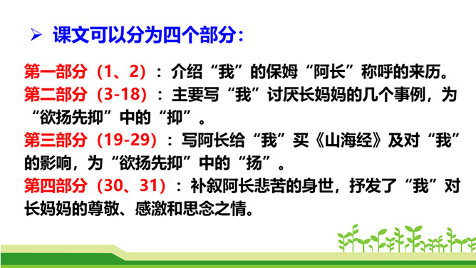 课文可以分为四个部分:第一部分(1、2):介绍“我”的保姆“阿长”称呼的来历。第二部分(3-18):主要写“我”讨厌长妈妈的几个事例,为“欲扬先抑”中的“抑”。第三部分(19-29):写阿长给“我”买《山海经》及对“我”的影响,为“欲扬先抑”中的“扬”。第四部分(30、31):补叙阿长悲苦的身世,抒发了“我”对长妈妈的尊敬、感激和思念之情。再读课文,思考:课文围绕“阿长”写了哪些事情? 重点写的是什么?所属专题:阿长与山海经ppt。