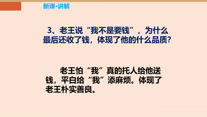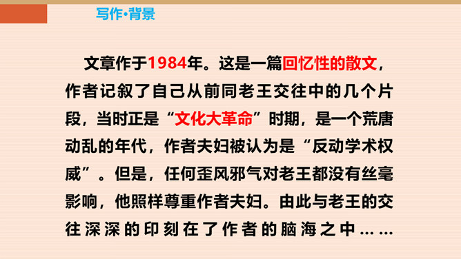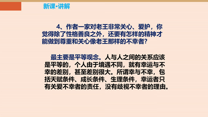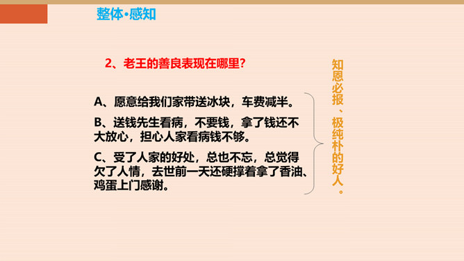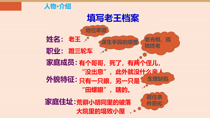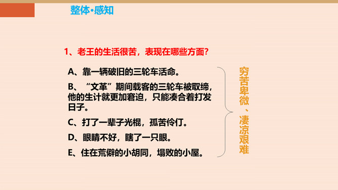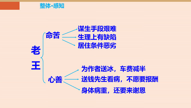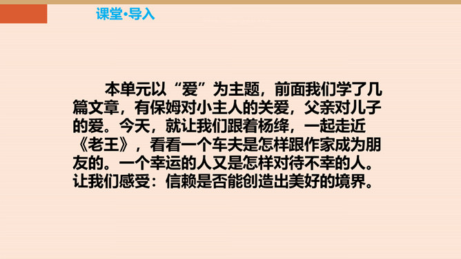 本单元以“爱”为主题,前面我们学了几篇文章,有保姆对小主人的关爱,父亲对儿子的爱。今天,就让我们跟着杨绛,一起走近课文,看看一个车夫是怎样跟作家成为朋友的。一个幸运的人又是怎样对待不幸的人。让我们感受:信赖是否能创造出美好的境界。老王的生活很苦,表现在哪些方面?靠一辆破旧的三轮车活命。“文革”期间载客的三轮车被取缔,他的生计就更加窘迫,只能凑合着打发日子。打了一辈子光棍,孤苦伶仃。眼睛不好,瞎了一只眼。住在荒僻的小胡同,塌败的小屋。作者的善良表现在哪里?所属专题:老王ppt。