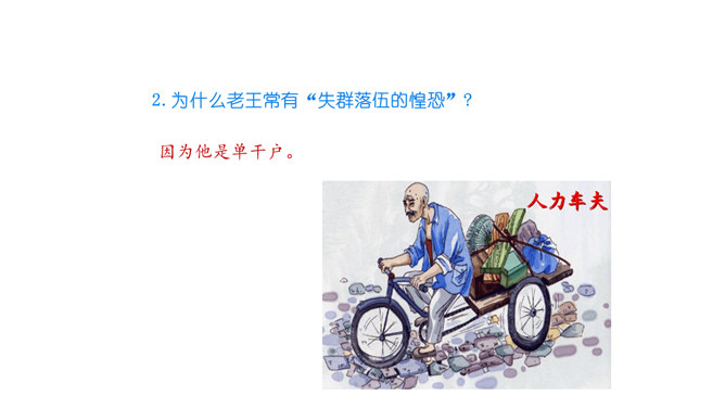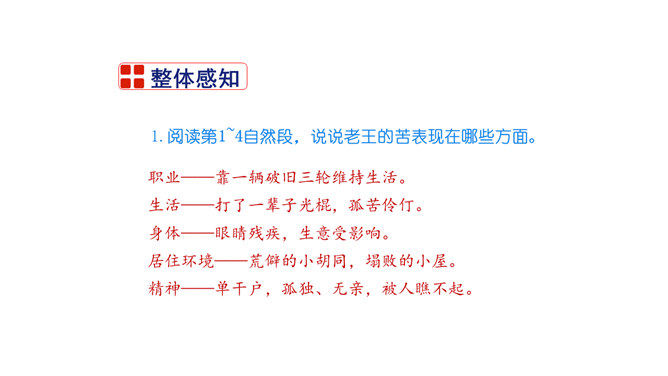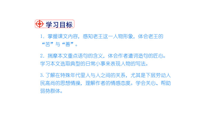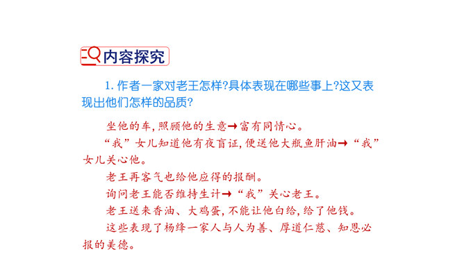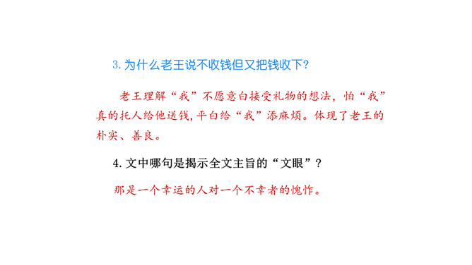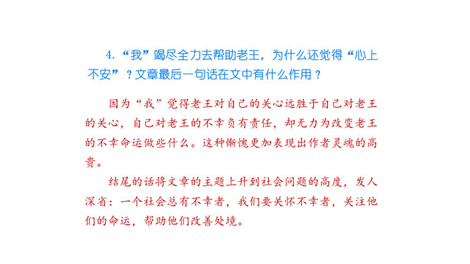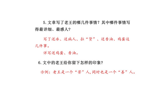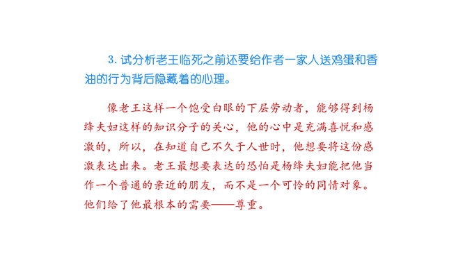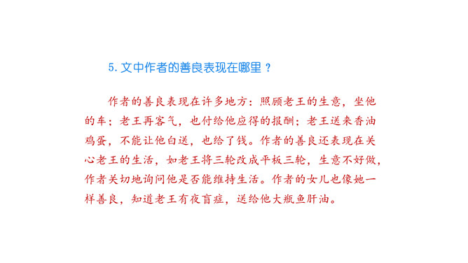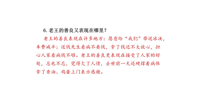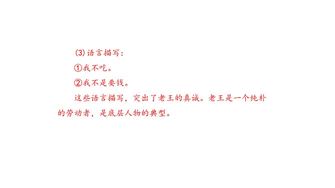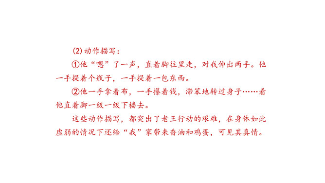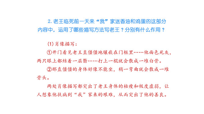 老王临死前一天来“我”家送香油和鸡蛋的这部分内容中,运用了哪些描写方法写老王?分别有什么作用?(1)肖像描写: 两处肖像描写都突出了老王身体的枯瘦和极度虚弱,让人想象他扶病到“我”家来的艰难,从而突出了他的善良。(2)动作描写:这些动作描写,都突出了老王行动的艰难,在身体如此虚弱的情况下还给“我”家带来香油和鸡蛋,可见其真情。这些语言描写,突出了老王的真诚。老王是一个纯朴的劳动者,是底层人物的典型。所属专题:老王ppt。