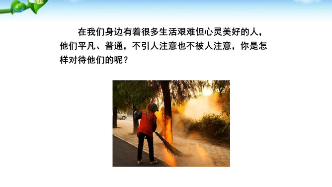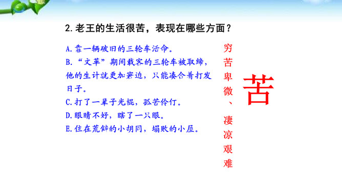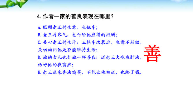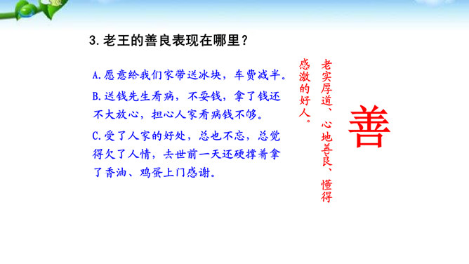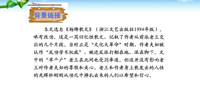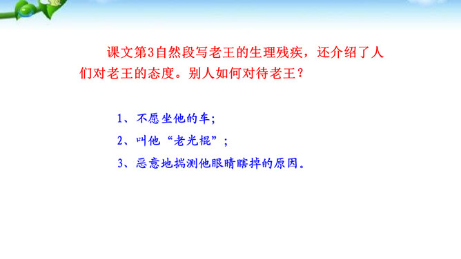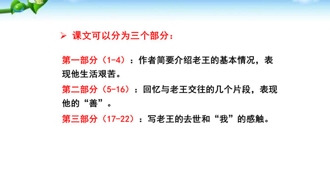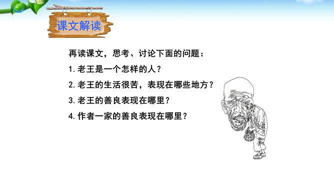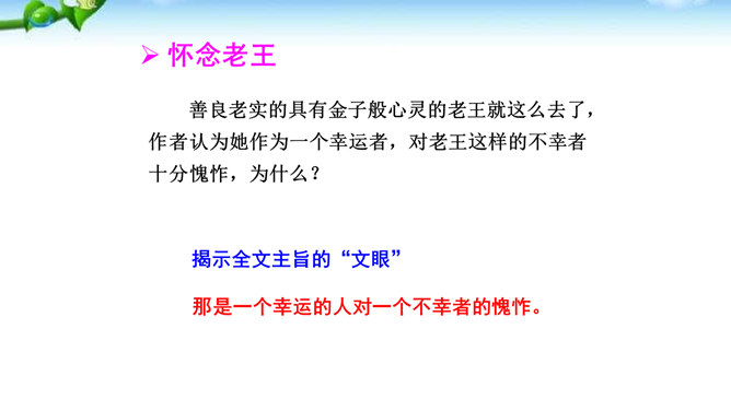 “幸运的人”指作者,“不幸者”指老王。一个社会总有幸运者和不幸者,幸运者有责任关爱不幸者,关注他们的命运,让他们也过上好日子,帮助他们改善处境。作为一个幸运者,作者回想起来,自己对老王的关爱还很不够,所以感到“愧怍”。再从深层次上说,作者的这种“愧怍”并不仅仅是出于她的善良,或者是对不幸者的同情,而是在严厉地自我审视和剖析后,清楚地看到双方情感付出的不对等而产生的。如果说以前作者对于老王多少有一种居高临下的同情和怜悯,那么此时此刻,她已经开始仰视老王那纯净的心灵。所属专题:老王ppt。