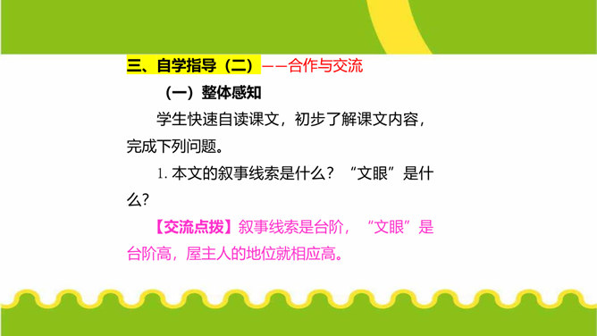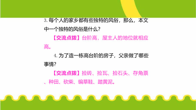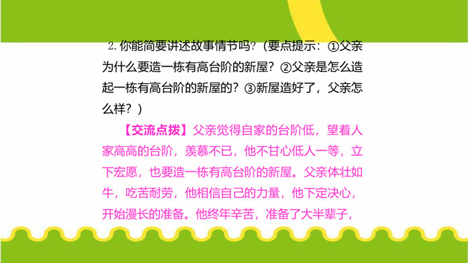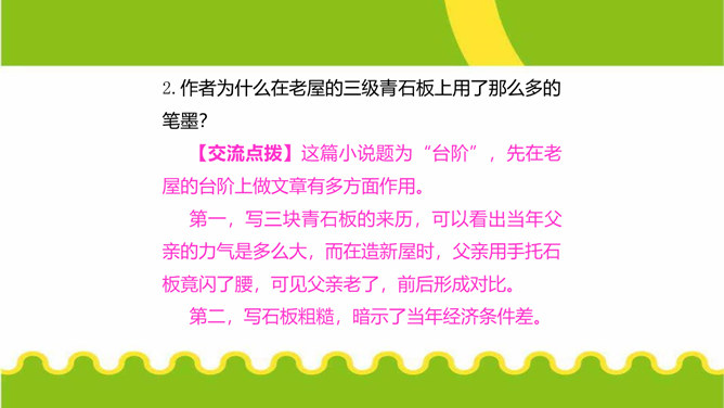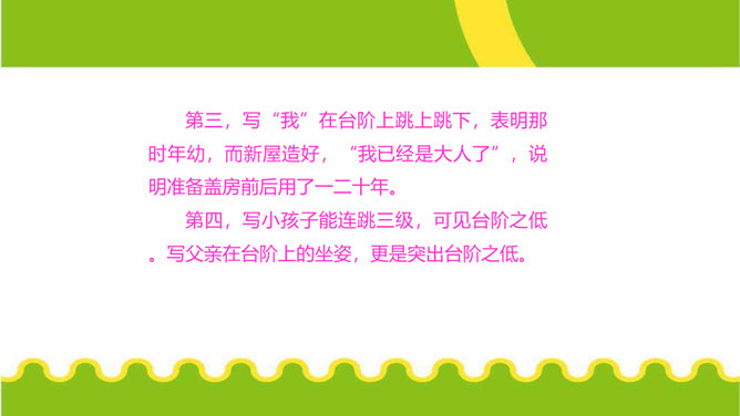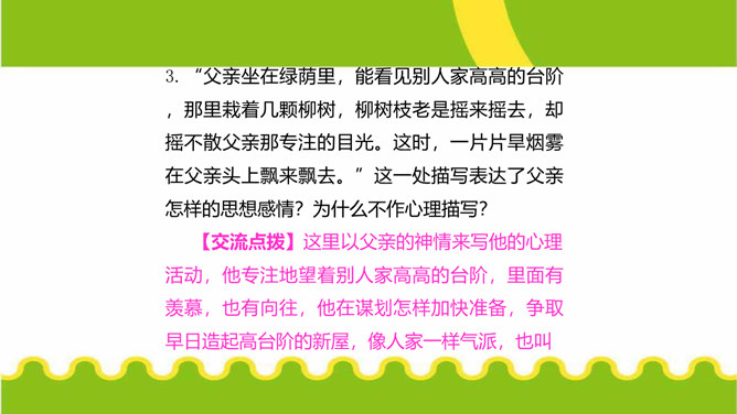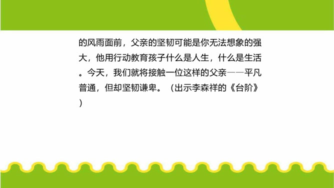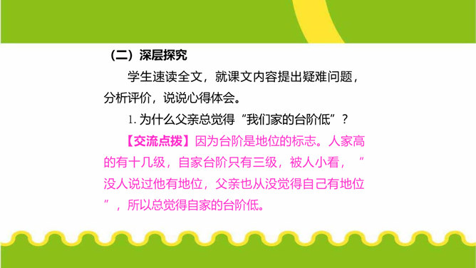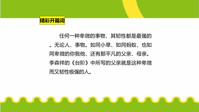 说说你对父亲这个形象的看法。父亲是一个非常要强的农民,他有志气,不甘人后,他要自立于受人尊重的行列,他有长远的目标,他有愚公移山的精神和坚忍不拔的毅力。父亲又是一个老实厚道的农民,他用诚实的劳动兴家立业,不怕千辛万苦。同时,父亲身上有着中国传统农民所持有的谦卑,当新台阶造好后,他反而处处感到不对劲、不自在,并且不好意思坐到台阶的高处。“偶尔出去一趟,回来时,一副若有所失的模样”,怎样理解父亲的这种心态?父亲辛苦了一辈子,劳动就是生命,在他的精神世界里,劳动是创造,劳动有收获,劳动体现了自己的价值。所属专题:台阶ppt。