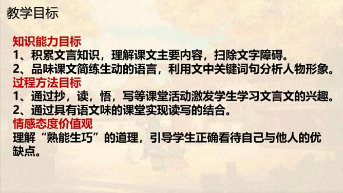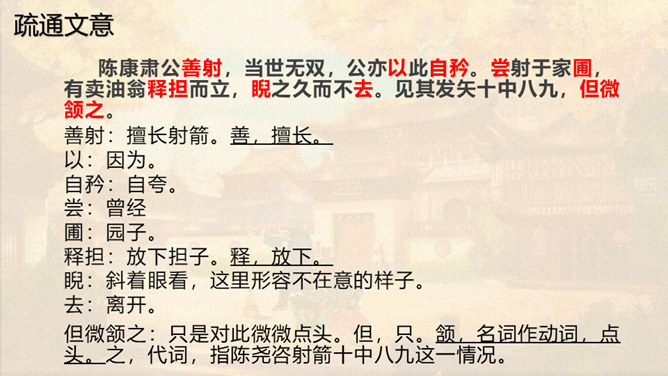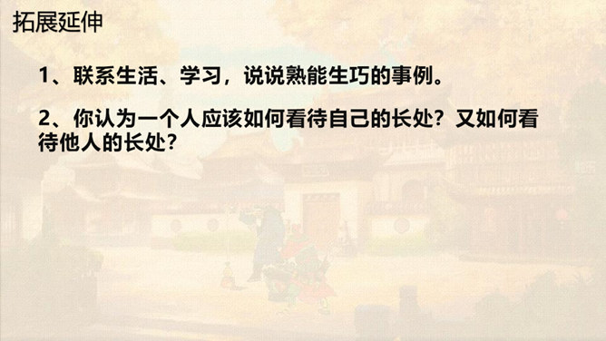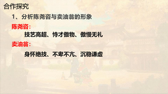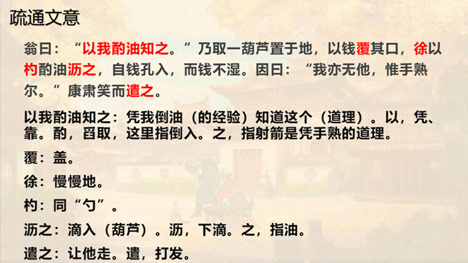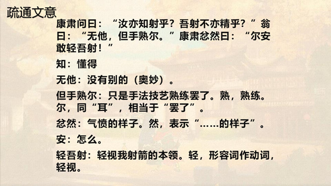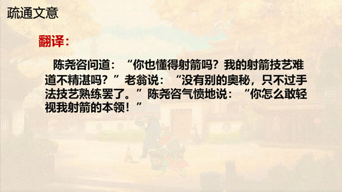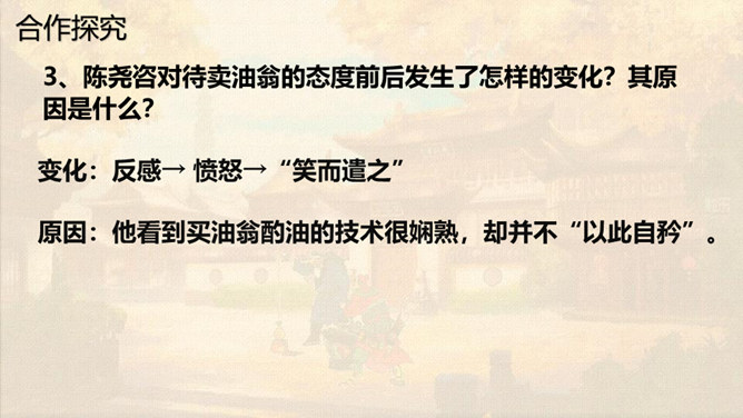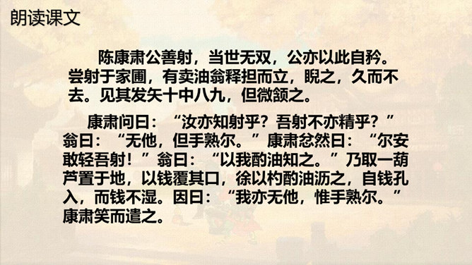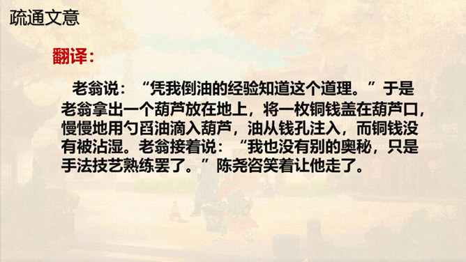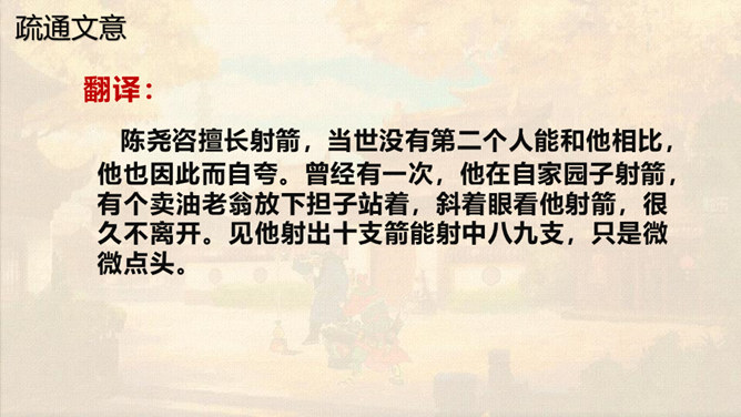 本文通过卖油翁与陈尧咨的对话,说明了熟能生巧的道理。本文虽然以陈尧咨开头和结尾,但主要人物是卖油翁。所以,文章重点写卖油翁的酌油,而对陈尧咨的射技只是简写。我们要体会这种祥略得当的写法对突出文章重点的作用。熟能生巧,要知道熟是建立在认真练习的基础上,只有平时苦练,才能做到熟能生巧。我们学习文化知识一样,也要下苦功夫,认真学习,认真理解,认真记忆。取得了成绩,也不能沾沾自喜。所属专题:卖油翁ppt。