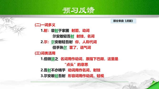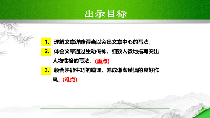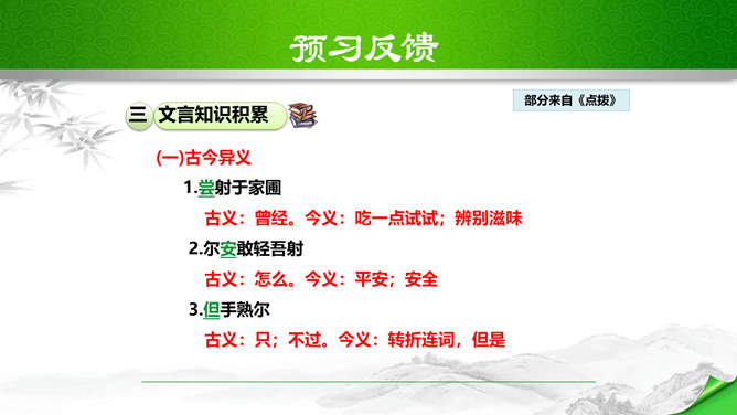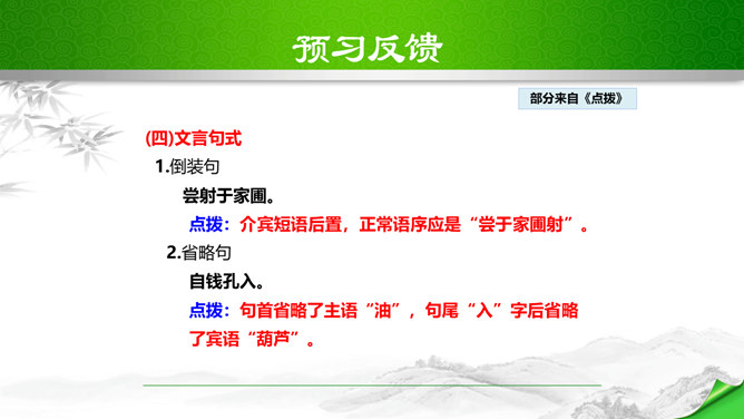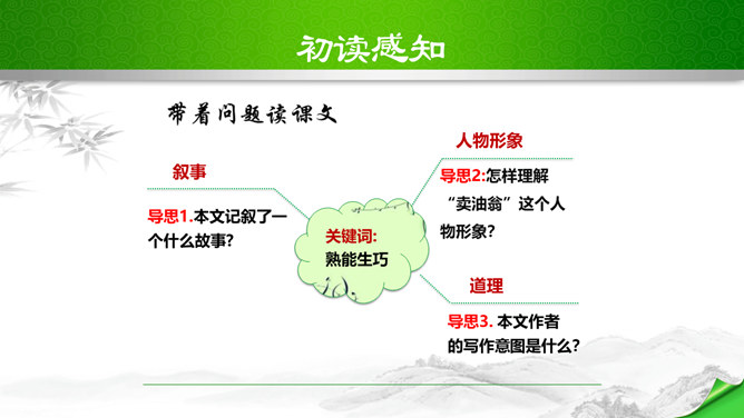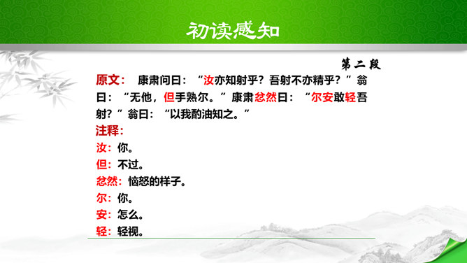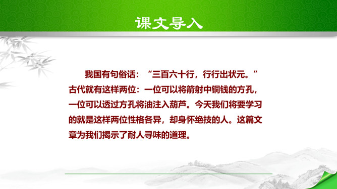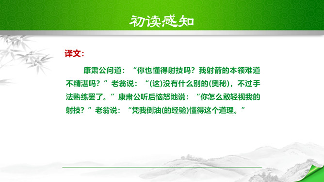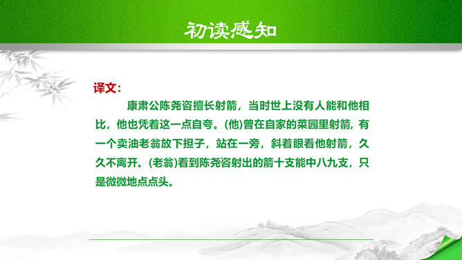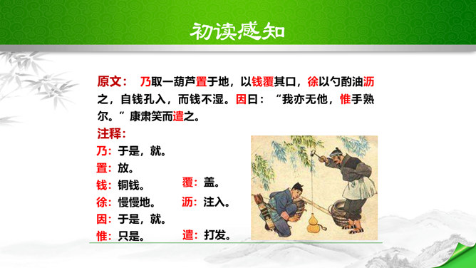 卖油翁凭什么这样评价陈尧咨的射箭本领?“以我酌油知之”凭我酌油的经验知道这个道理。康肃问曰:“汝亦知射乎?吾射不亦精乎?”连用两个问句表现了陈尧咨怎样的性格特点?先用一个疑问句,再用一个反问句,表现出陈尧咨因“善射”而“自矜”的性格特点。卖油翁说“我亦无他,惟手熟尔。”表明了什么?是表明自己并非如陈尧咨所认为的“轻吾射”,呼应了上文对陈尧咨射技的评价,再次说明“熟能生巧”的道理。二是表明了卖油翁不卑不亢、沉着镇静的性格特点。“康肃笑而遣之。”“笑”写出了什么? 写出了陈尧咨看到卖油翁高超的技艺心服口服,认输了。所属专题:卖油翁ppt。