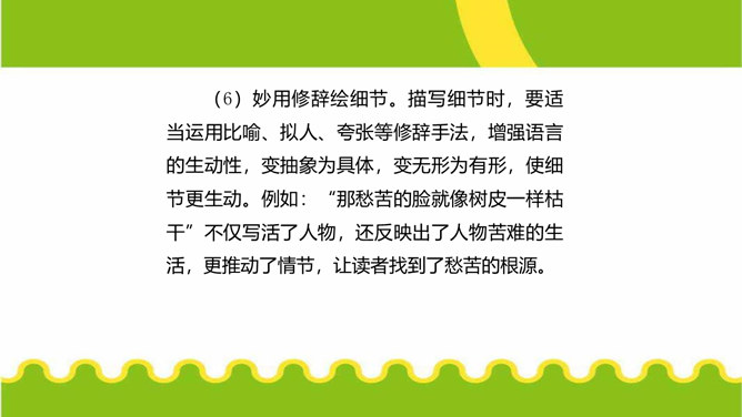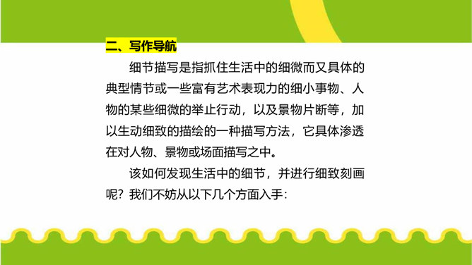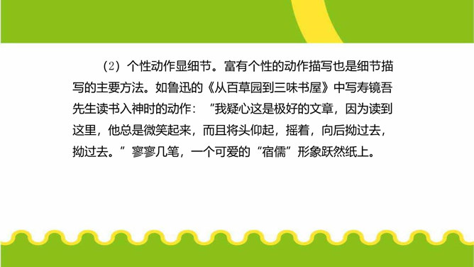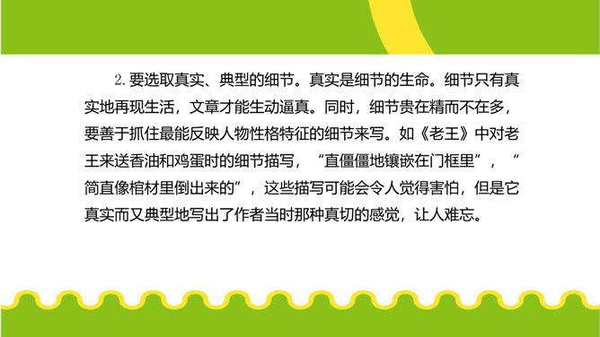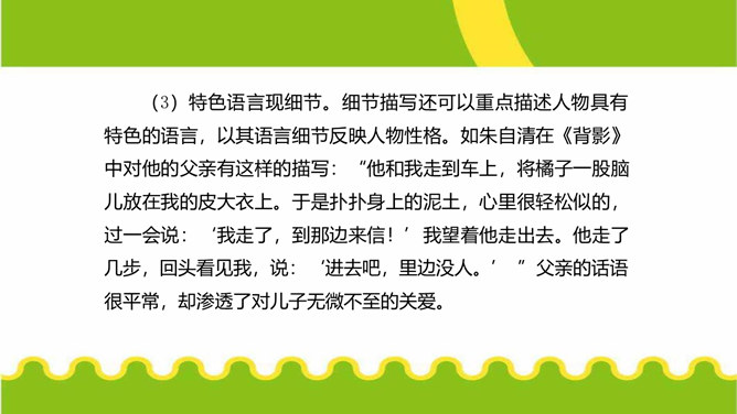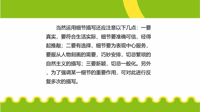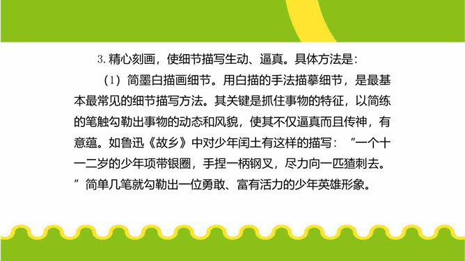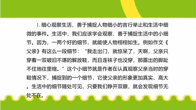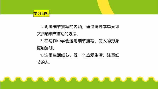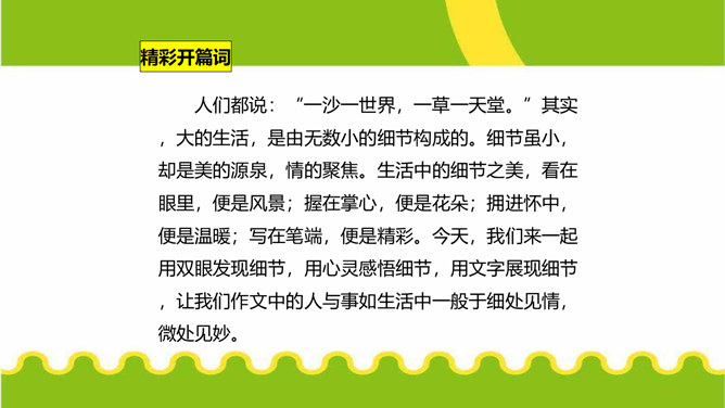 人们都说:“一沙一世界,一草一天堂。”其实,大的生活,是由无数小的细节构成的。细节虽小,却是美的源泉,情的聚焦。生活中的细节之美,看在眼里,便是风景;握在掌心,便是花朵;拥进怀中,便是温暖;写在笔端,便是精彩。今天,我们来一起用双眼发现细节,用心灵感悟细节,用文字展现细节,让我们作文中的人与事如生活中一般于细处见情,微处见妙。明确细节描写的内涵,通过研讨本单元课文归纳细节描写的方法。在写作中学会运用细节描写,使人物形象更加鲜明。注重生活细节,做一个热爱生活、注重细节的人。所属专题:抓住细节ppt。