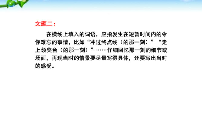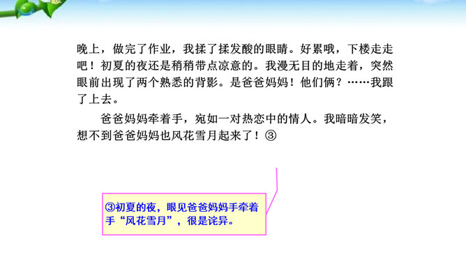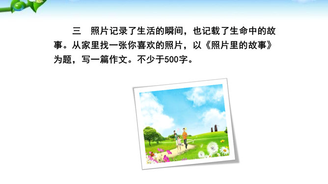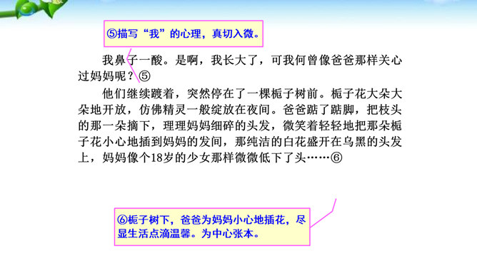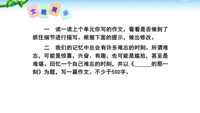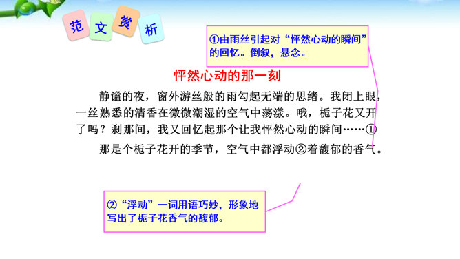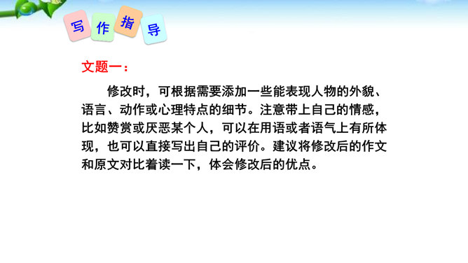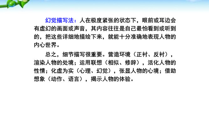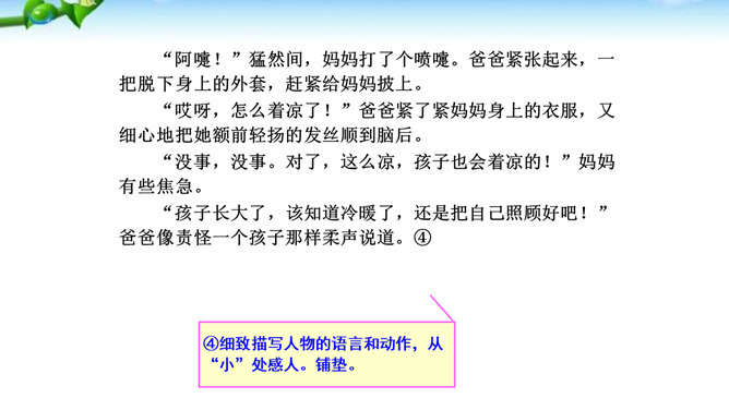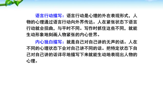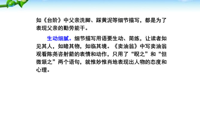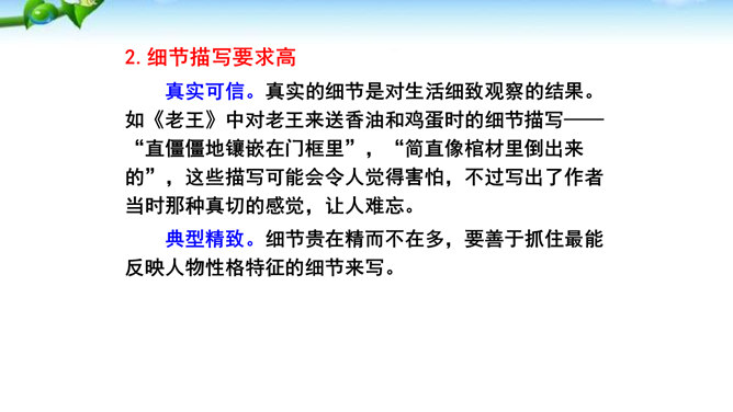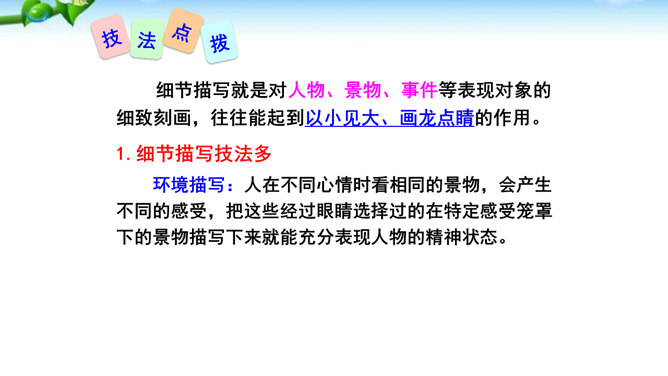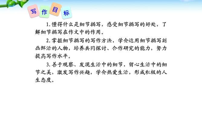 1.懂得什么是细节描写,感受细节描写的好处,了解细节描写在作文中的作用。2.掌握细节描写的写作方法,学会运用细节描写刻画鲜活的人物,培养共同探讨、合作研究的能力,努力提高写作水平。3.善于观察、发现生活中的细节,留心生活中的细节之美,激发写作兴趣,学会热爱生活,形成积极的人生态度。环境描写:人在不同心情时看相同的景物,会产生不同的感受,把这些经过眼睛选择过的在特定感受笼罩下的景物描写下来就能充分表现人物的精神状态。语言行动描写:语言行动是心理的外在表现形式,人物的心理通过语言行动向外界传达。所属专题:抓住细节ppt。