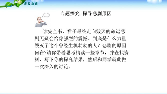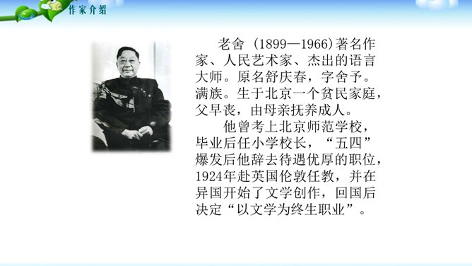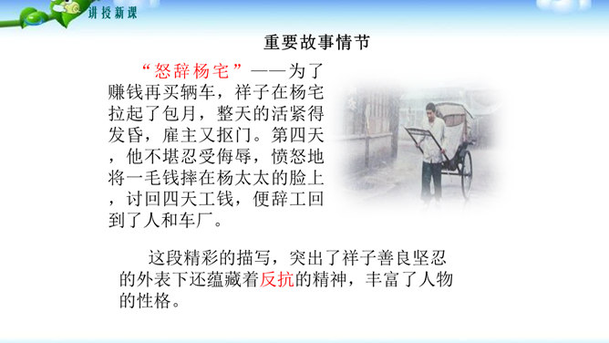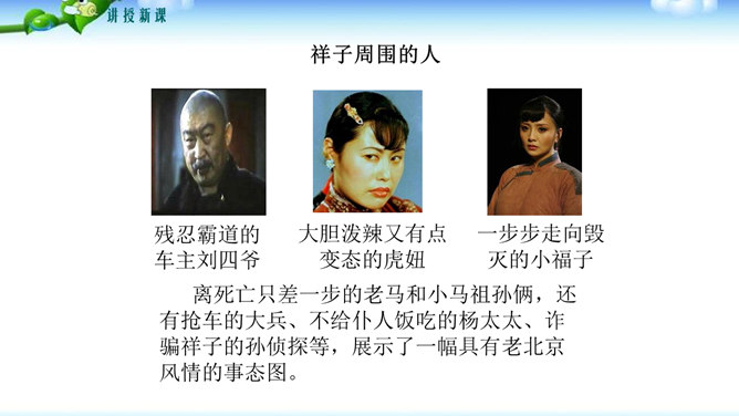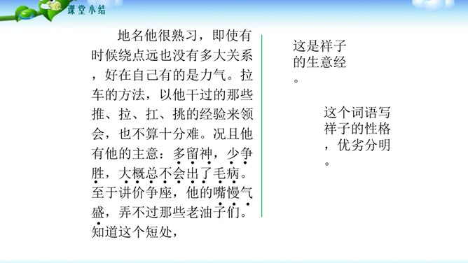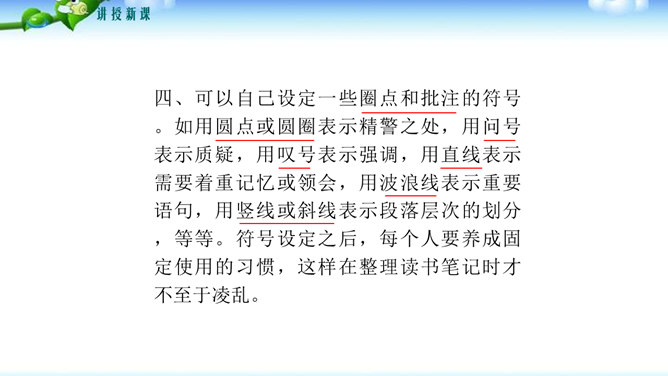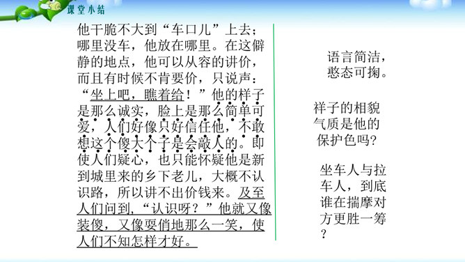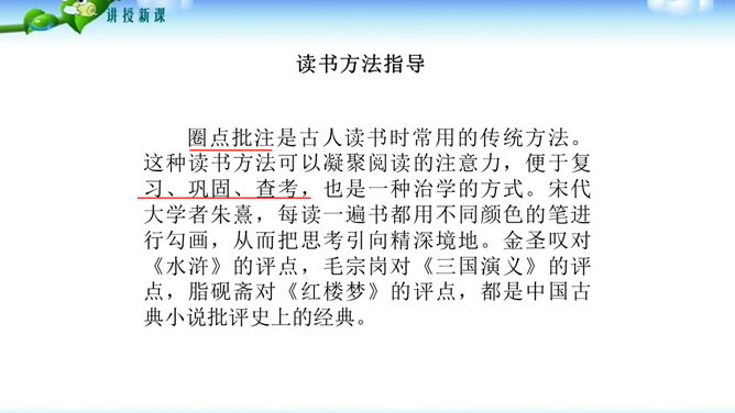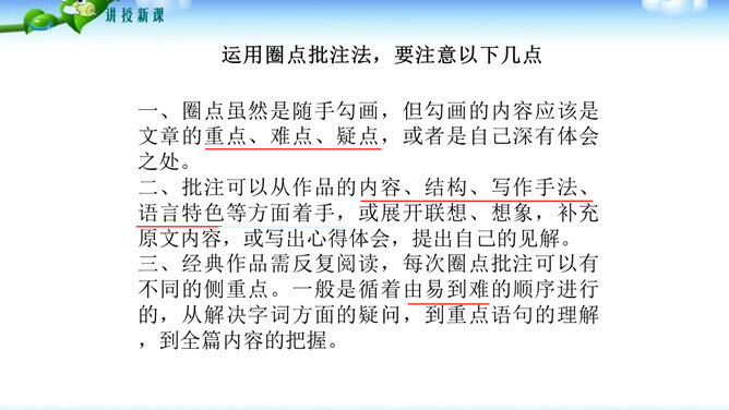 一、圈点虽然是随手勾画,但勾画的内容应该是文章的重点、难点、疑点,或者是自己深有体会之处。二、批注可以从作品的内容、结构、写作手法、语言特色等方面着手,或展开联想、想象,补充原文内容,或写出心得体会,提出自己的见解。三、经典作品需反复阅读,每次圈点批注可以有不同的侧重点。一般是循着由易到难的顺序进行的,从解决字词方面的疑问,到重点语句的理解,到全篇内容的把握。四、可以自己设定一些圈点和批注的符号。如用圆点或圆圈表示精警之处,用问号表示质疑,用叹号表示强调,用直线表示需要着重记忆或领会。所属专题:骆驼祥子ppt。
