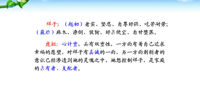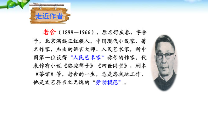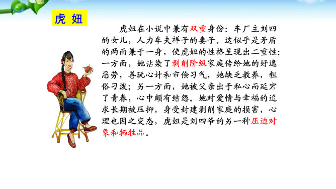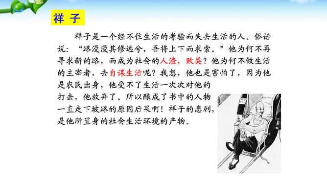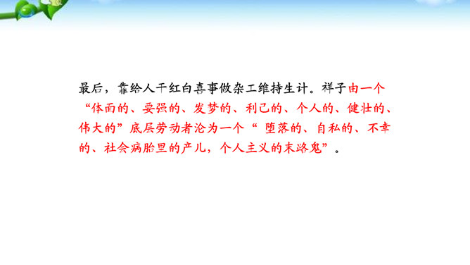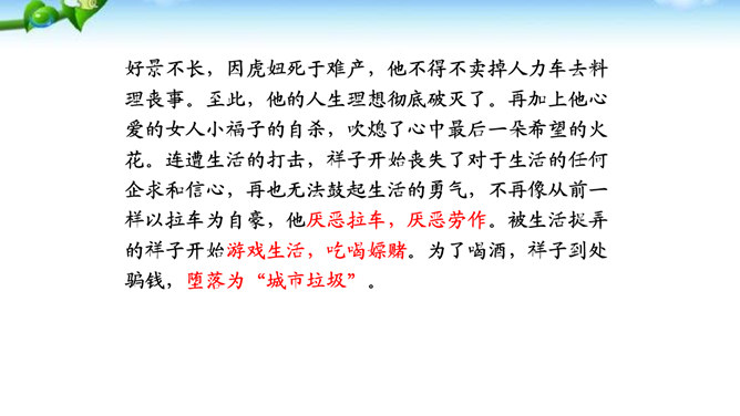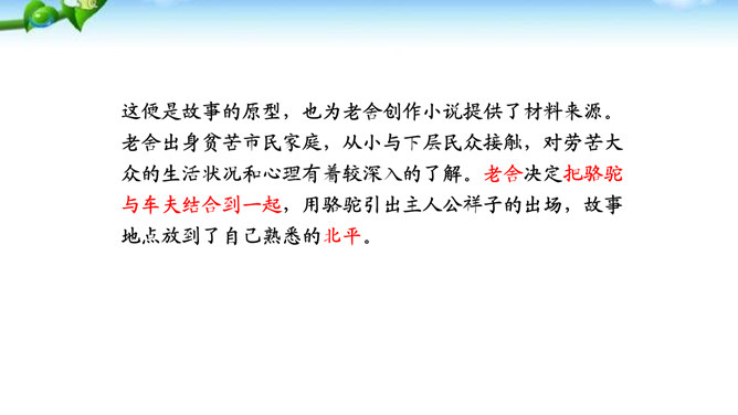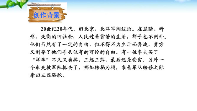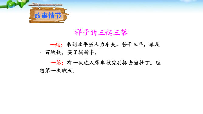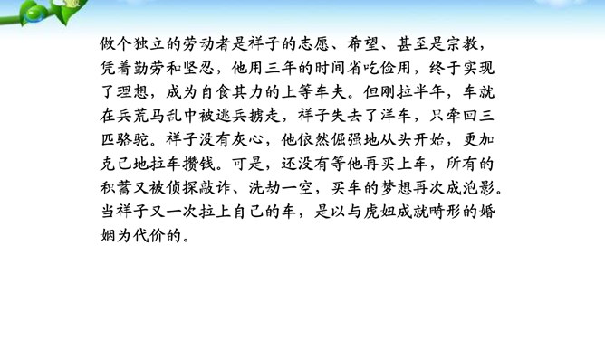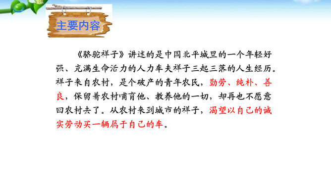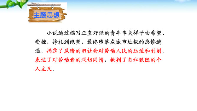 请问小说的题目“骆驼祥子”主要包含哪些含义?有三层含义:1、点明小说的主人公——祥子;2、概括小说的一个主要情节——骆驼祥子称号的得来;3、揭示主人公的性格——像骆驼一样吃苦耐劳、沉默憨厚。请从怒辞杨宅和孙侦探的敲诈这两个情节中选择其一进行概括。怒辞杨宅:祥子在杨先生家拉包月。杨先生有两位太太,还有一大群孩子。祥子每天接送完这个,又要去伺候那个,同时还要干杂活。更可恨的是,主人不把仆人当人看,食宿很差。祥子有一天在送走一位女客人后,因为女主人的无理,忍无可忍,一怒之下,辞去了这份工作。所属专题:骆驼祥子ppt。