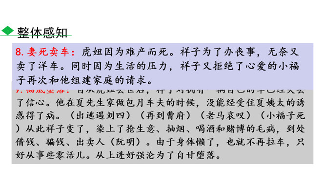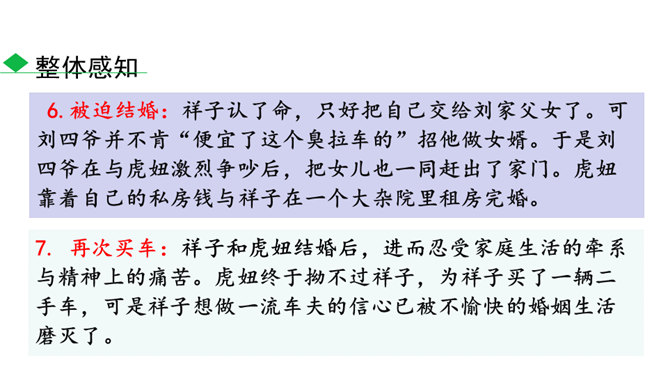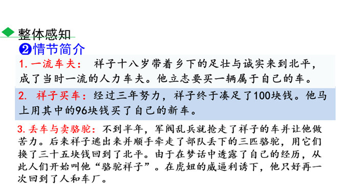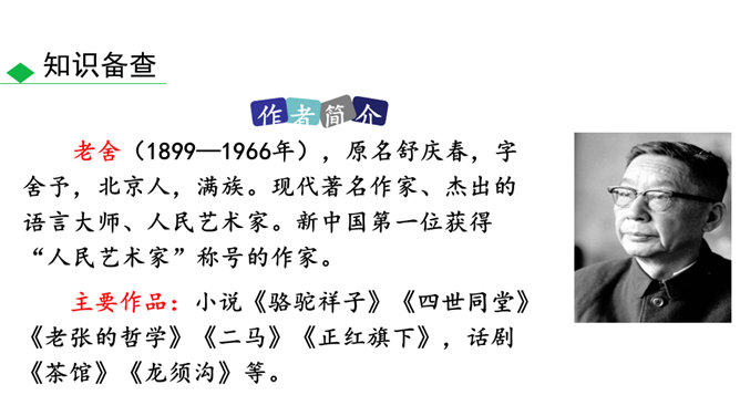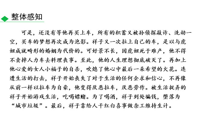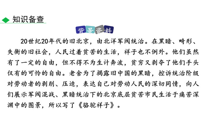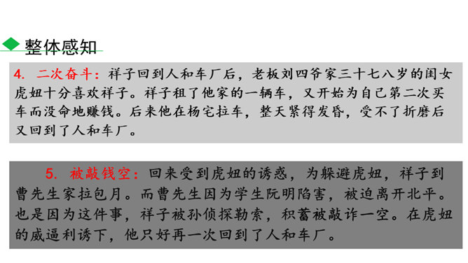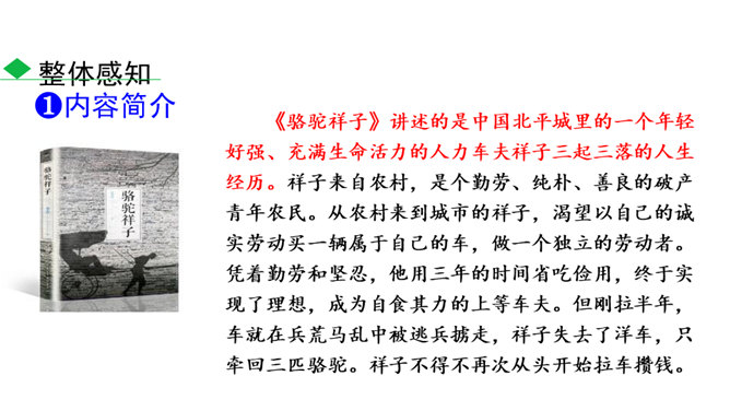 本书以主人公祥子的奋斗和毁灭作为线索,可以说是祥子一生的记录。请根据作品的内容,写一篇祥子的小传,完整地勾勒出祥子的经历。写完后注意对照作品进一步修改,力求做到准确无误。读完全书,祥子最终走向毁灭的命运悲剧无疑会给你强烈的震撼。到底是什么力量毁灭了这个曾经生气勃勃的人?悲剧的原因何在?带着这些问题精读相关章节,并查找资料,写下你的探究结果,然后和同学就此做一次深入的讨论。书中除了祥子外,还写了形形色色的洋车夫,留下了关于老北京洋车夫这一行当的珍贵历史记录。所属专题:骆驼祥子ppt。