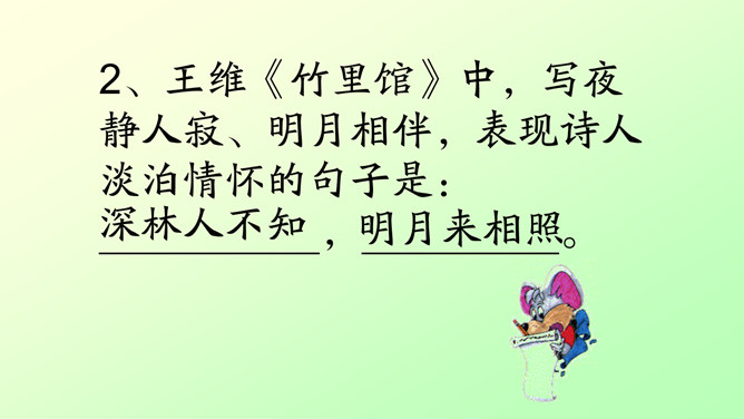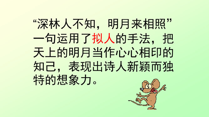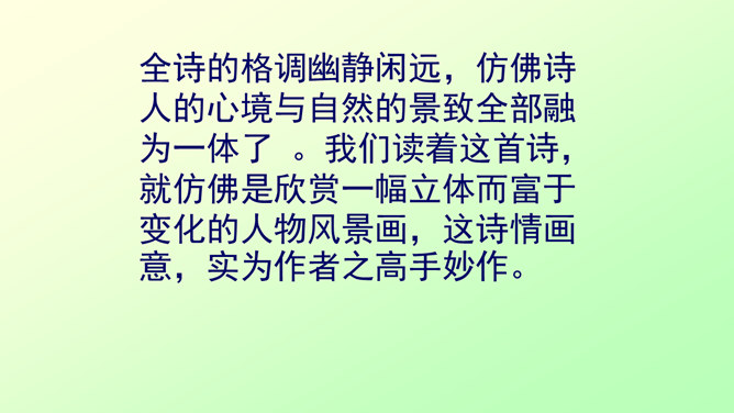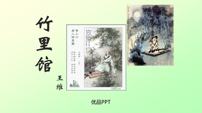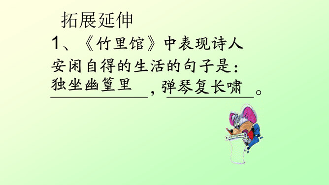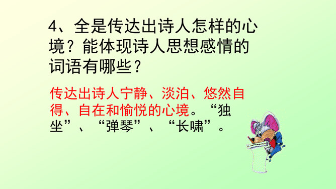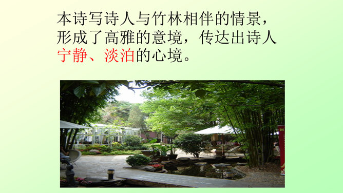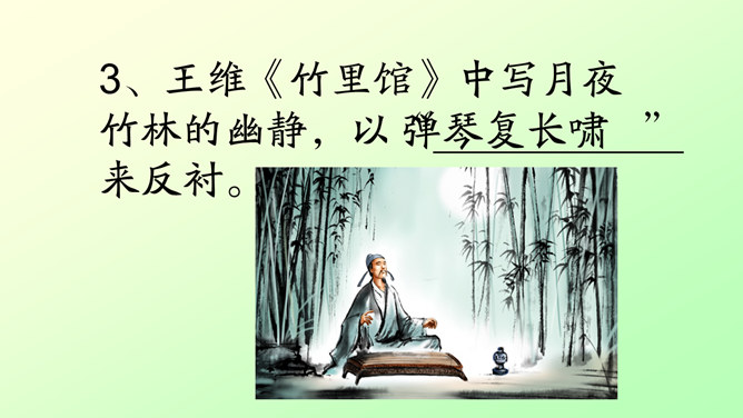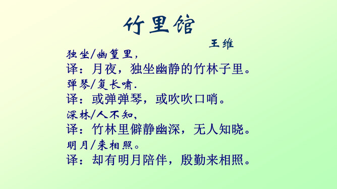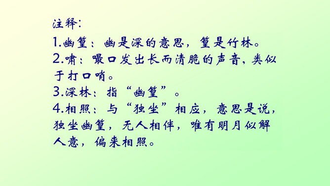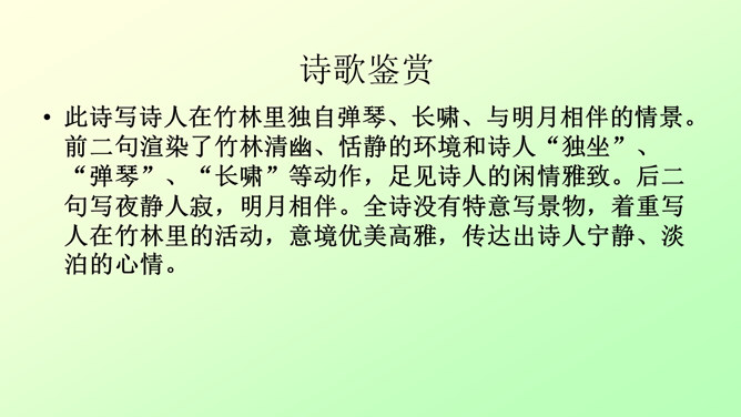 此诗写诗人在竹林里独自弹琴、长啸、与明月相伴的情景。前二句渲染了竹林清幽、恬静的环境和诗人“独坐”、“弹琴”、“长啸”等动作,足见诗人的闲情雅致。后二句写夜静人寂,明月相伴。全诗没有特意写景物,着重写人在竹林里的活动,意境优美高雅,传达出诗人宁静、淡泊的心情。“深林人不知,明月来相照”一句运用了拟人的手法,把天上的明月当作心心相印的知己,表现出诗人新颖而独特的想象力。全诗的格调幽静闲远,仿佛诗人的心境与自然的景致全部融为一体了。所属专题:竹里馆ppt。
