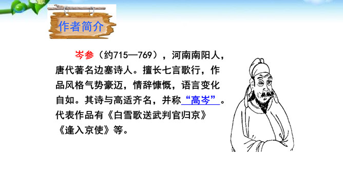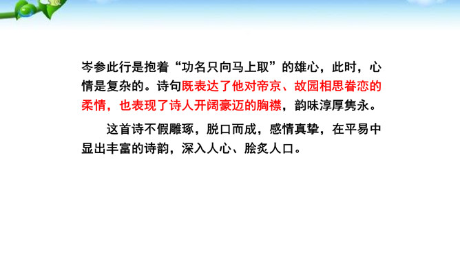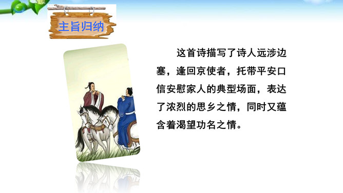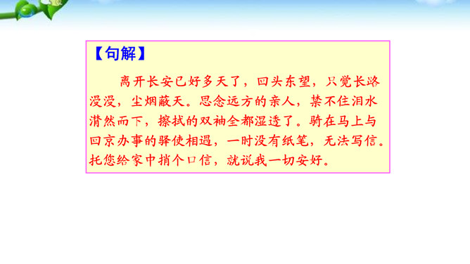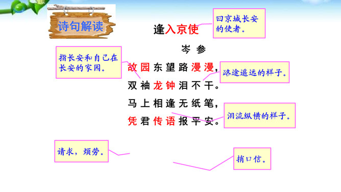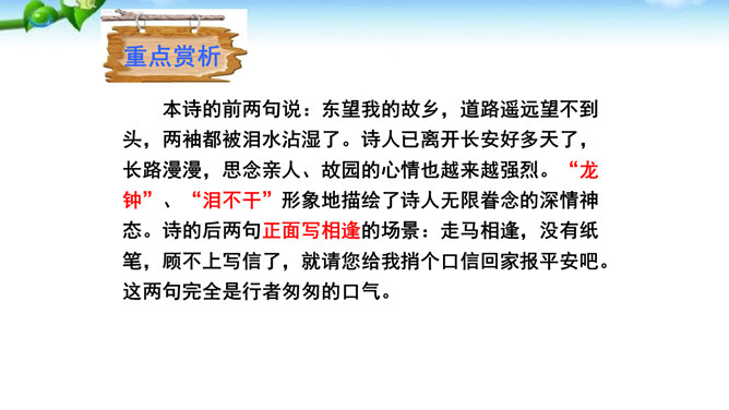 这首诗描写了诗人远涉边塞,逢回京使者,托带平安口信安慰家人的典型场面,表达了浓烈的思乡之情,同时又蕴含着渴望功名之情。本诗的前两句说:东望我的故乡,道路遥远望不到头,两袖都被泪水沾湿了。诗人已离开长安好多天了,长路漫漫,思念亲人、故园的心情也越来越强烈。“龙钟”、“泪不干”形象地描绘了诗人无限眷念的深情神态。诗的后两句正面写相逢的场景:走马相逢,没有纸笔,顾不上写信了,就请您给我捎个口信回家报平安吧。这两句完全是行者匆匆的口气。所属专题:逢入京使ppt。