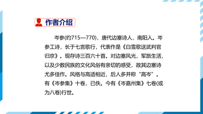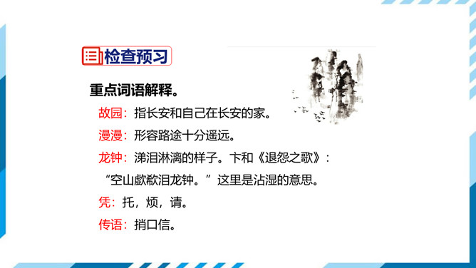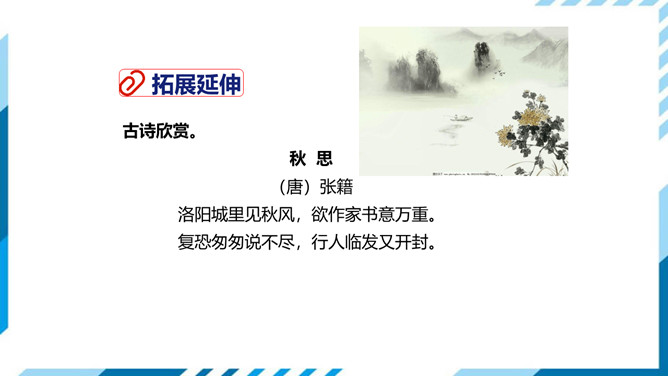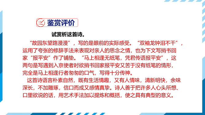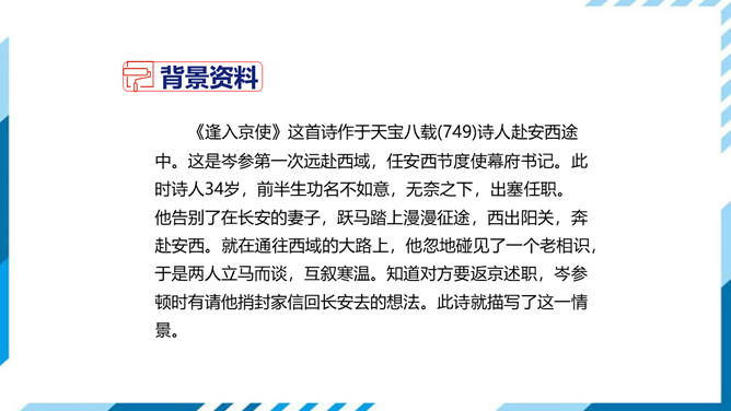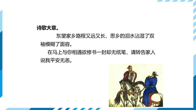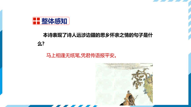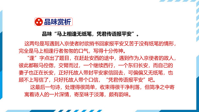 这两句是写遇到入京使者时欲捎书回家报平安又苦于没有纸笔的情形,完全是马上相逢行者匆匆的口气,写得十分传神。“逢”字点出了题目,在赶赴安西的途中,遇到作为入京使者的故人,彼此都鞍马倥偬,交臂而过,一个继续西行,一个东归长安,而自己的妻子也正在长安,正好托故人带封平安家信回去,可偏偏又无纸笔,也顾不上写信了,只好托故人带个口信,“凭君传语报平安”吧。这最后一句诗,处理得很简单,收束得很干净利落,但简净之中寄寓着诗人的一片深情,寄至味于淡薄,颇有韵味。所属专题:逢入京使ppt。