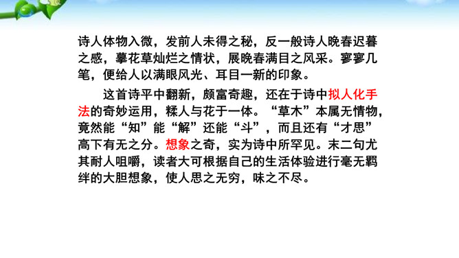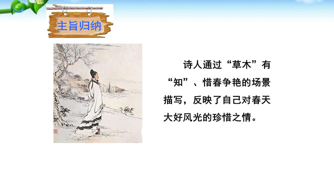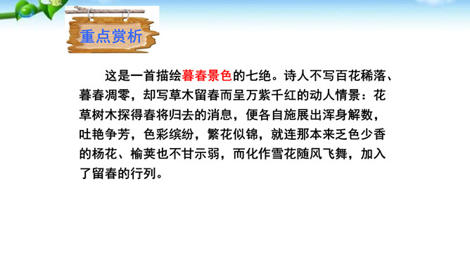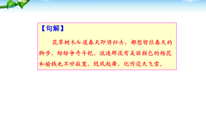 这是一首描绘暮春景色的七绝。诗人不写百花稀落、暮春凋零,却写草木留春而呈万紫千红的动人情景:花草树木探得春将归去的消息,便各自施展出浑身解数,吐艳争芳,色彩缤纷,繁花似锦,就连那本来乏色少香的杨花、榆荚也不甘示弱,而化作雪花随风飞舞,加入了留春的行列。诗人体物入微,发前人未得之秘,反一般诗人晚春迟暮之感,摹花草灿烂之情状,展晚春满目之风采。寥寥几笔,便给人以满眼风光、耳目一新的印象。所属专题:晚春ppt。