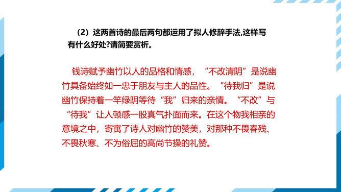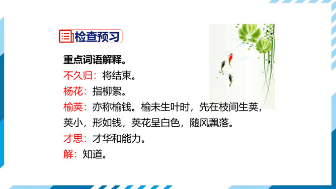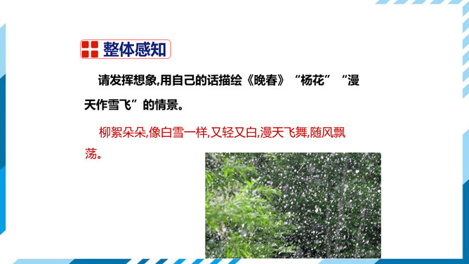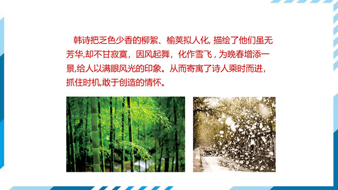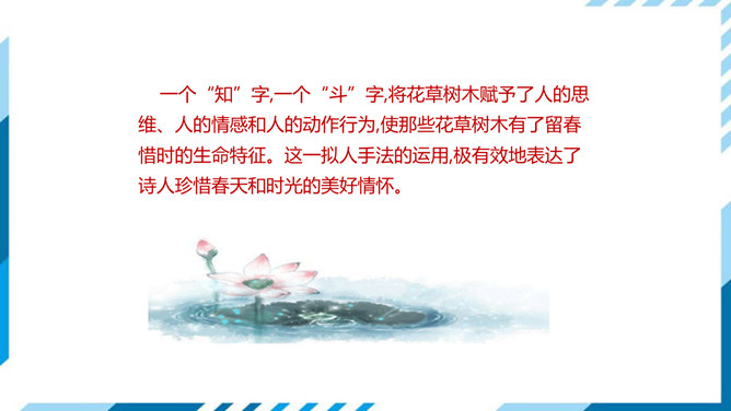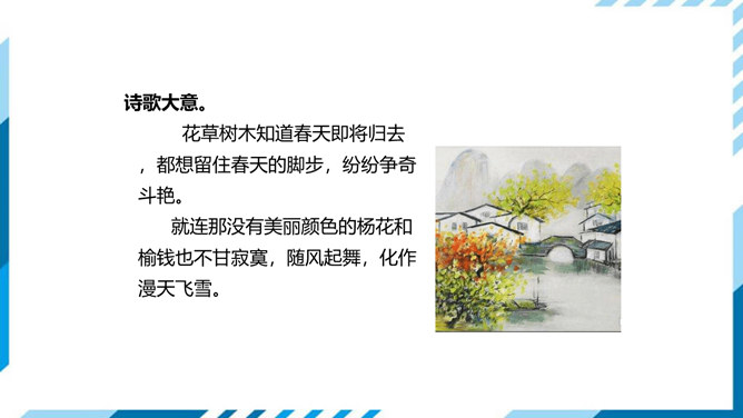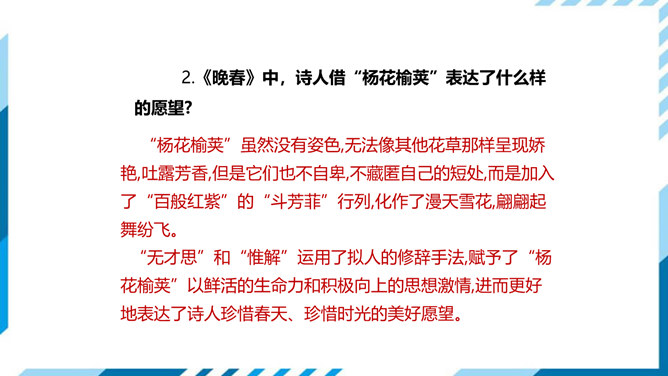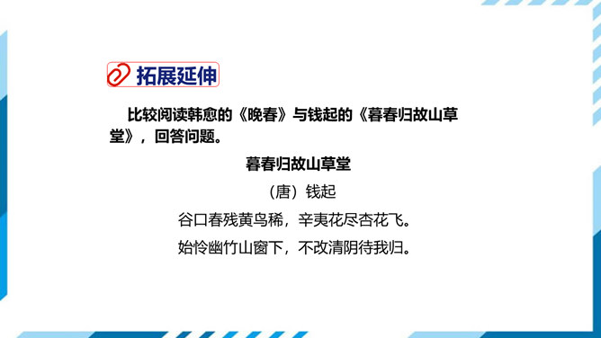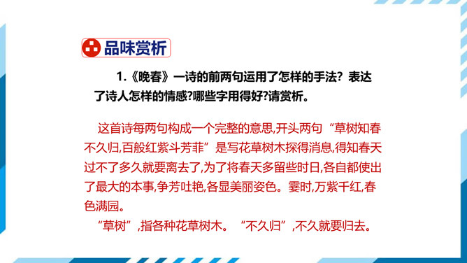 前两句运用了怎样的手法?表达了诗人怎样的情感?哪些字用得好?请赏析。这首诗每两句构成一个完整的意思,开头两句“草树知春不久归,百般红紫斗芳菲”是写花草树木探得消息,得知春天过不了多久就要离去了,为了将春天多留些时日,各自都使出了最大的本事,争芳吐艳,各显美丽姿色。霎时,万紫千红,春色满园。“草树”,指各种花草树木。“不久归”,不久就要归去。一个“知”字,一个“斗”字,将花草树木赋予了人的思维、人的情感和人的动作行为,使那些花草树木有了留春惜时的生命特征。这一拟人手法的运用,极有效地表达了诗人珍惜春天和时光的美好情怀。所属专题:晚春ppt。