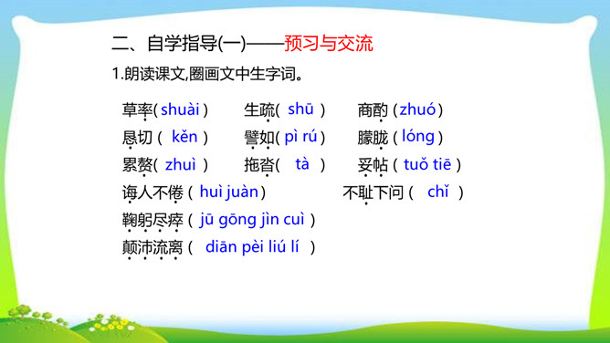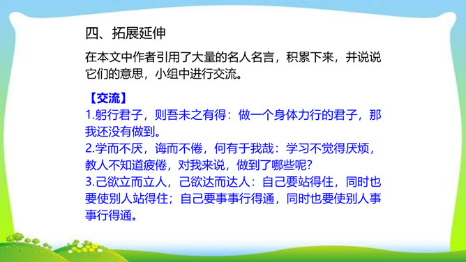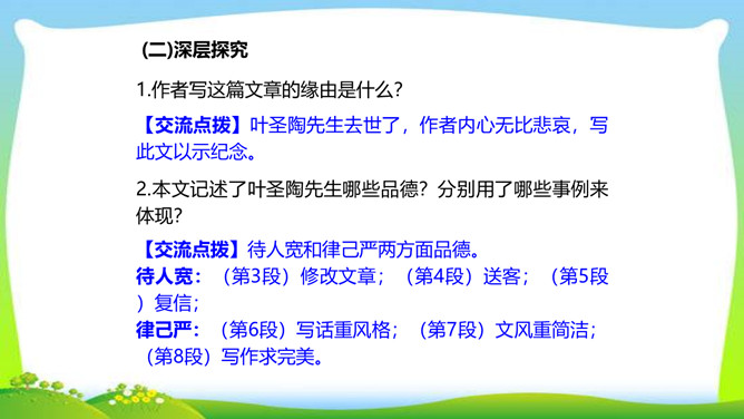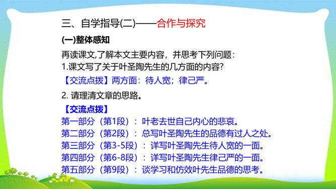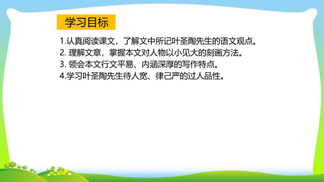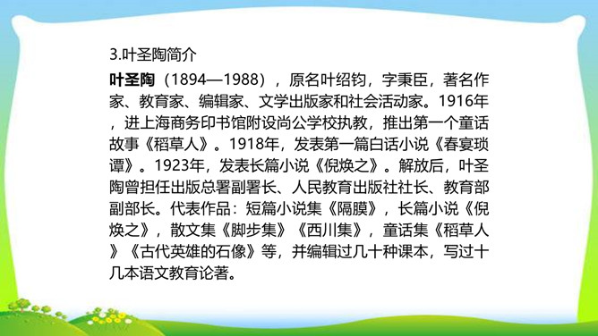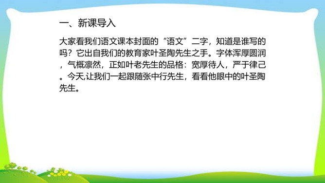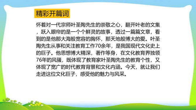 怀着对一代宗师叶圣陶先生的崇敬之心,翻开叶老的文集,跃入眼帘的是一个个鲜灵的故事,透过一篇篇文章,看到的是他那大海般宽容的胸怀,那天地般博大的爱。叶圣陶先生从事和关注教育工作70余年,是我国现代文化史上的巨子。他思想博大精深,著作等身,在文化教育界独领76年的风骚,既体现了教育家叶圣陶先生的教育个性,又体现了宽广的时代教育背景和文化内涵。今天,就让我们走进这位文化巨子,感受他的魅力与风采。所属专题:叶圣陶先生二三事ppt。