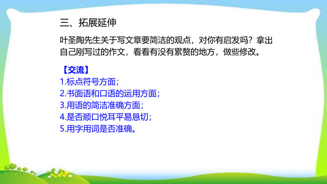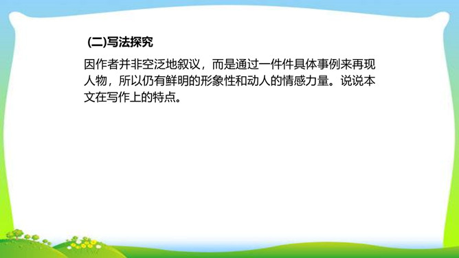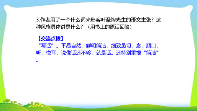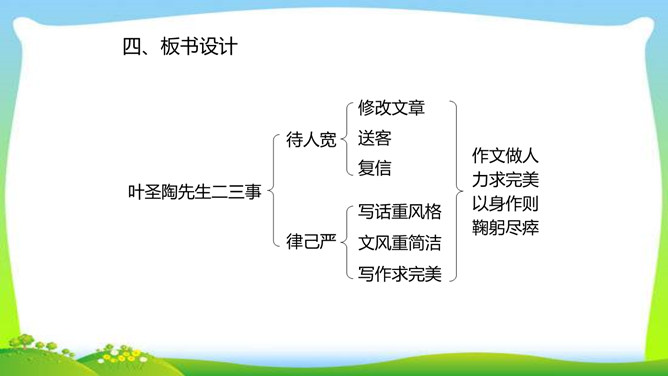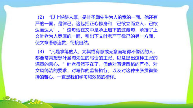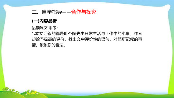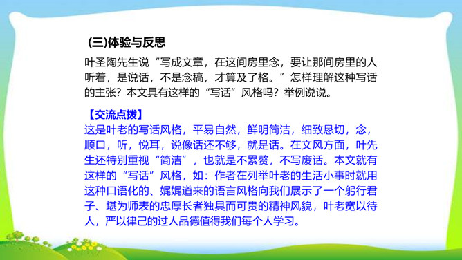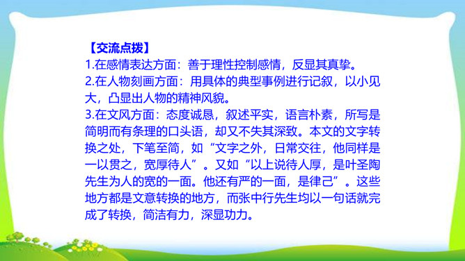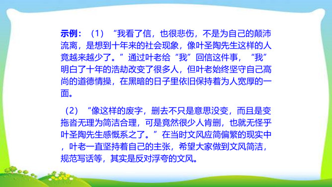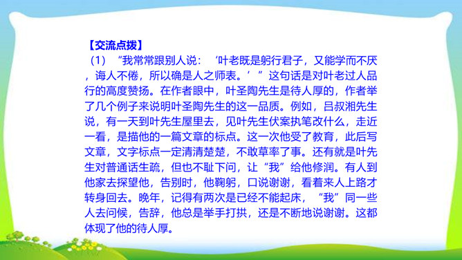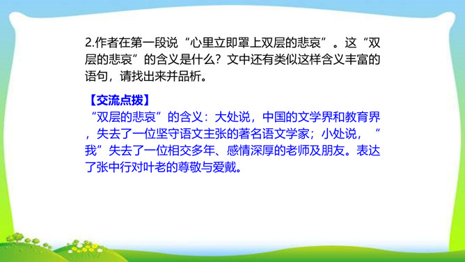 本文记叙的都是叶圣陶先生日常生活与工作中的小事,作者却给予极高的评价,找出文中评价性的语句,对照所记叙的事情,谈谈你的看法。作者在第一段说“心里立即罩上双层的悲哀”。这“双层的悲哀”的含义是什么?文中还有类似这样含义丰富的语句,请找出来并品析。“双层的悲哀”的含义:大处说,中国的文学界和教育界,失去了一位坚守语文主张的著名语文学家;小处说,“我”失去了一位相交多年、感情深厚的老师及朋友。表达了张中行对叶老的尊敬与爱戴。所属专题:叶圣陶先生二三事ppt。