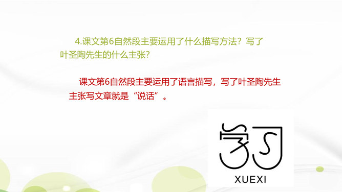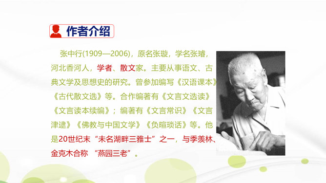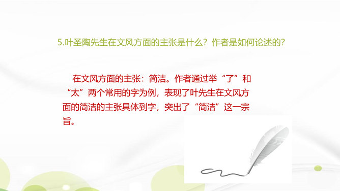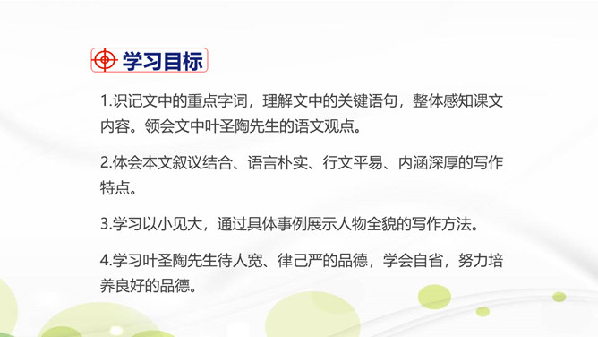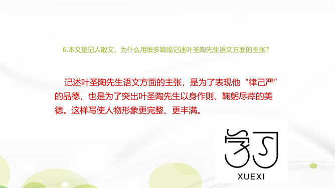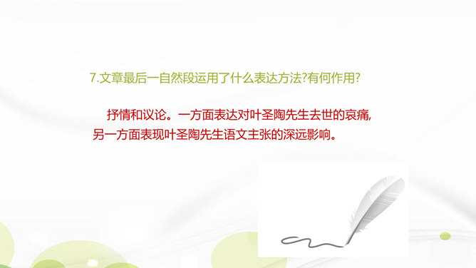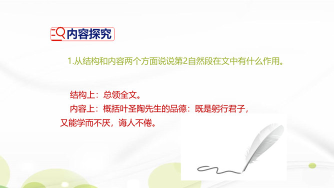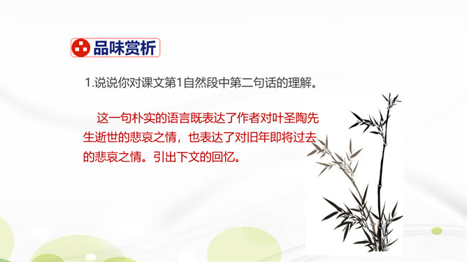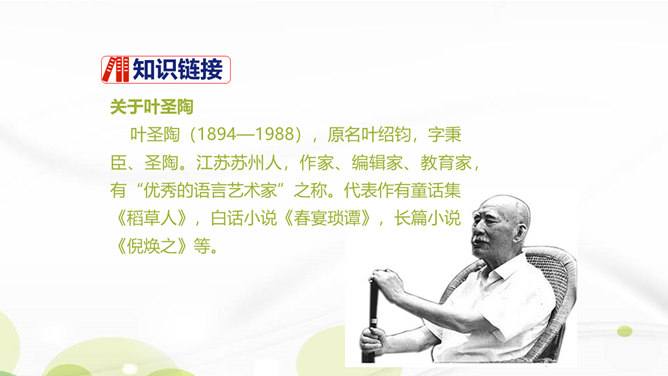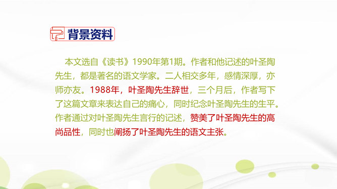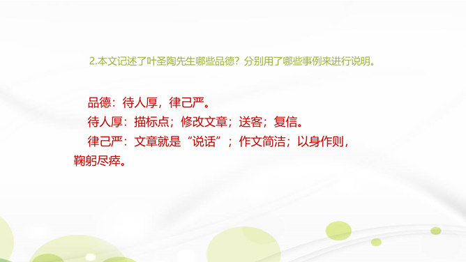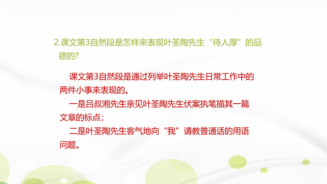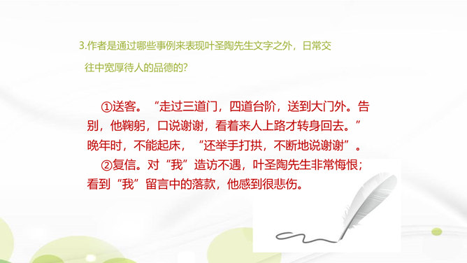 说说你对课文第1自然段中第二句话的理解。这一句朴实的语言既表达了作者对叶圣陶先生逝世的悲哀之情,也表达了对旧年即将过去的悲哀之情。引出下文的回忆。“凡是同叶圣陶先生有些交往的,无不为他的待人厚而深受感动。”你是如何理解这句话的?一句是总起句、过渡句,自然引出下文叶圣陶先生“待人厚”的事例。“无不……”这一双重否定句强调了叶圣陶先生的品德——待人厚。分析“有一天到叶先生屋里去,见叶先生伏案执笔改什么,走近一看,是描他的一篇文章的标点”这句话?所属专题:叶圣陶先生二三事ppt。