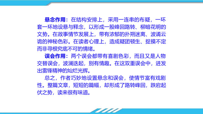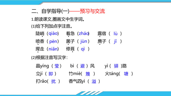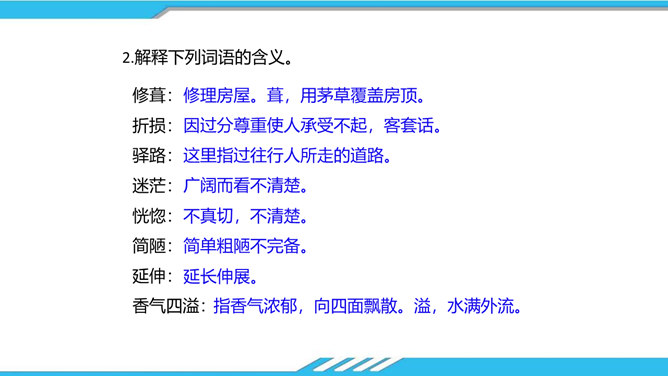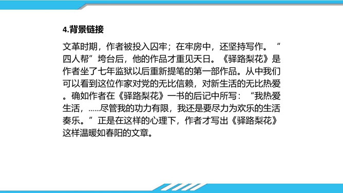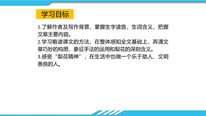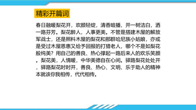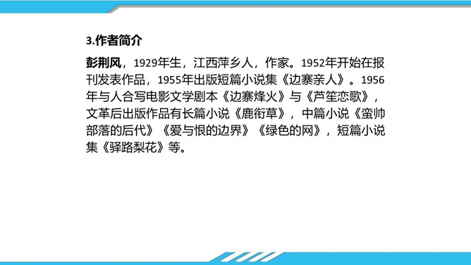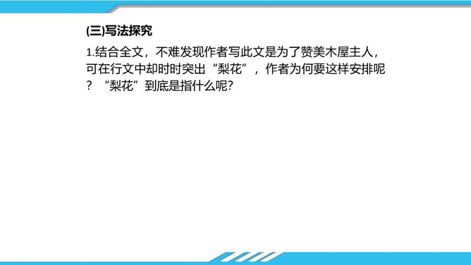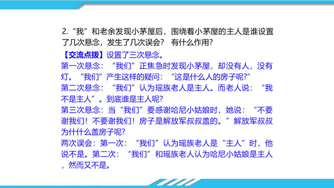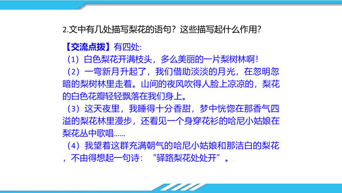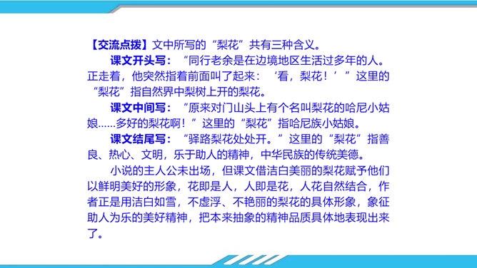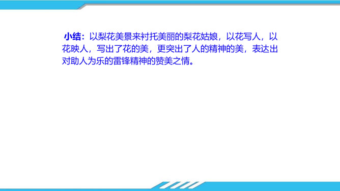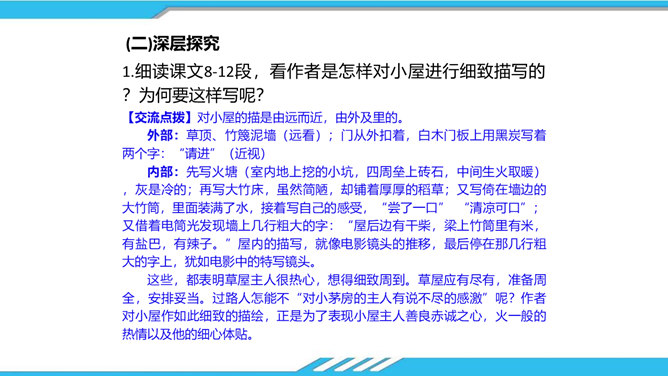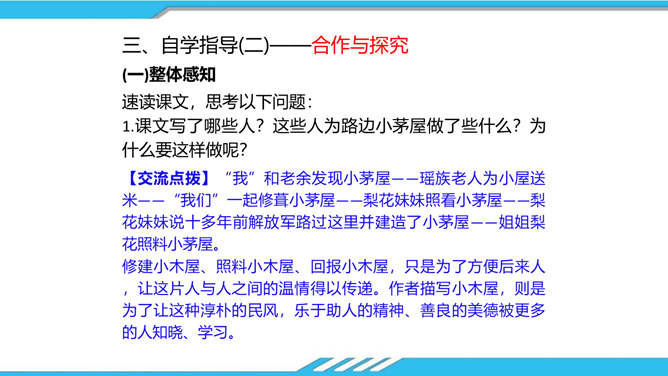 速读课文,思考以下问题:课文写了哪些人?这些人为路边小茅屋做了些什么?为什么要这样做呢?“我”和老余发现小茅屋——瑶族老人为小屋送米——“我们”一起修葺小茅屋——梨花妹妹照看小茅屋——梨花妹妹说十多年前解放军路过这里并建造了小茅屋——姐姐梨花照料小茅屋。修建小木屋、照料小木屋、回报小木屋,只是为了方便后来人,让这片人与人之间的温情得以传递。作者描写小木屋,则是为了让这种淳朴的民风,乐于助人的精神、善良的美德被更多的人知晓、学习。所属专题:驿路梨花ppt。