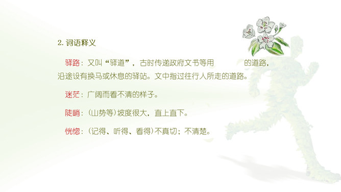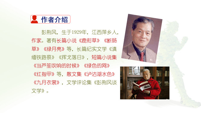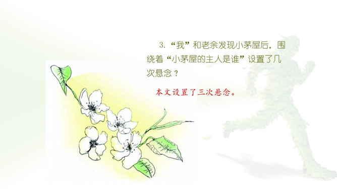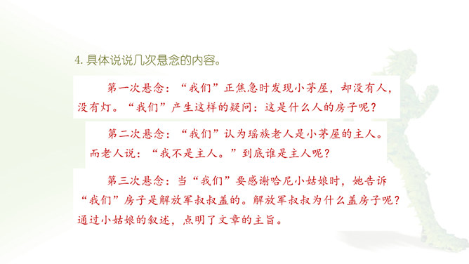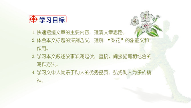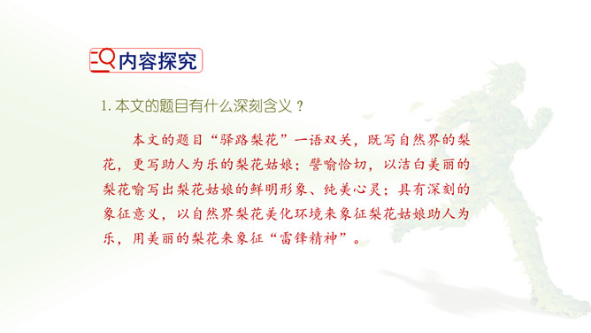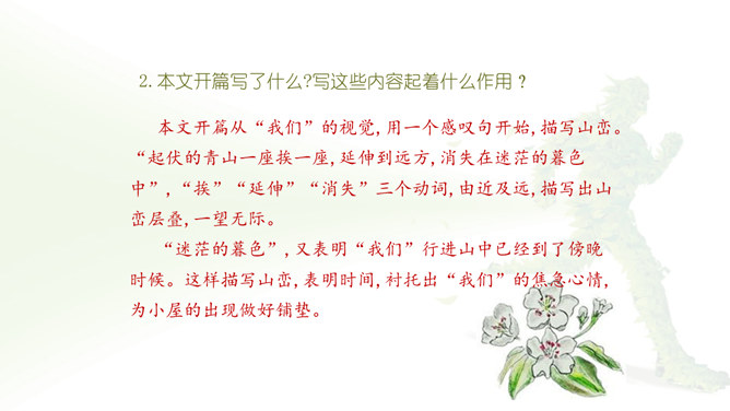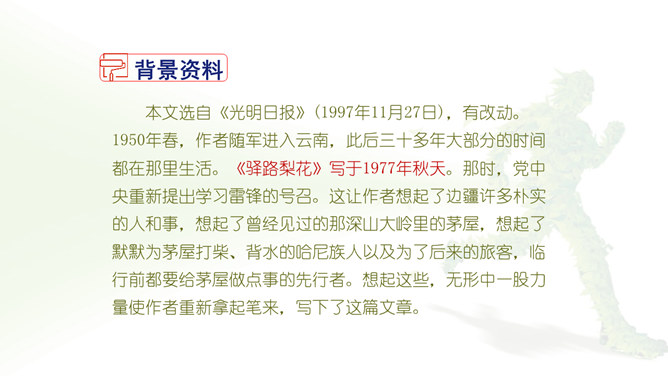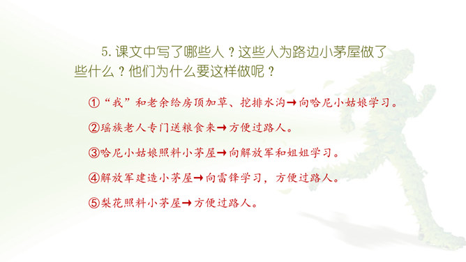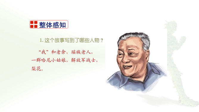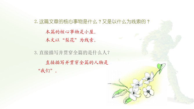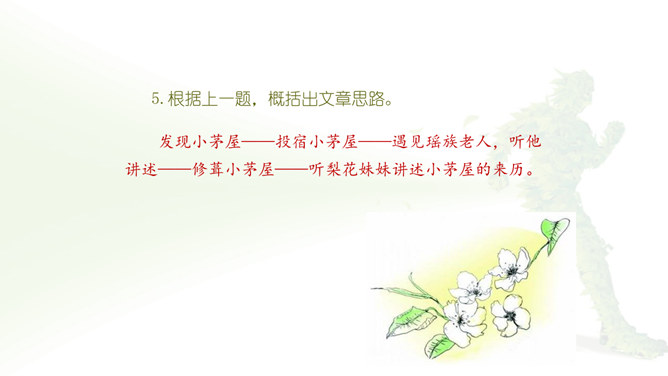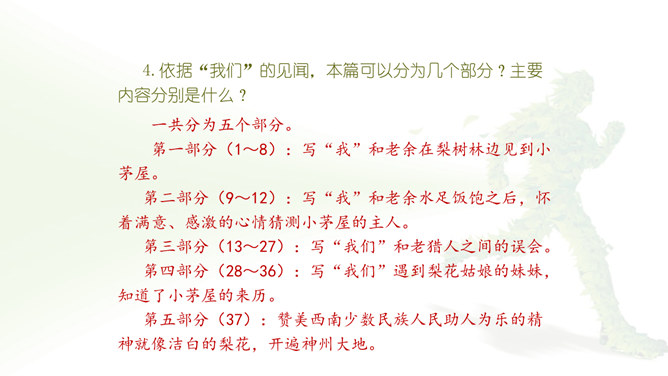 直接描写并贯穿全篇的是什么人?直接描写并贯穿全篇的人物是“我们”。依据“我们”的见闻,本篇可以分为几个部分?主要内容分别是什么?一共分为五个部分。第一部分(1~8):写“我”和老余在梨树林边见到小茅屋。第二部分(9~12):写“我”和老余水足饭饱之后,怀着满意、感激的心情猜测小茅屋的主人。第三部分(13~27):写“我们”和老猎人之间的误会。第四部分(28~36):写“我们”遇到梨花姑娘的妹妹,知道了小茅屋的来历。第五部分(37):赞美西南少数民族人民助人为乐的精神就像洁白的梨花,开遍神州大地。所属专题:驿路梨花ppt。