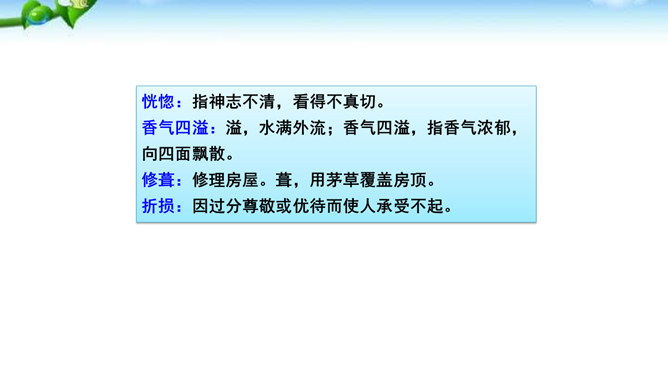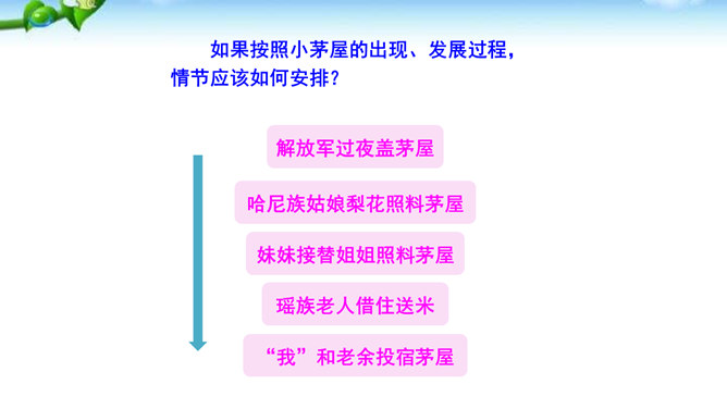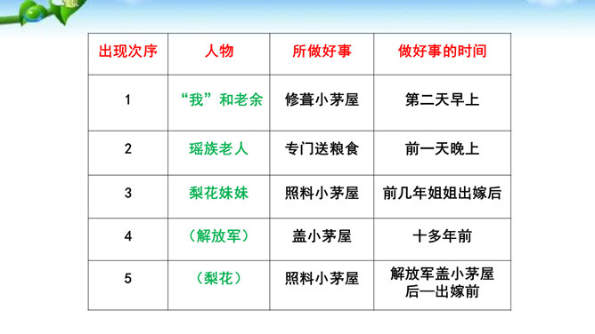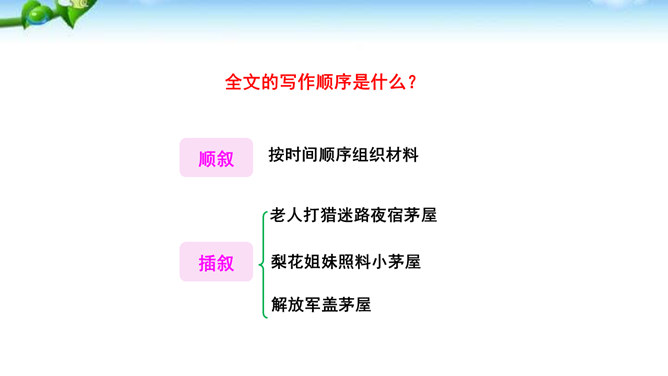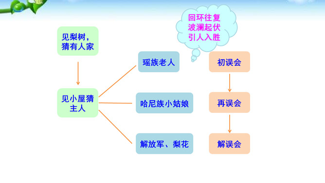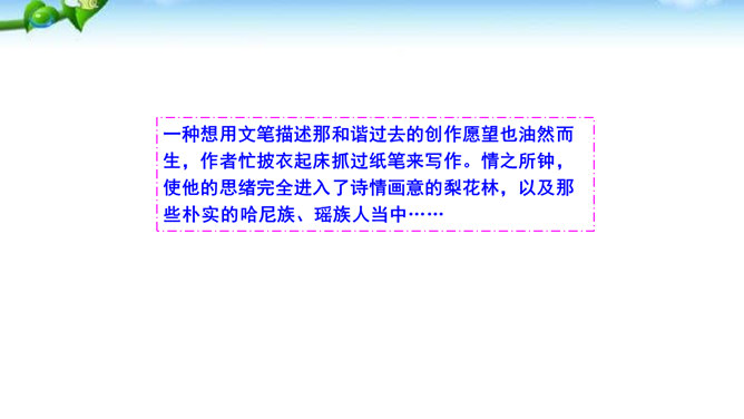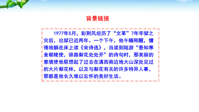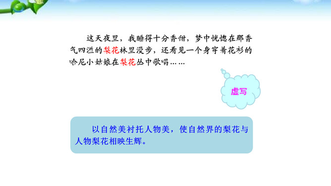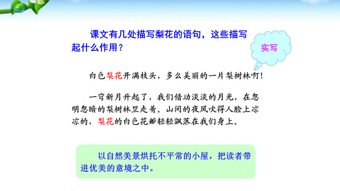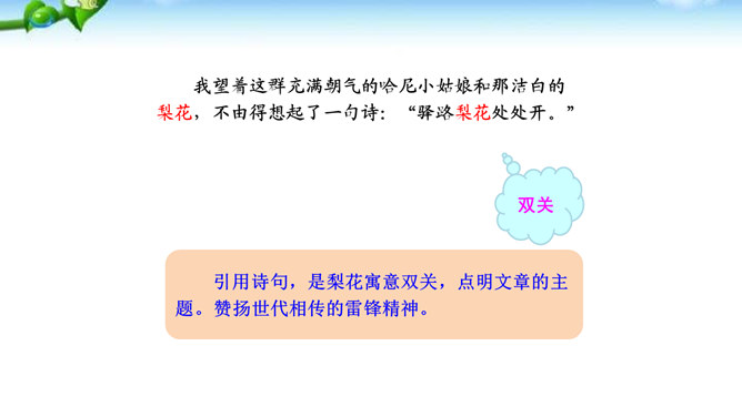 课文有几处描写梨花的语句,这些描写起什么作用?以自然美景烘托不平常的小屋,把读者带进优美的意境之中。以自然美衬托人物美,使自然界的梨花与人物梨花相映生辉。引用诗句,是梨花寓意双关,点明文章的主题。赞扬世代相传的雷锋精神。通过叙述一群哈尼族小姑娘在解放军全心全意为人民群众服务的思想影响下,甘当无名英雄,热情帮助有困难过路群众的事迹,显示了社会主义祖国处处有温暖的动人场面,歌颂了各族人民之间互相关心爱护的生动的精神面貌。所属专题:驿路梨花ppt。