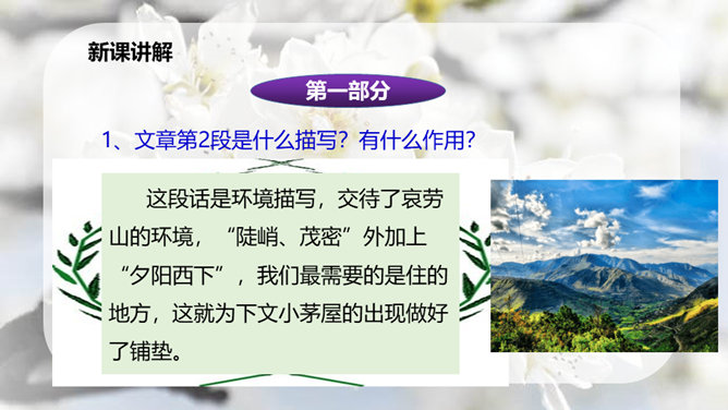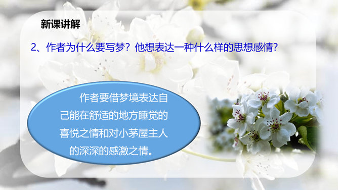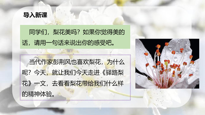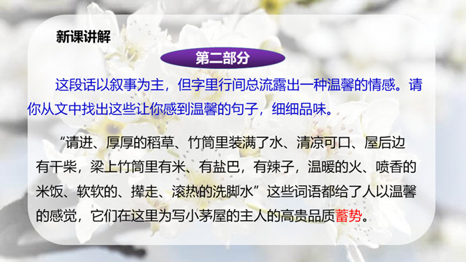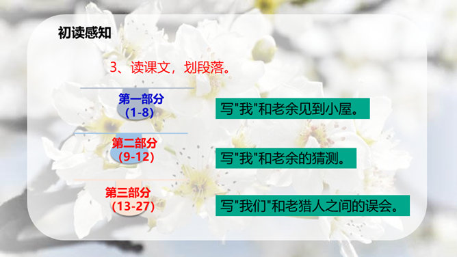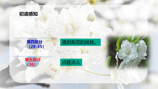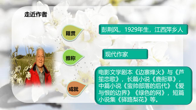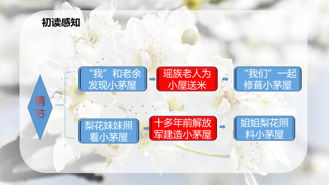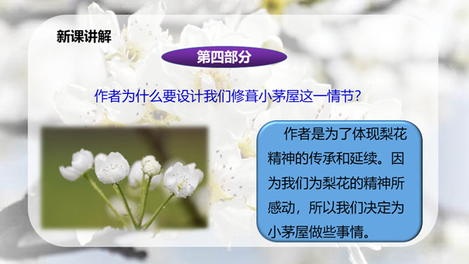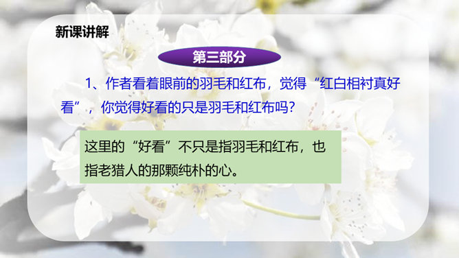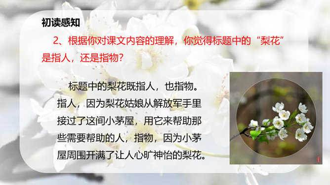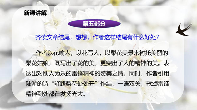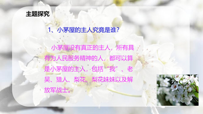 读文章结尾,想想,作者这样结尾有什么好处?作者以花喻人,以花写人,以梨花美景来衬托美丽的梨花姑娘,既写出了花的美,更突出了人的精神的美。表达出对助人为乐的雷锋精神的赞美之情。同时,作者引用陆游的诗“驿路梨花处处开”作结,一语双关,歌颂雷锋精神到处都在发扬光大。小茅屋的主人究竟是谁?小茅屋没有真正的主人,所有具有为人民服务精神的人,都可以算是小茅屋的主人,包括“我”、老吴、猎人、梨花、梨花妹妹以及解放军战士。本文通过这些人物想要表达一个什么主题?所属专题:驿路梨花ppt。