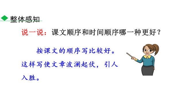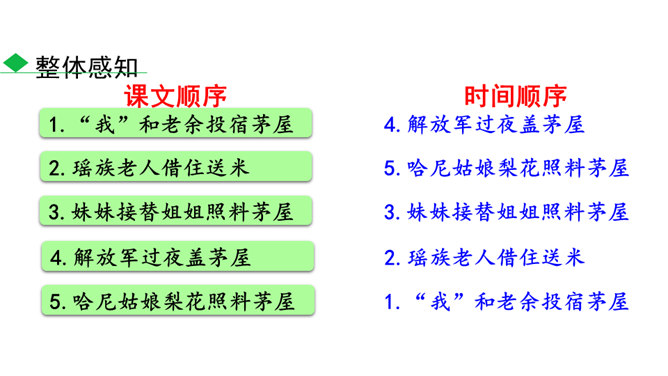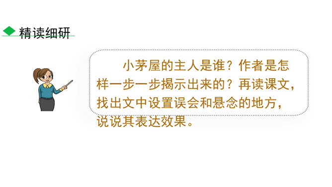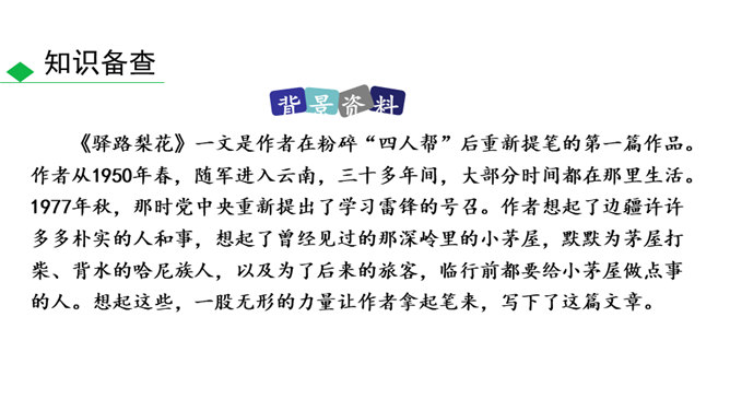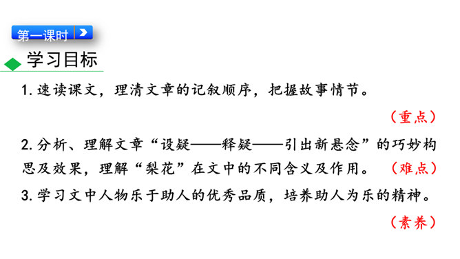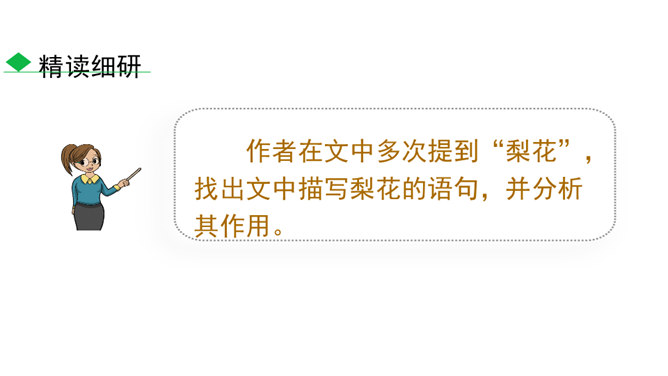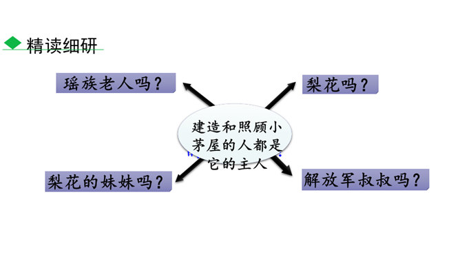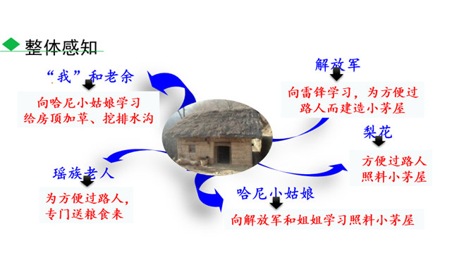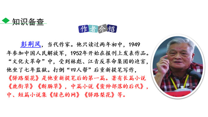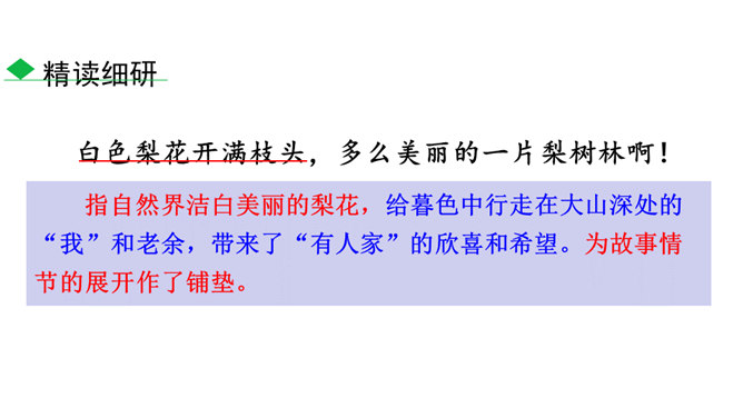 说一说:课文顺序和时间顺序哪一种更好?按课文的顺序写比较好。这样写使文章波澜起伏,引人入胜。小茅屋的主人是谁?作者是怎样一步一步揭示出来的?再读课文,找出文中设置误会和悬念的地方,说说其表达效果。悬念一:初见小屋,主人是谁?悬念二:不是瑶族老人,谁是主人?悬念三:解放军为什么建造小茅屋?通过悬念和误会的安排和展开,使文章波澜起伏、扣人心弦,增强了读者的阅读兴趣。“驿路梨花”引用南宋诗人陆游的诗句,吸引了读者,也是全文的线索,既写出了在哀牢山那偏远、冷寂的深山老林中小茅屋边上盛开的梨花的美丽。所属专题:驿路梨花ppt。