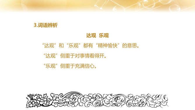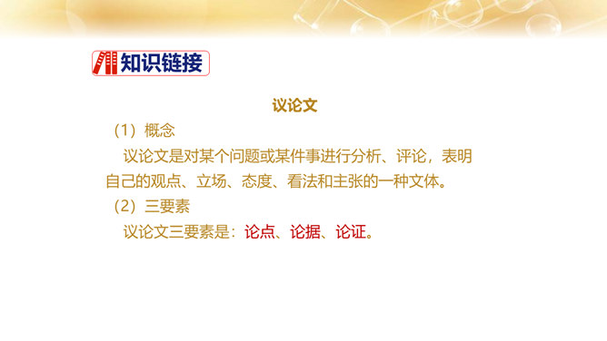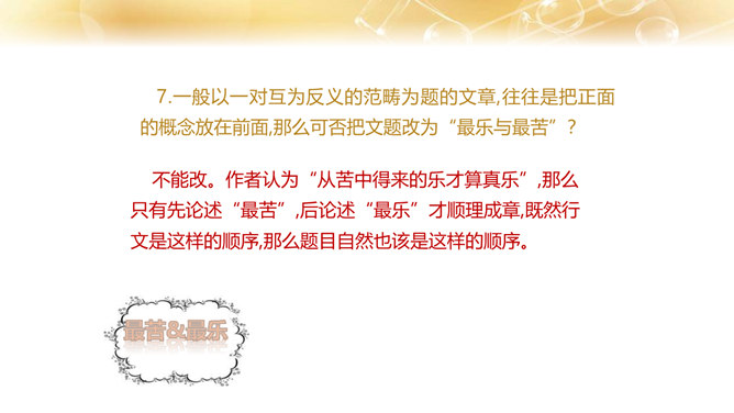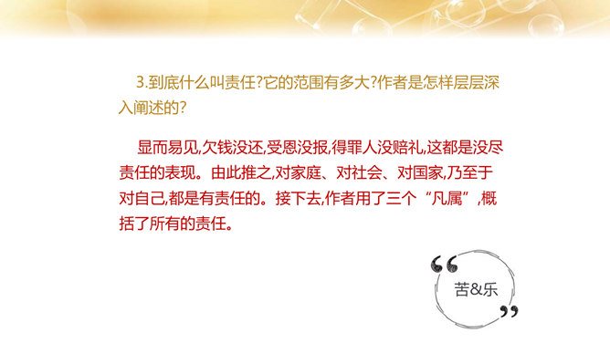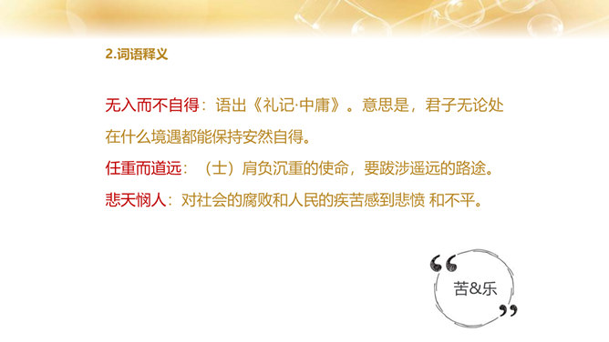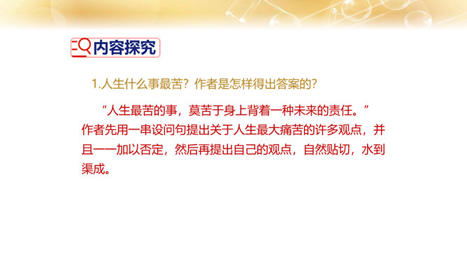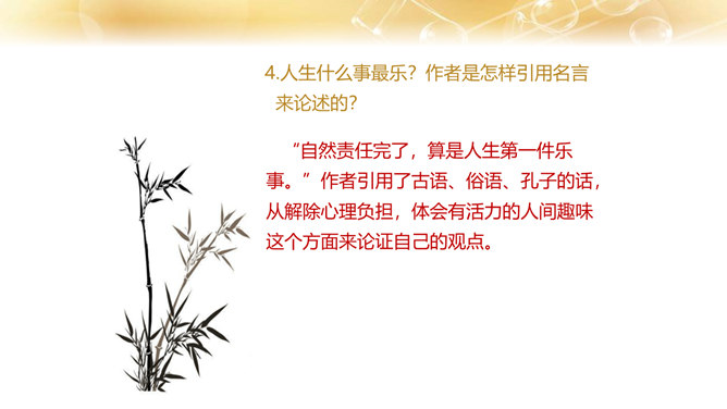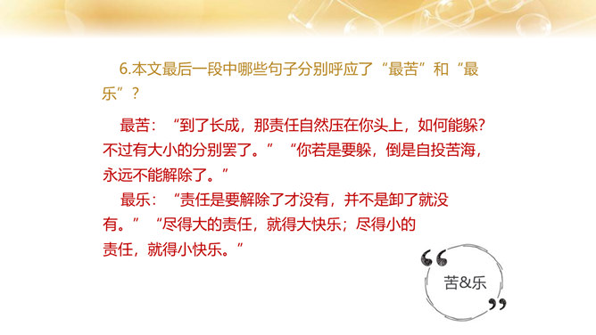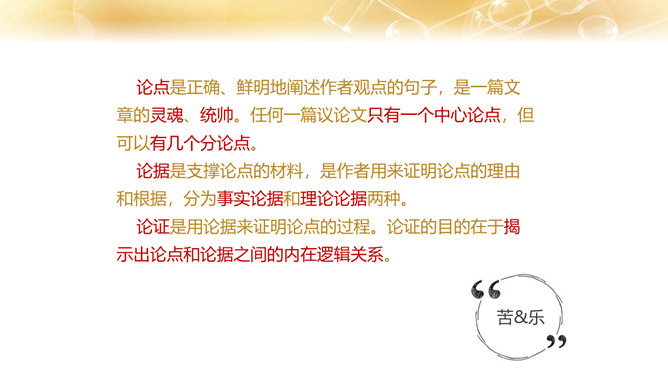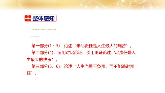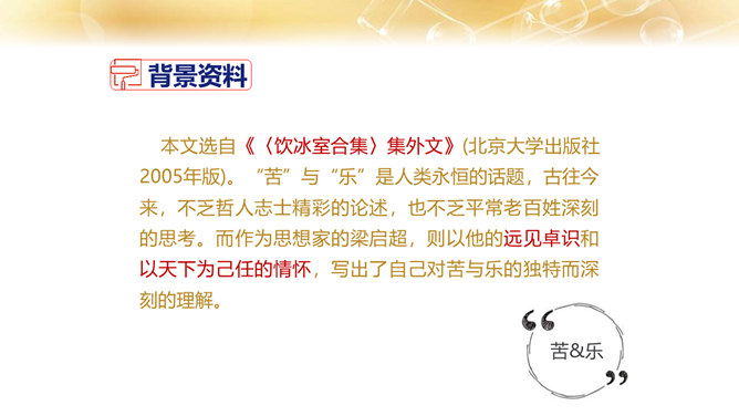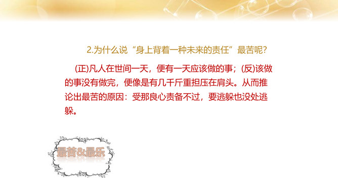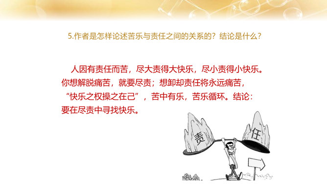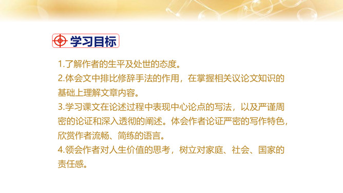 1.了解作者的生平及处世的态度。 2.体会文中排比修辞手法的作用,在掌握相关议论文知识的基础上理解文章内容。 3.学习课文在论述过程中表现中心论点的写法,以及严谨周密的论证和深入透彻的阐述。体会作者论证严密的写作特色,欣赏作者流畅、简练的语言。4.领会作者对人生价值的思考,树立对家庭、社会、国家的责任感。论点是正确、鲜明地阐述作者观点的句子,是一篇文章的灵魂、统帅。任何一篇议论文只有一个中心论点,但可以有几个分论点。论据是支撑论点的材料,是作者用来证明论点的理由和根据,分为事实论据和理论论据两种。所属专题:最苦与最乐ppt。