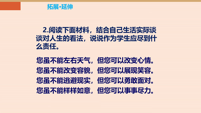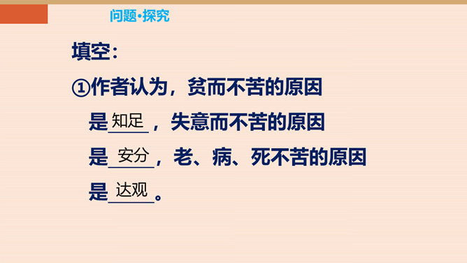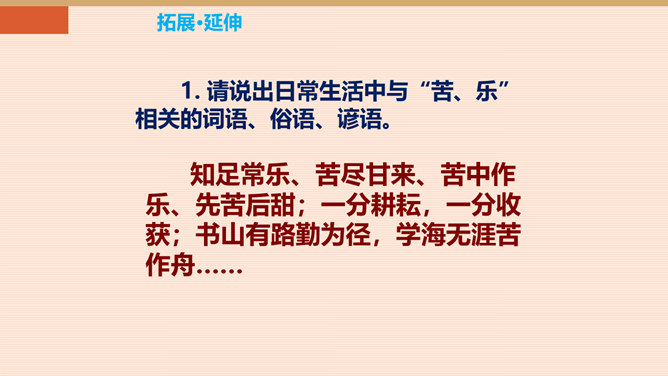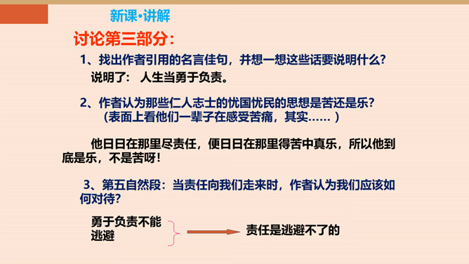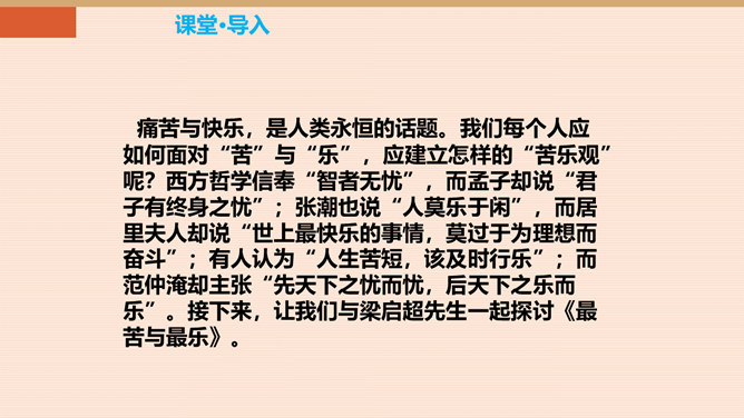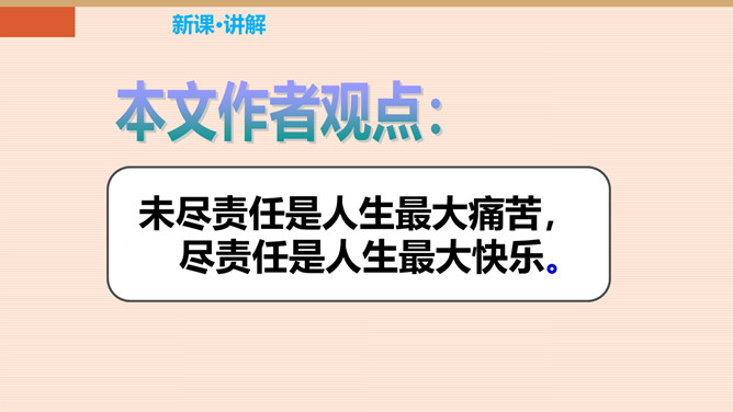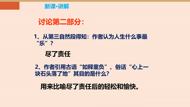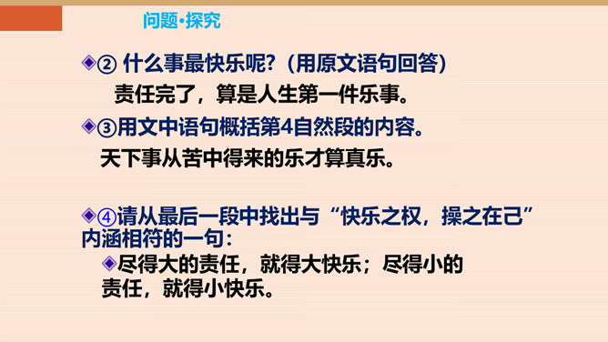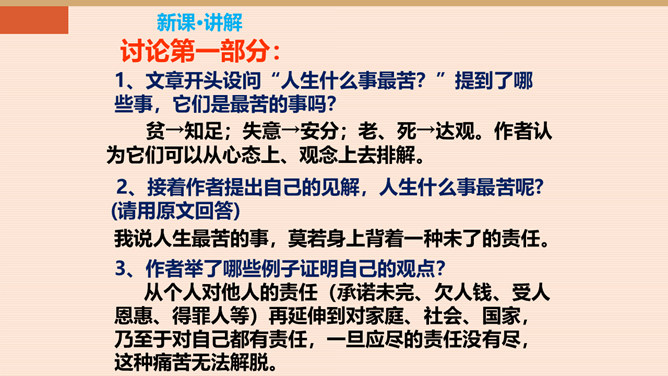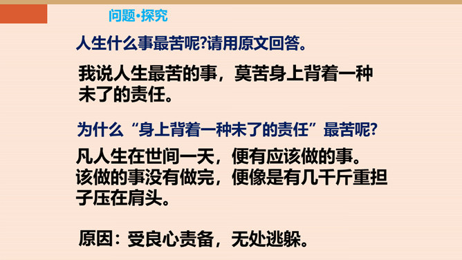 1、文章开头设问“人生什么事最苦?”提到了哪些事,它们是最苦的事吗?贫→知足;失意→安分;老、死→达观。作者认为它们可以从心态上、观念上去排解。2、接着作者提出自己的见解,人生什么事最苦呢? (请用原文回答)我说人生最苦的事,莫若身上背着一种未了的责任。3、作者举了哪些例子证明自己的观点?从个人对他人的责任(承诺未完、欠人钱、受人恩惠、得罪人等)再延伸到对家庭、社会、国家,乃至于对自己都有责任,一旦应尽的责任没有尽,这种痛苦无法解脱。所属专题:最苦与最乐ppt。