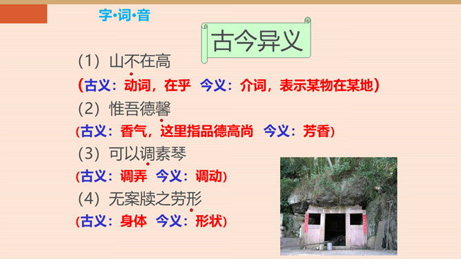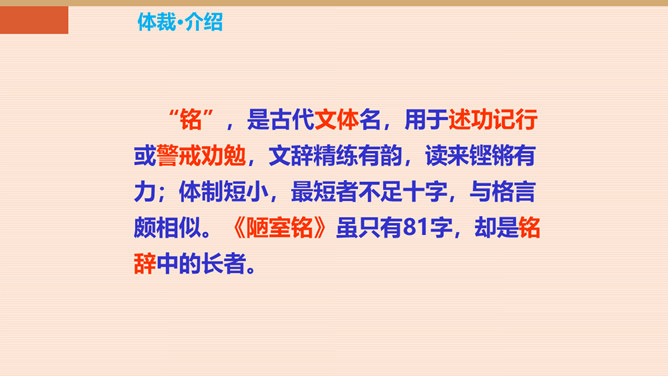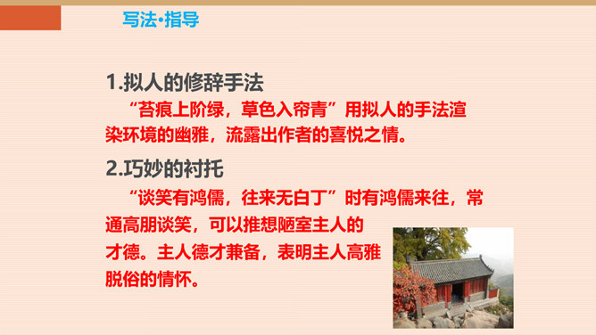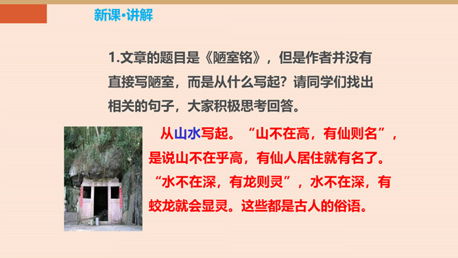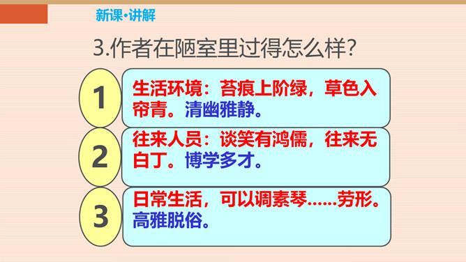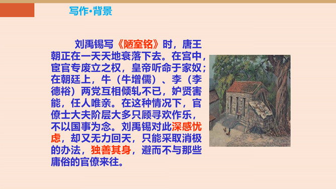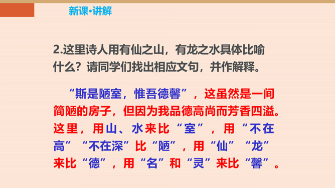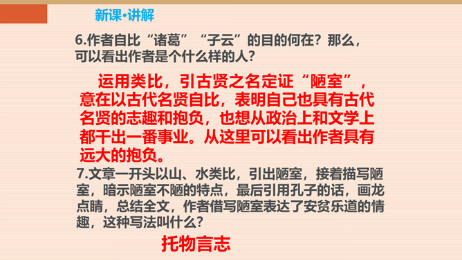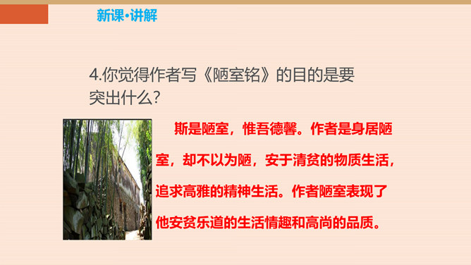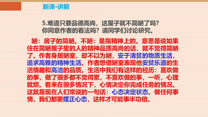 难道只要品德高尚,这屋子就不简陋了吗?你同意作者的看法吗?请同学们讨论研究。陋:房子的简陋。不陋:是指精神上的。意思是说如果住在简陋屋子里的人的精神品质高尚的话,就不觉得简陋了。作者身居陋室,却不以为陋,安于清贫的物质生活,追求高雅的精神生活。作者想借陋室表现他安贫乐道的生活情趣和高洁的品质。生活中我们有这样的经历:喜欢做的事,做了很多都不觉得累,不喜欢做的事,一听,心理就烦。看来在很多情况下,心情决定你完成任务的情况。这就是现在人们常说的一句话:心态决定状态。所属专题:陋室铭ppt。