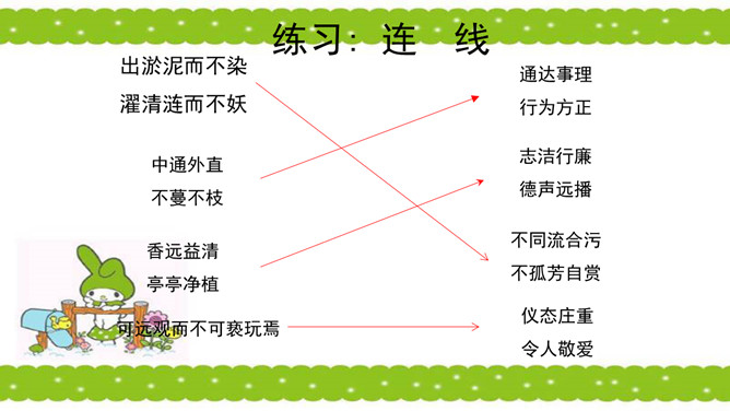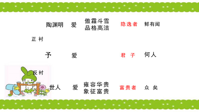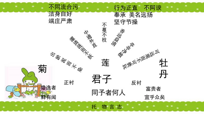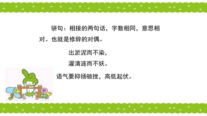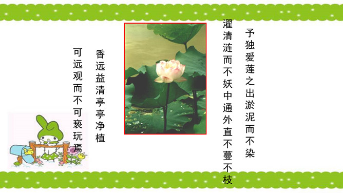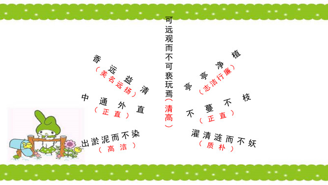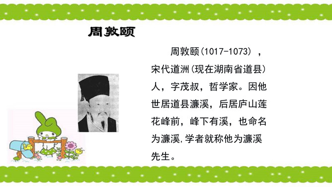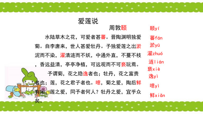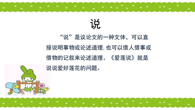 骈句:相接的两句话,字数相同,意思相对。也就是修辞的对偶。语气要抑扬顿挫,高低起伏。周敦颐(1017-1073) ,宋代道洲(现在湖南省道县)人,字茂叔,哲学家。因他世居道县濂溪,后居庐山莲花峰前,峰下有溪,也命名为濂溪,学者就称他为濂溪先生。“说”是议论文的一种文体,可以直接说明事物或论述道理,也可以借人借事或借物的记叙来论述道理。所属专题:爱莲说ppt。